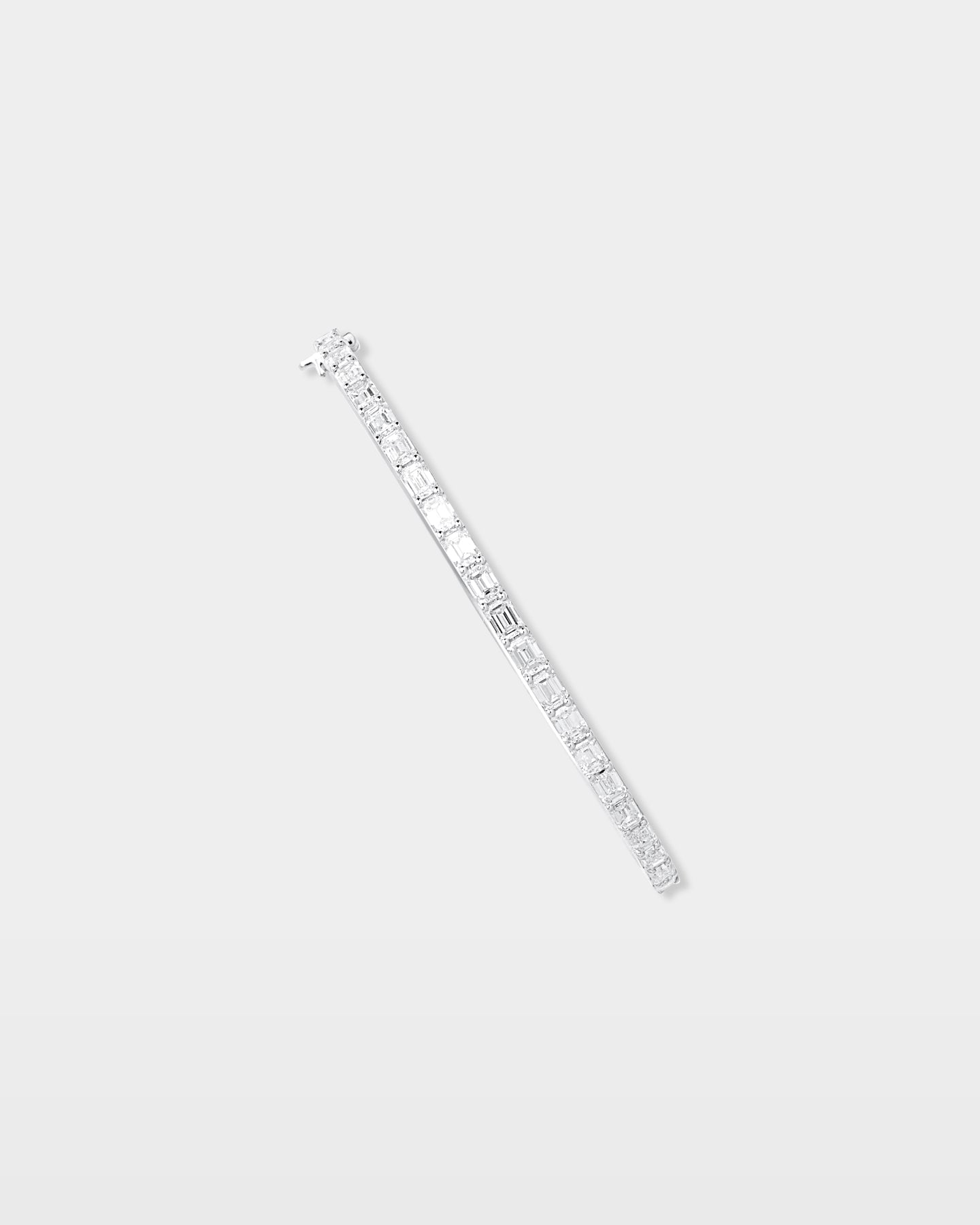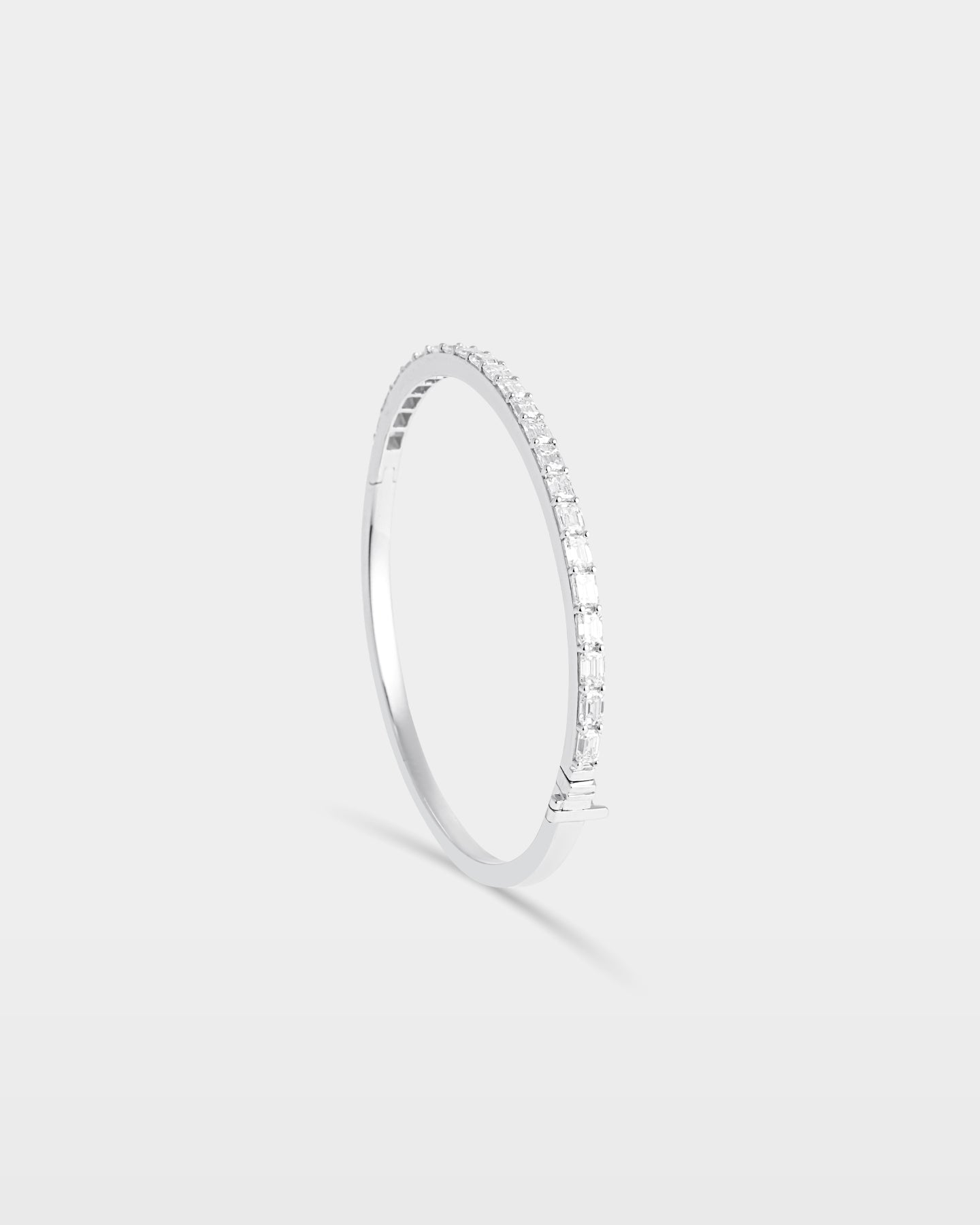 This half-eternity 14k gold bangle highlights the clean geometry of emerald cut diamonds, offering a refined take on wrist layering. Its understated form lets you style it next to pavé pieces, hoop earrings or your go-to pendant. Light enough for everyday and striking enough for special occasions.