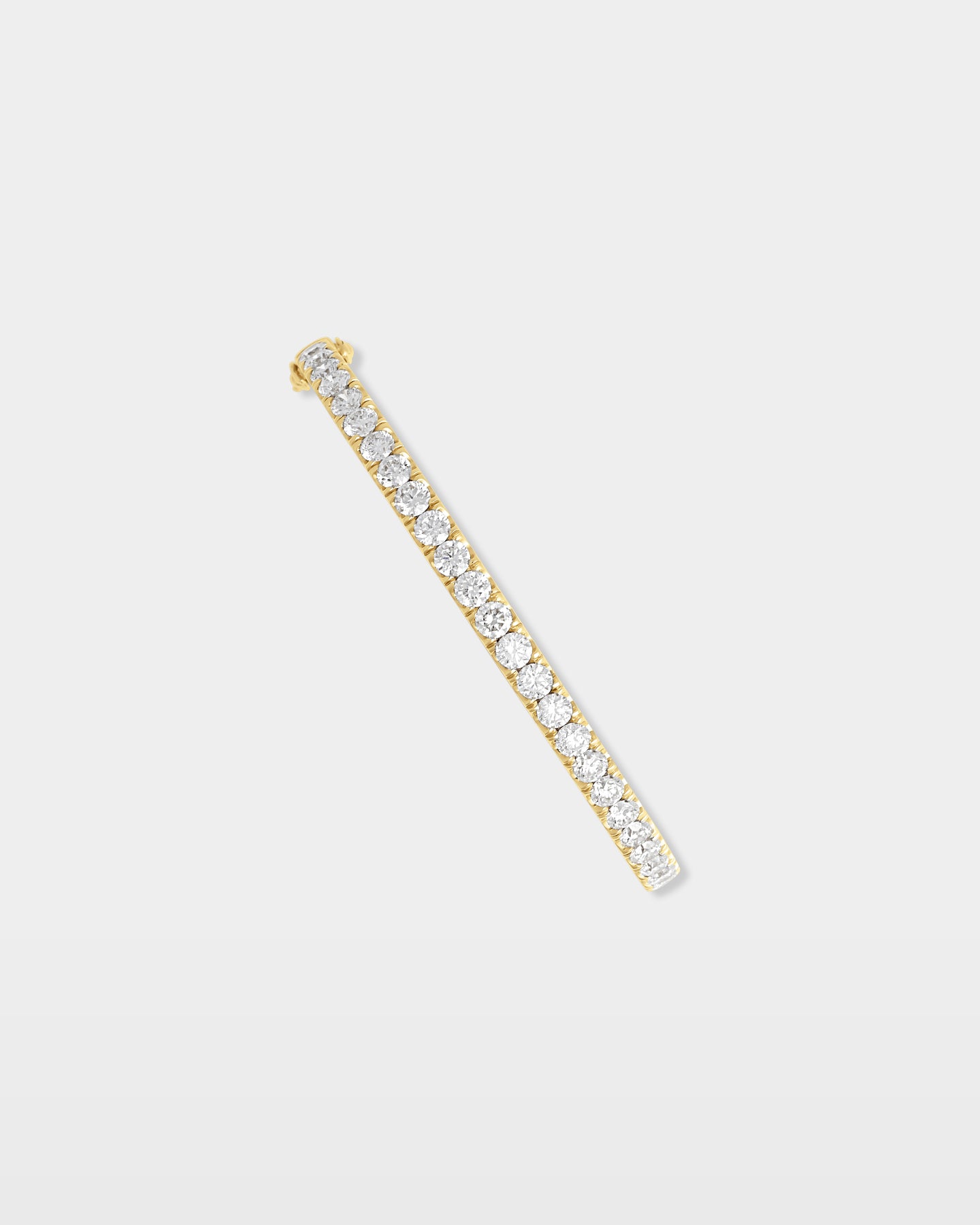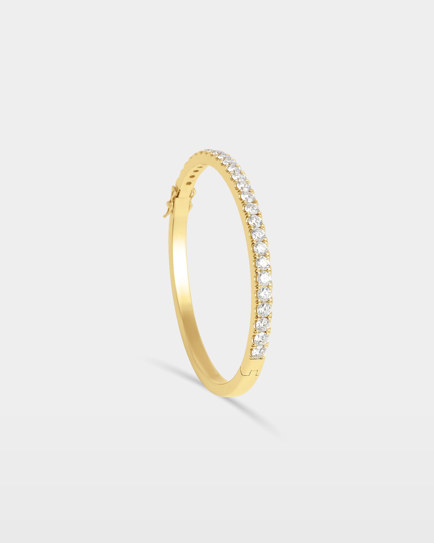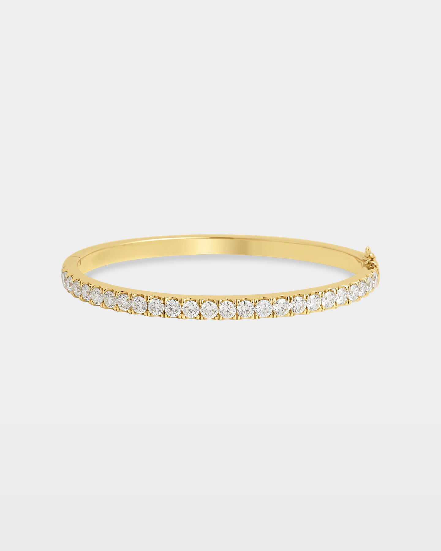 A strand of 5.02cts of round diamonds curves across the top of this 18k yellow gold bangle, offering a look that reads both minimal and generous. Its slim silhouette makes it an easy addition beside beaded bracelets, diamond necklaces or your go-to watch. Subtle enough for daytime and elevated enough for evenings out.