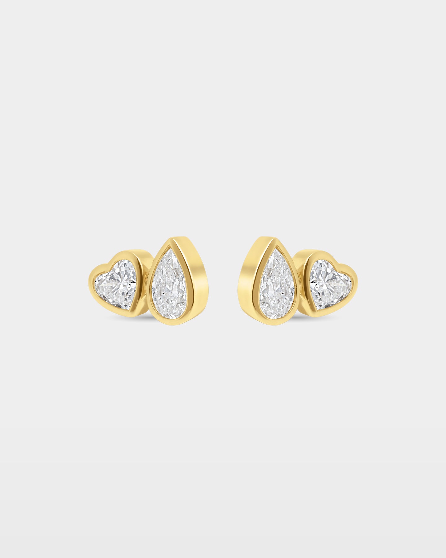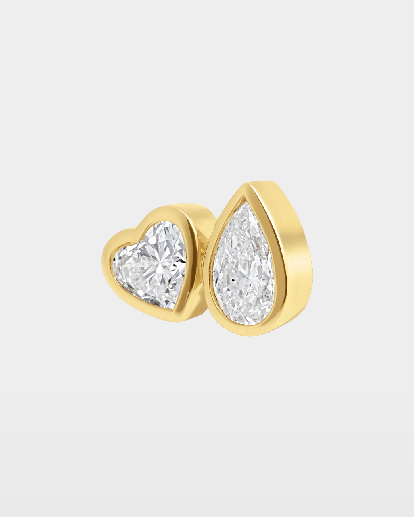 A heart silhouette meets a pear cut diamond in this bezel-set diamond stud set that feels playful but still refined. The yellow gold outline keeps the look grounded and works with both minimal and layered jewelry styling. They bring a soft sparkle to work days, weekend plans and anything in between.