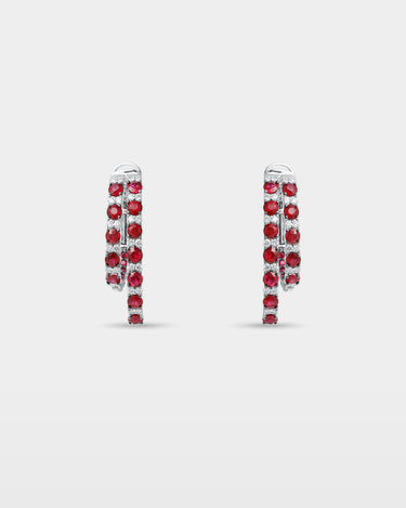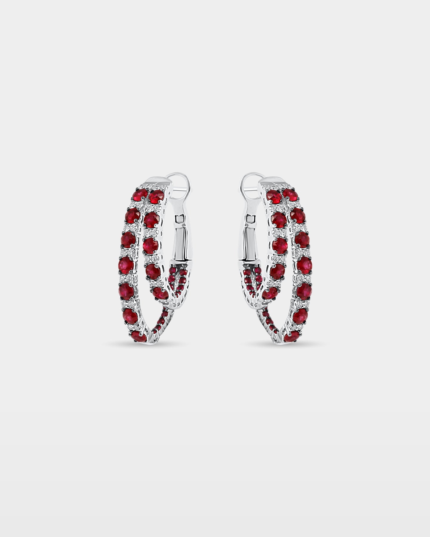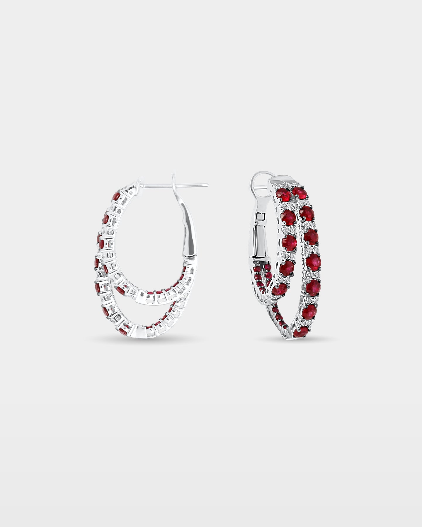 These 18k gold hoops blend rich ruby tones with diamond shine, creating a look that confident and easy to style. The uneven double row gives them a more dimensional feel, making them a great partner to ear cuffs or a sleek pendant necklace. Wear them to dinner, a weekend event or just to add something fun to a basic tee.