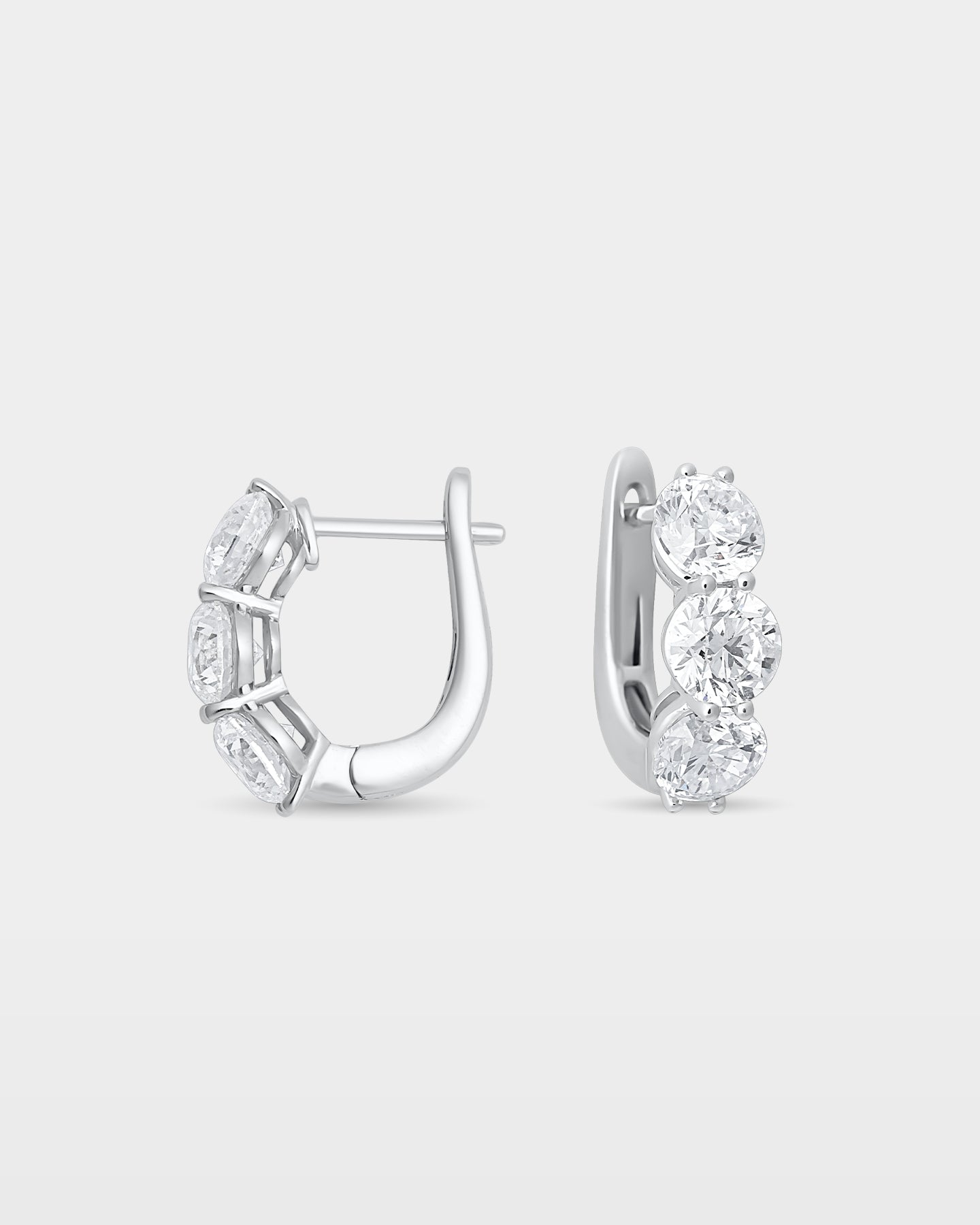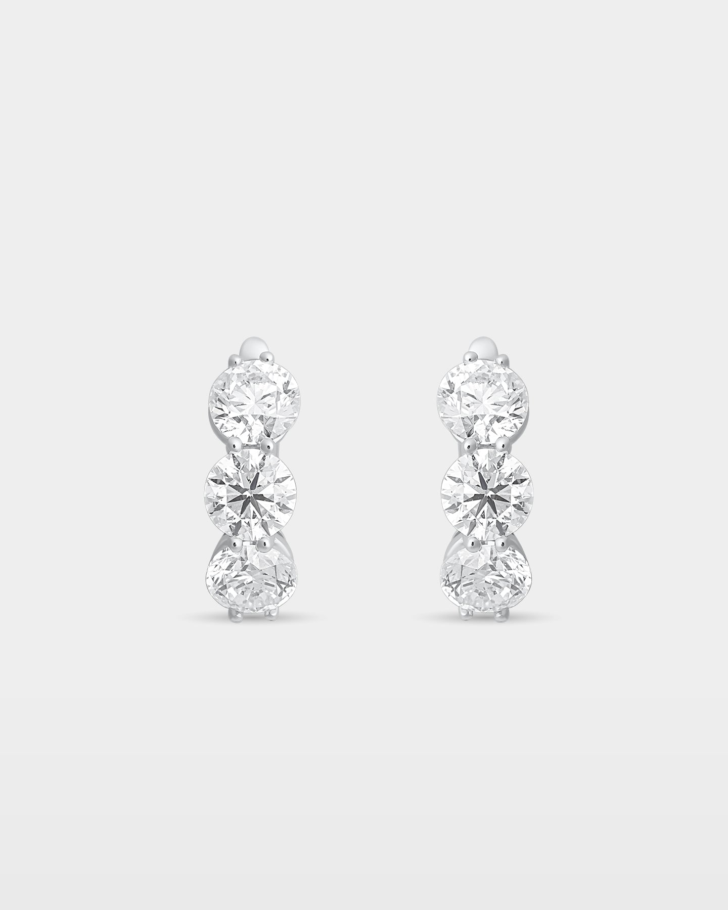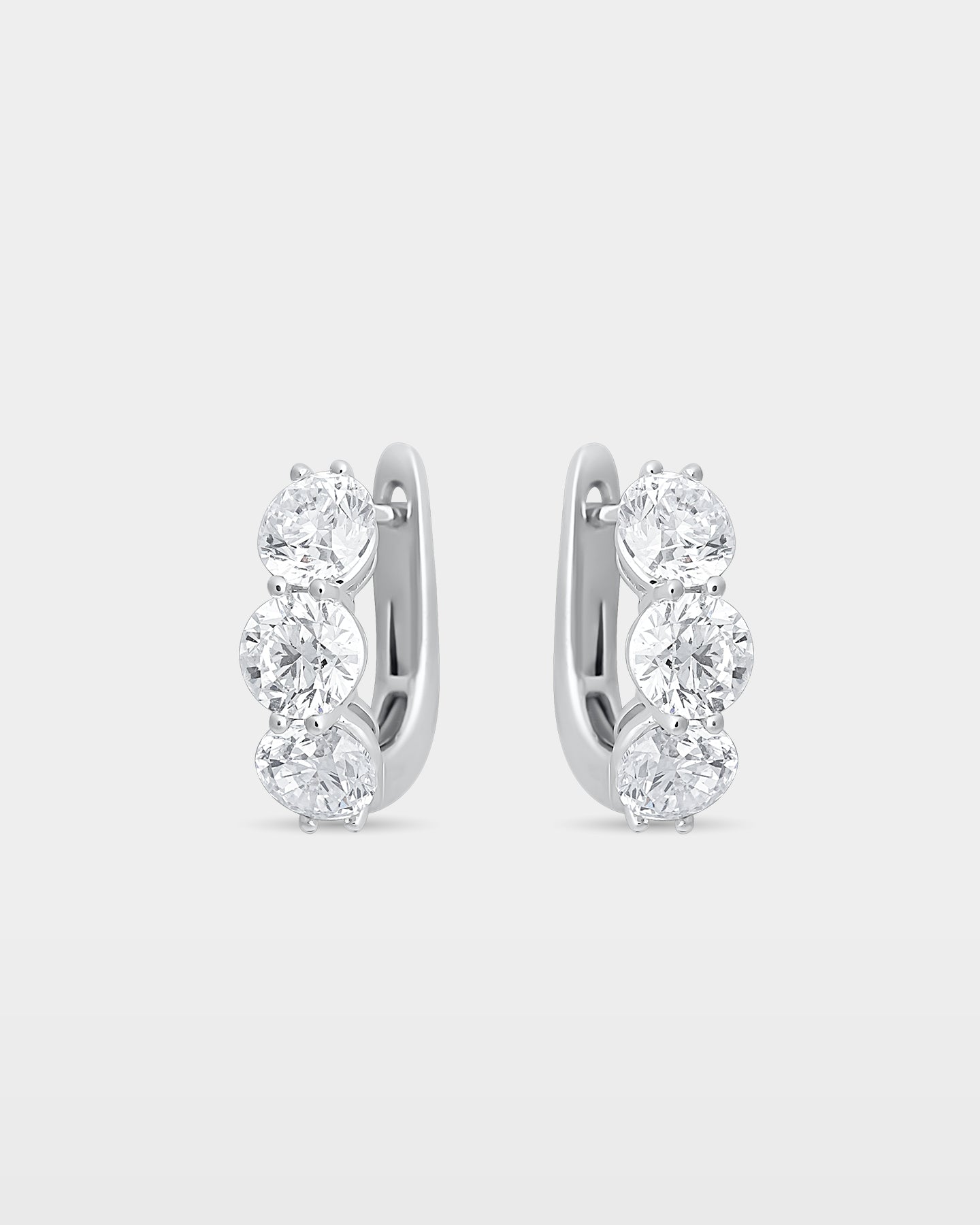 Simple but impactful, these white gold huggies feature three round diamonds that catch light in a clean, symmetrical way. Pair them with chain bracelets, diamond necklaces, or even simple studs for a balanced mix. They elevate casual outfits and still hold their own in dressier settings.