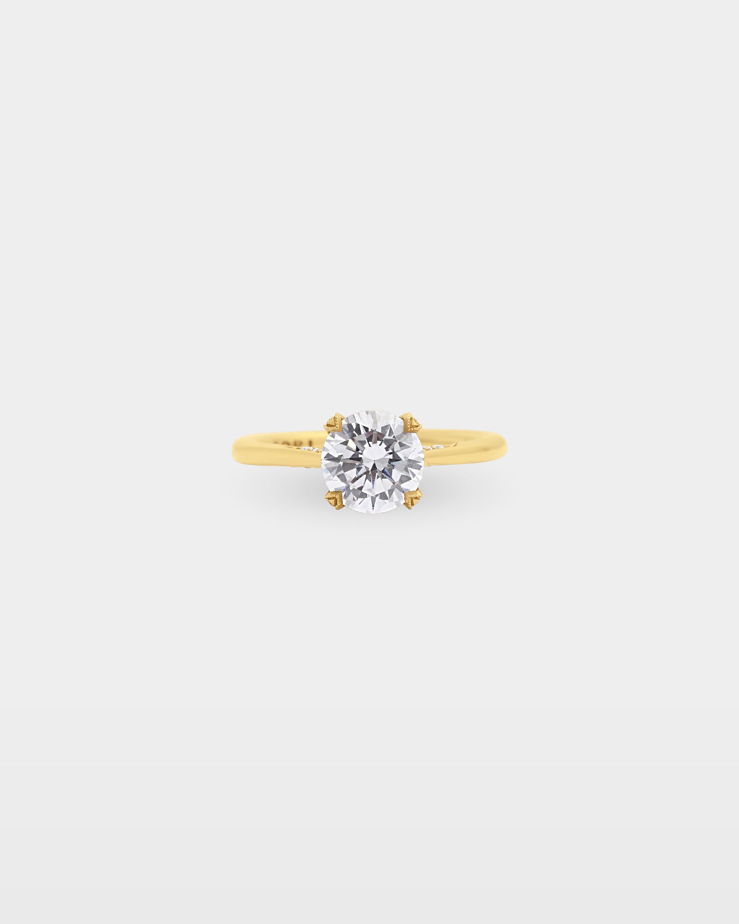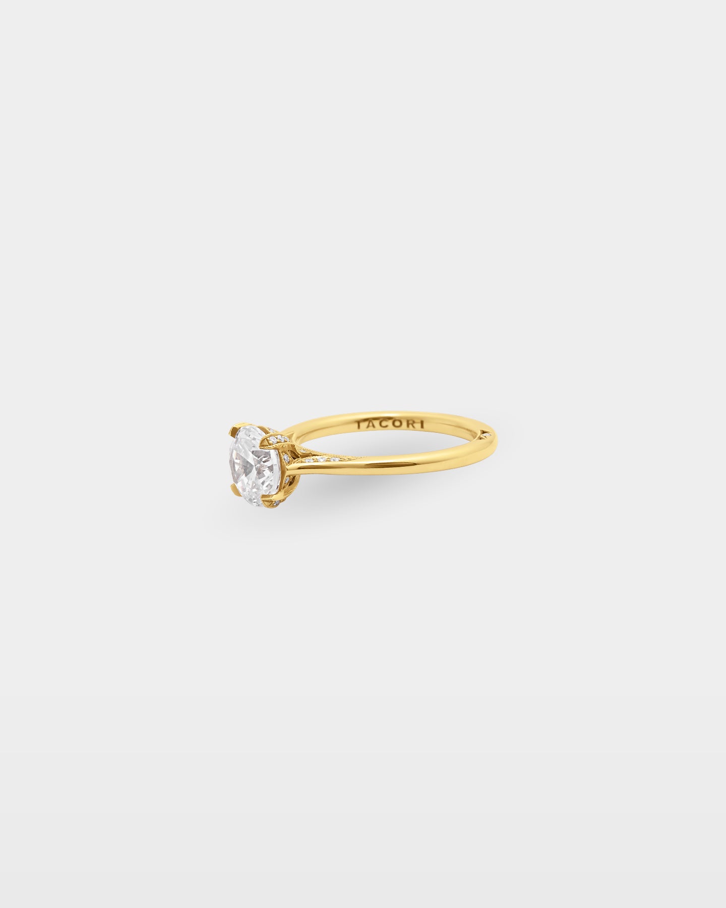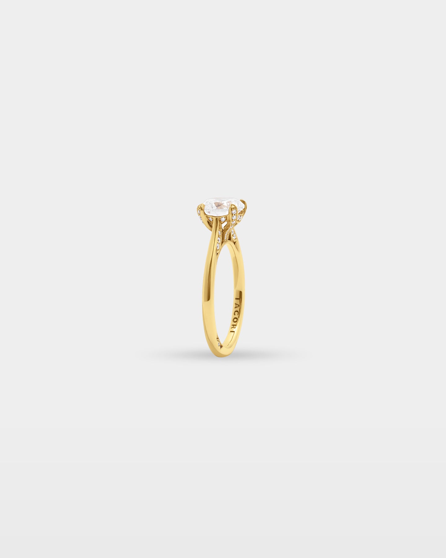 The Simply Tacori 2678RD was built around restraint. A slim 18k yellow gold band tapers to a cathedral foundation where crescent silhouette windows and diamond-accented prongs carry 0.18 carats of G, VS detail at the crown, with milgrain and the Simply Tacori crescent inner face finishing what the band deliberately leaves open. The kind of engagement ring someone chooses because subtlety was never a compromise.