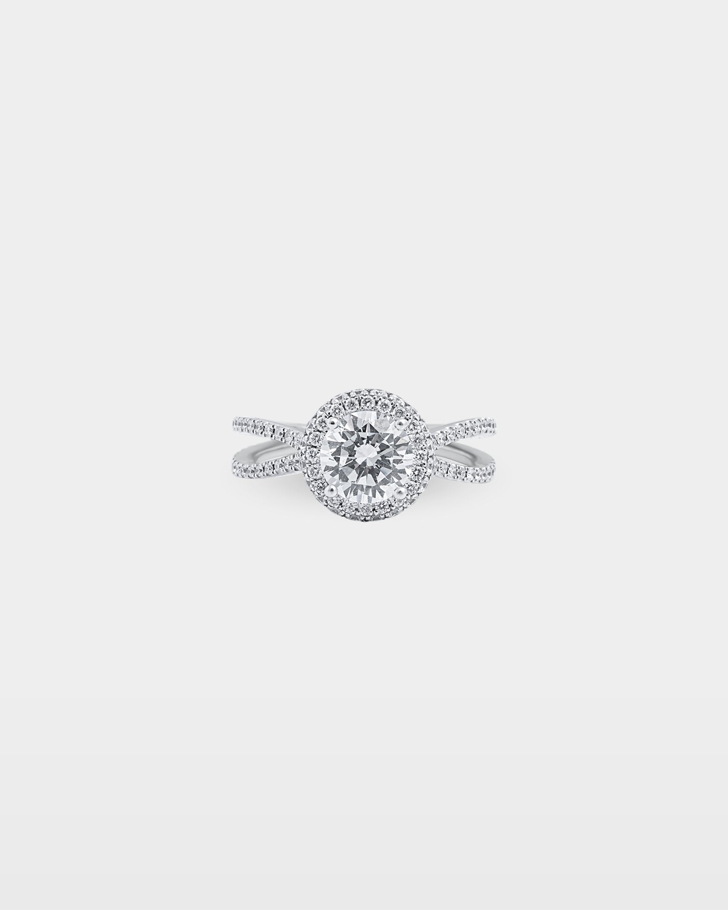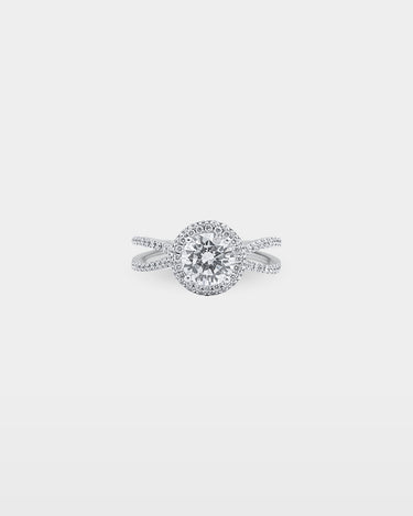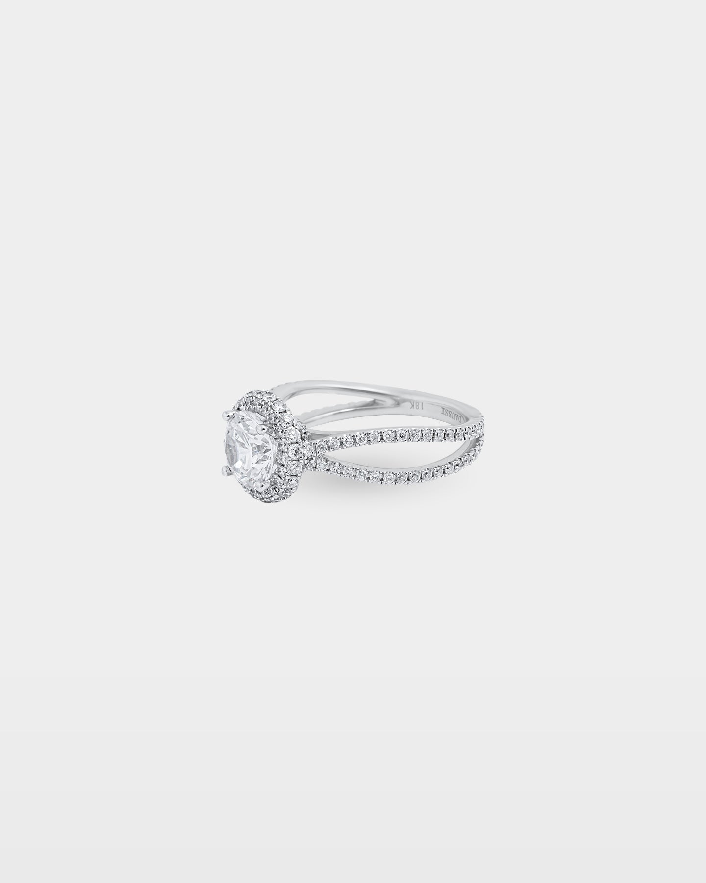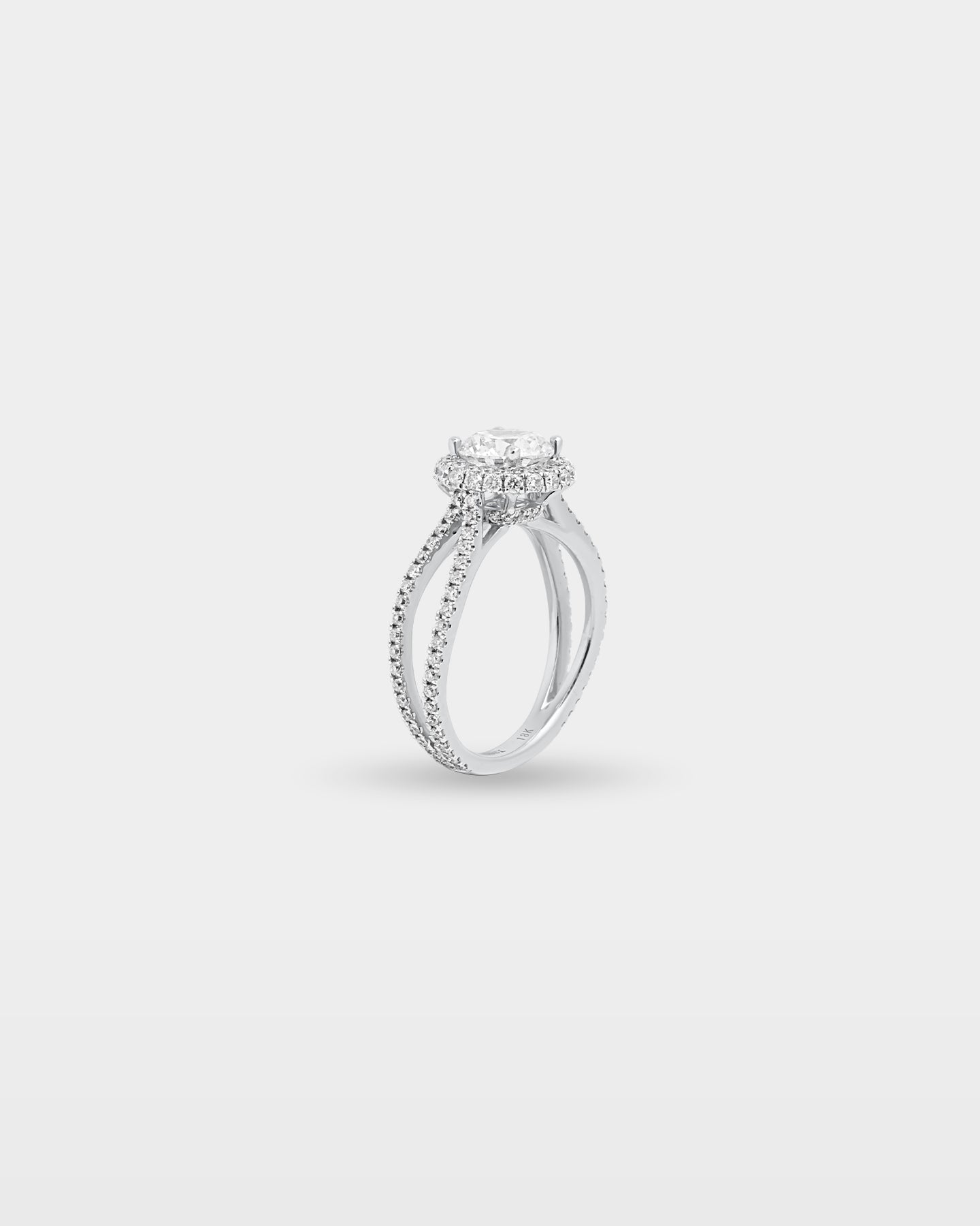 The split shank on this 18K white gold setting separates just below the halo, each strand set with pavé diamonds that carry the brilliance down the finger. The round brilliant center sits high within its diamond halo, the elevated profile visible from the side and flattering against the hand. At 0.72 carats of accent stones, the setting holds its own before the center stone is even chosen.