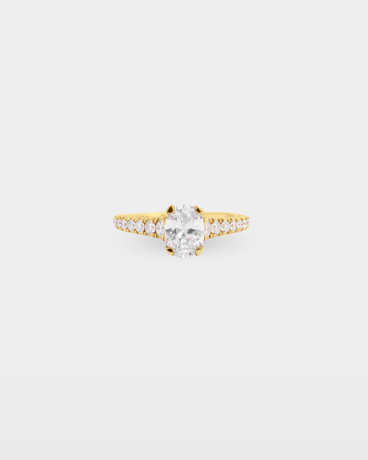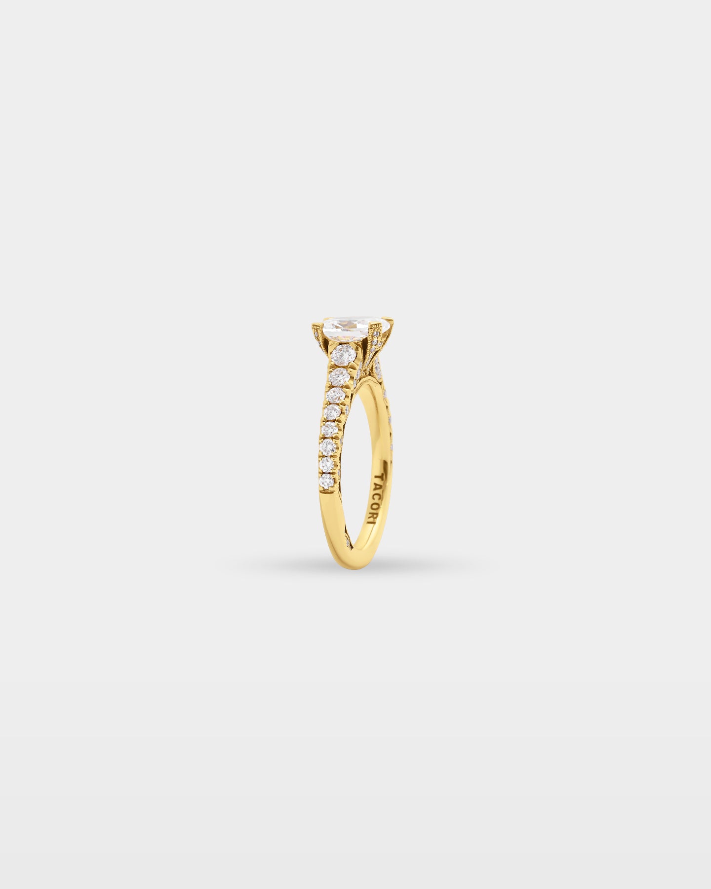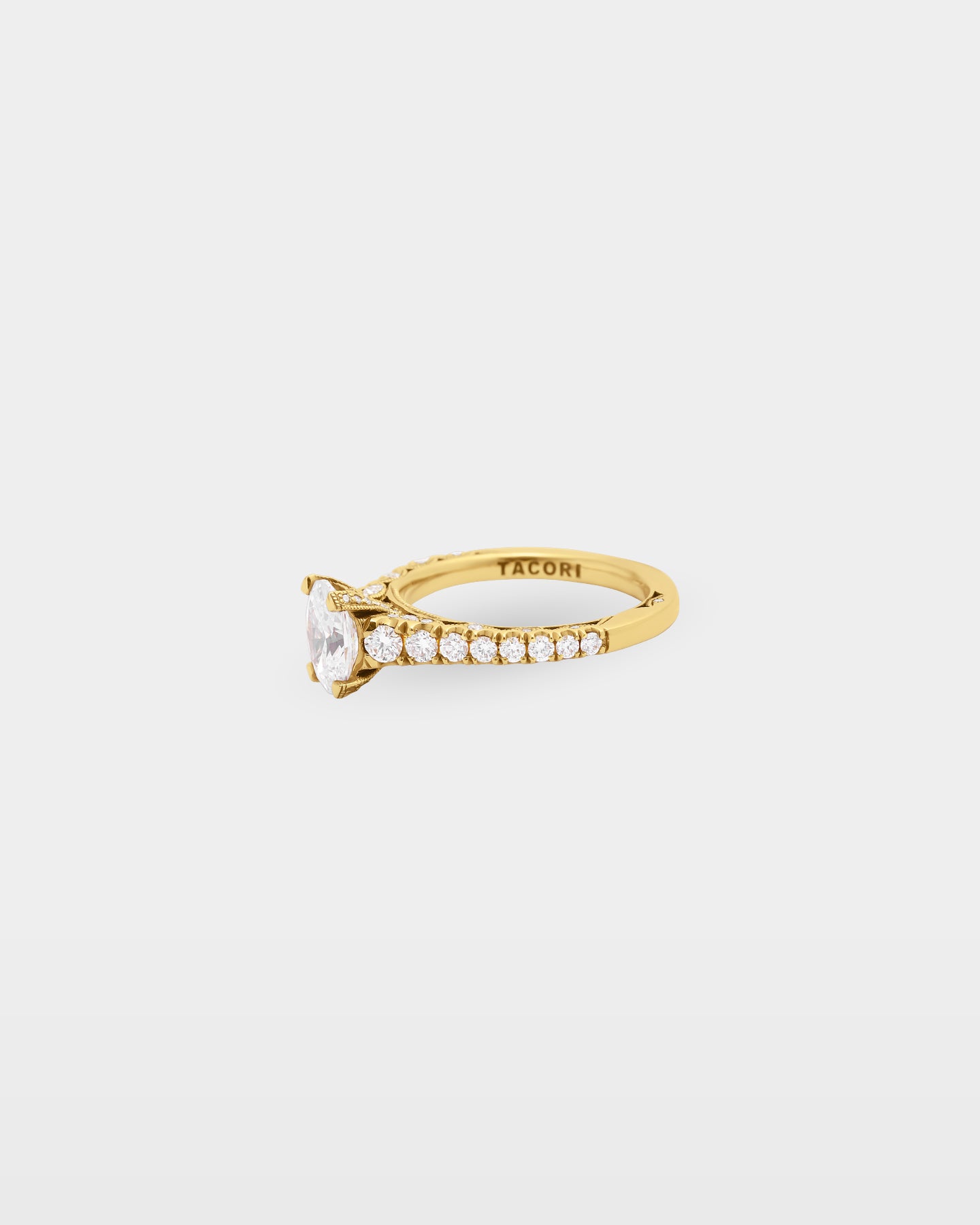 The Tacori HT2579OV is an 18k yellow gold oval diamond engagement ring from the Petite Crescent collection, with graduating G, VS diamonds running the full cathedral band in increasing size toward the crown. A hidden bloom sits beneath the oval center stone and the inner face carries Tacori's interlocking arc detail throughout. For an oval buyer who wants the band and the stone to feel equally considered.