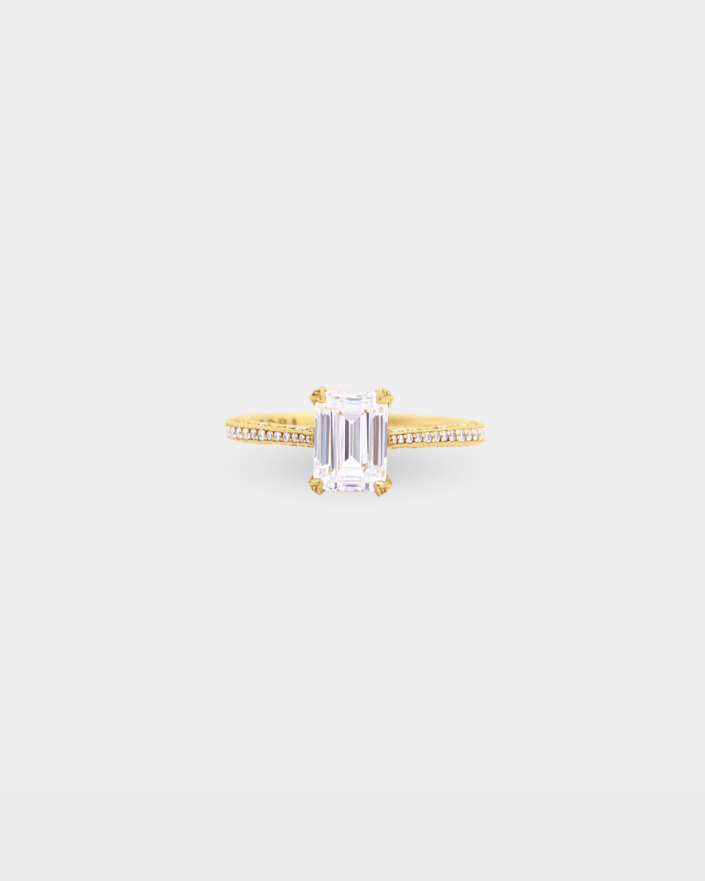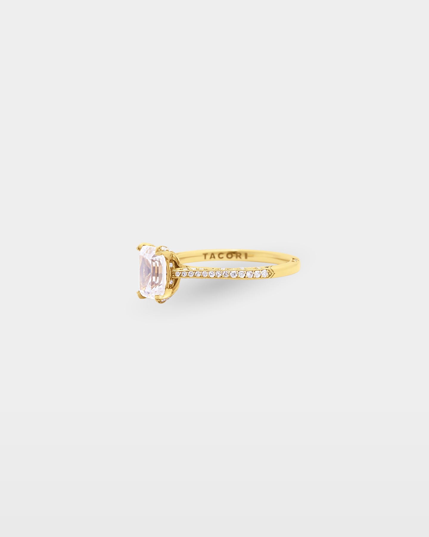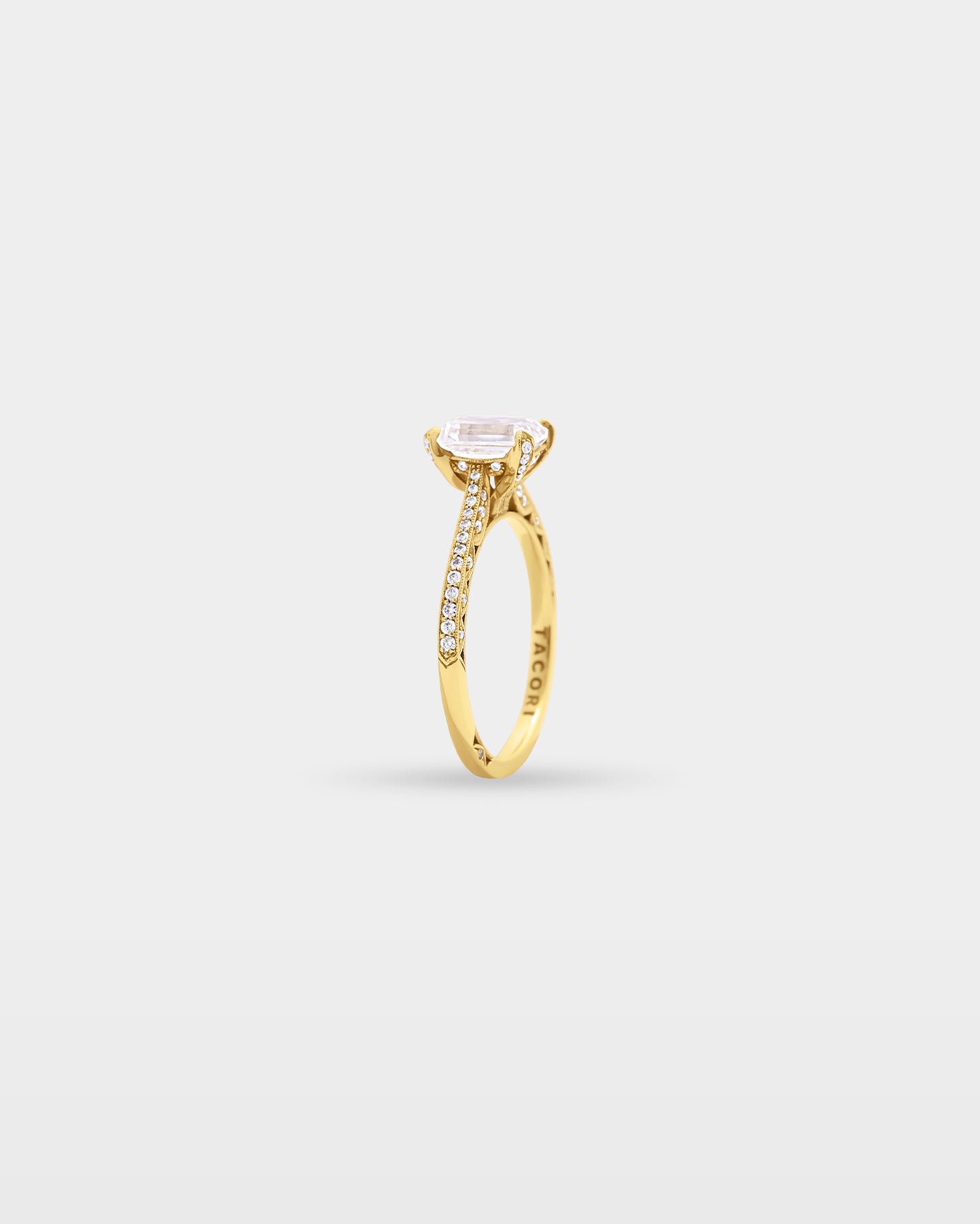 An 18k yellow gold designed specifically for the emerald cut, with a slim pavé ceiling band carrying 0.33 carats of G, VS diamonds toward a clean four-prong crown on a cathedral foundation. The Sculpted Crescent inner face carries Tacori's modern reimagining of the crescent signature, creating windows of light along the band interior. A emerald-cut diamond engagement ring that gets the balance between restraint and craft exactly right.