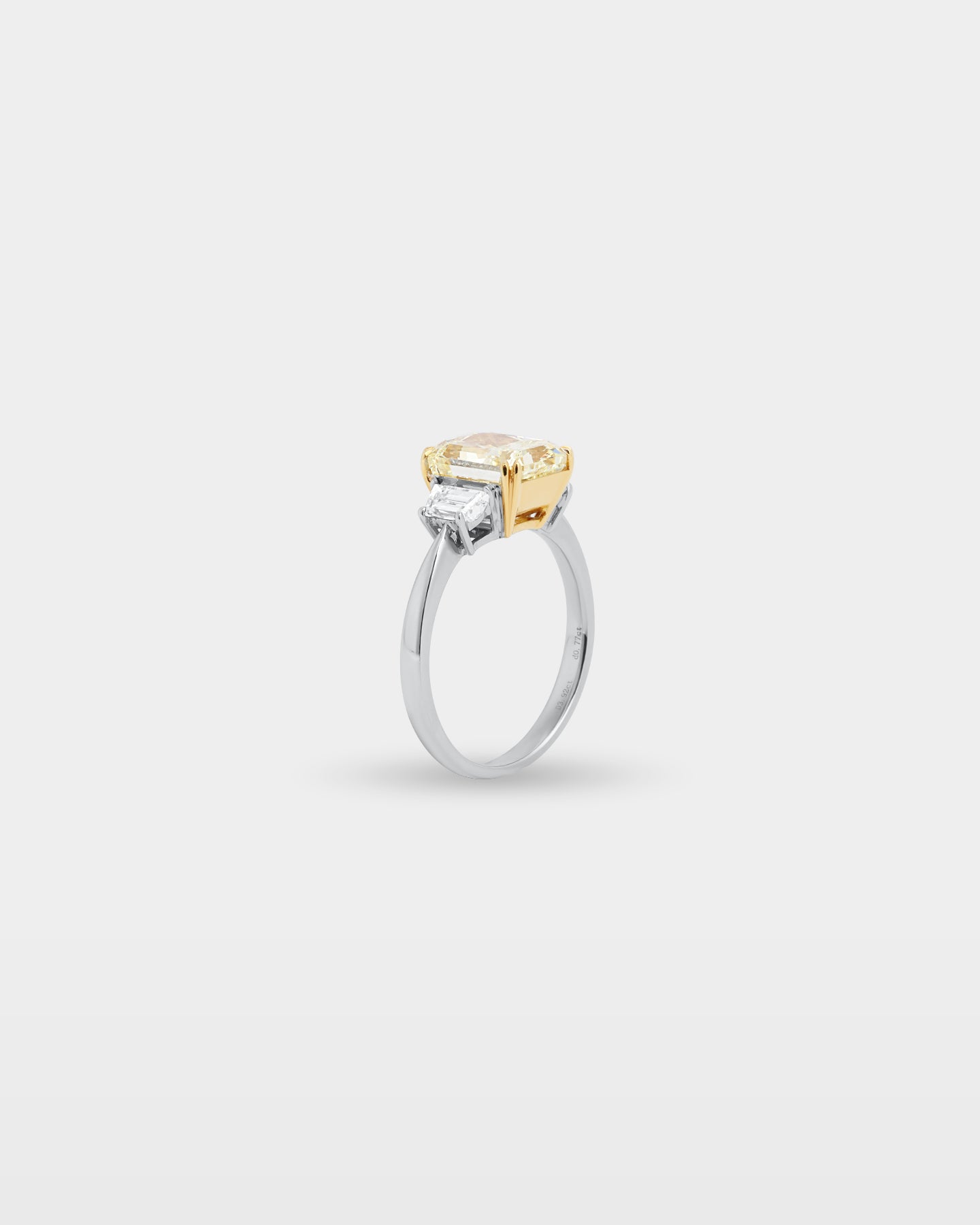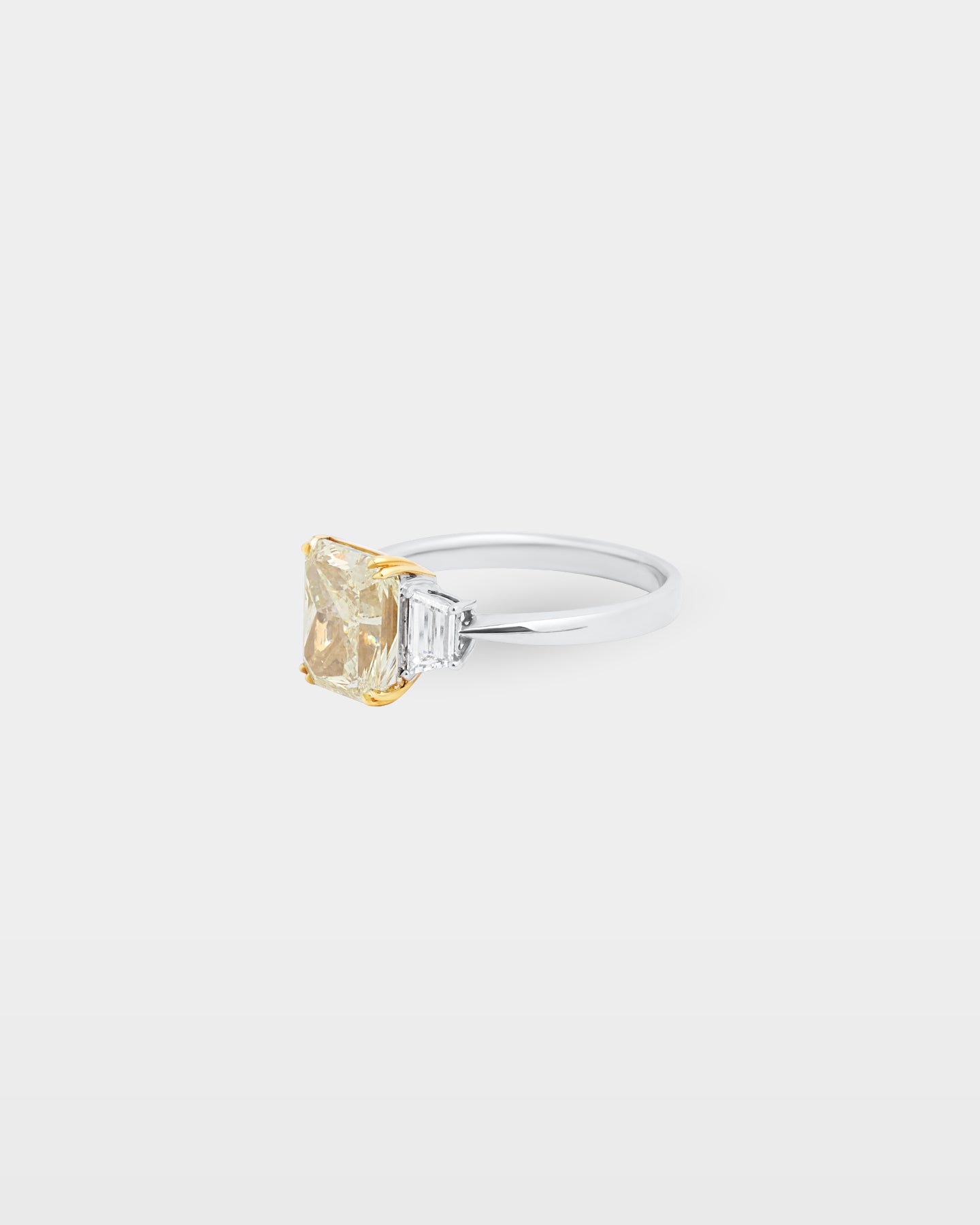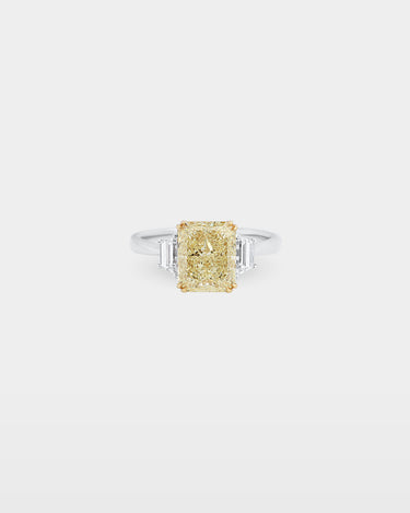 Three stones in two metals, a gold collet holds the 3.91ct yellow radiant cut diamond center while 18K white gold carries the shank and the two flanking trapezoid side stones. The step-cut faceting on the side stones keeps the eye moving toward the radiant at the crown. A color-forward engagement ring that wears as well on a random weekday as it does on the wedding day.