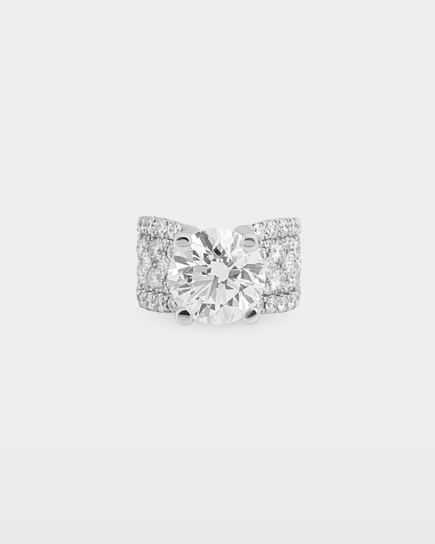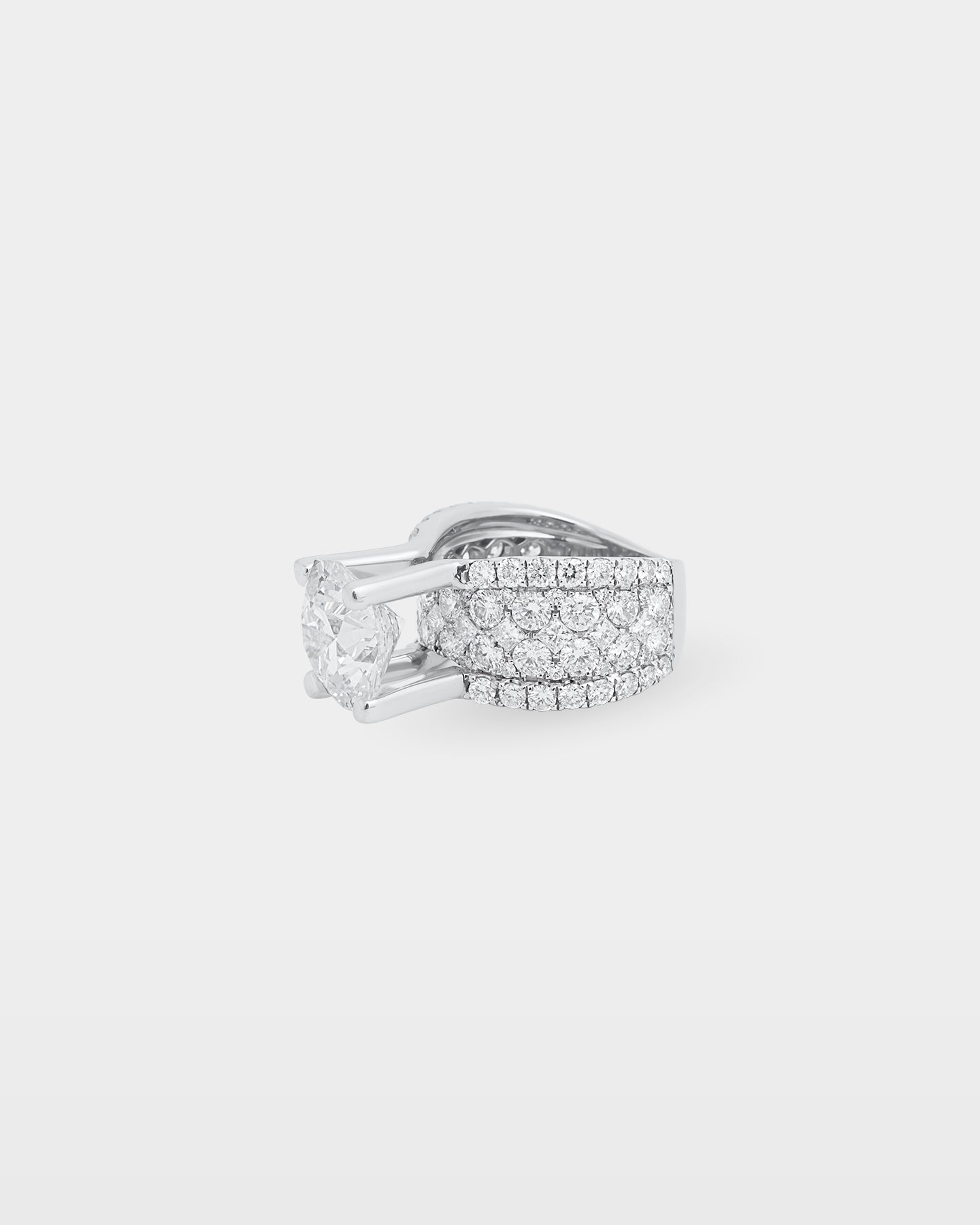 The center stone here is 5.00 carats, but the band earns equal attention. Three rows of round brilliant diamonds arc across the full domed width of the 18K white gold shank, 7.00 carats of accent stones building toward the elevated four-prong basket at the crown. A diamond engagement ring that was never meant to go unnoticed.