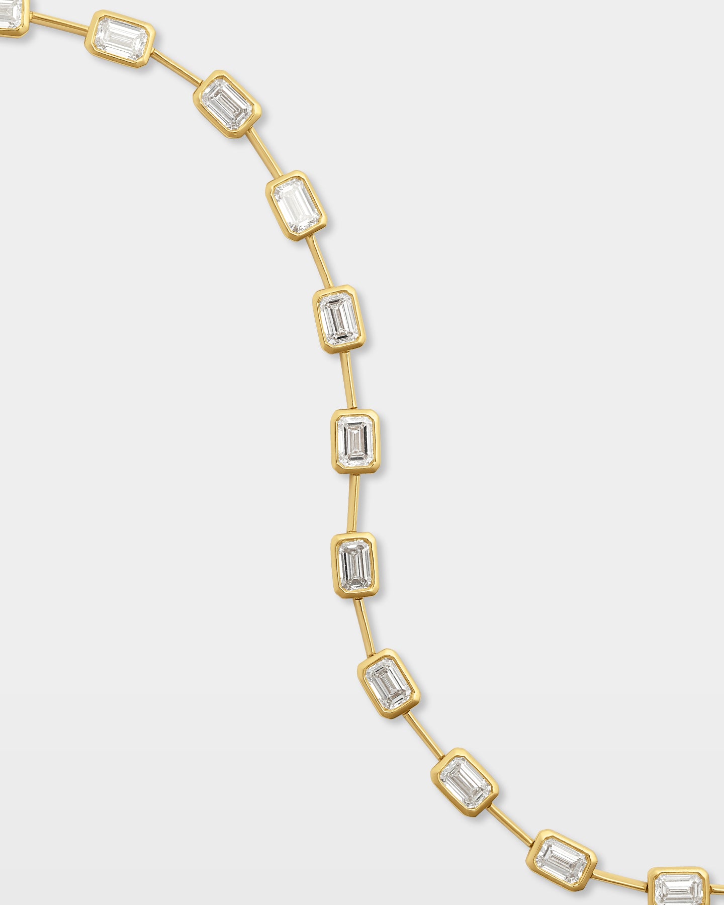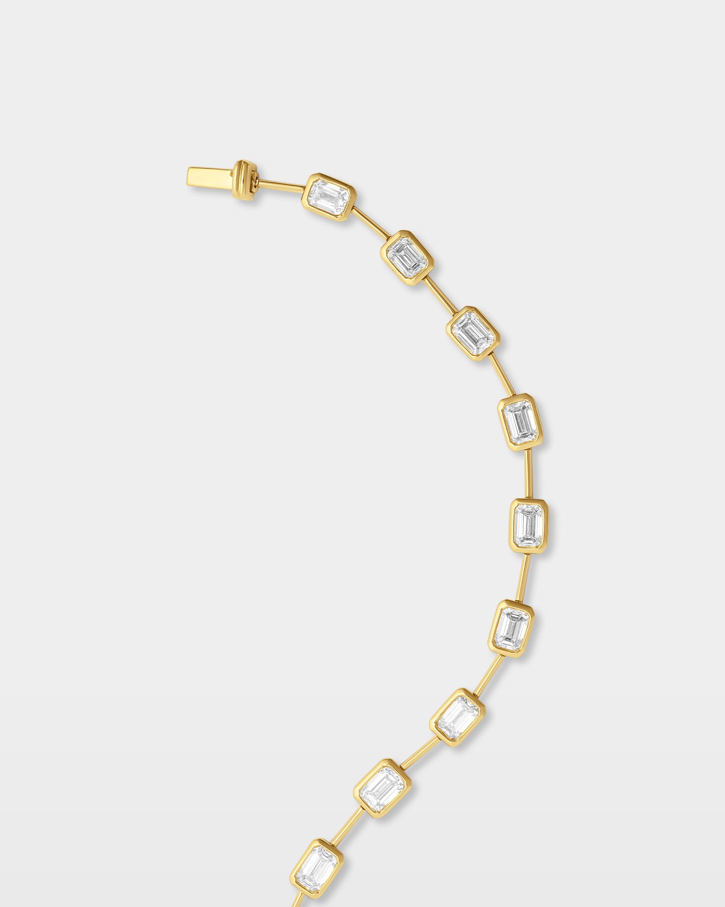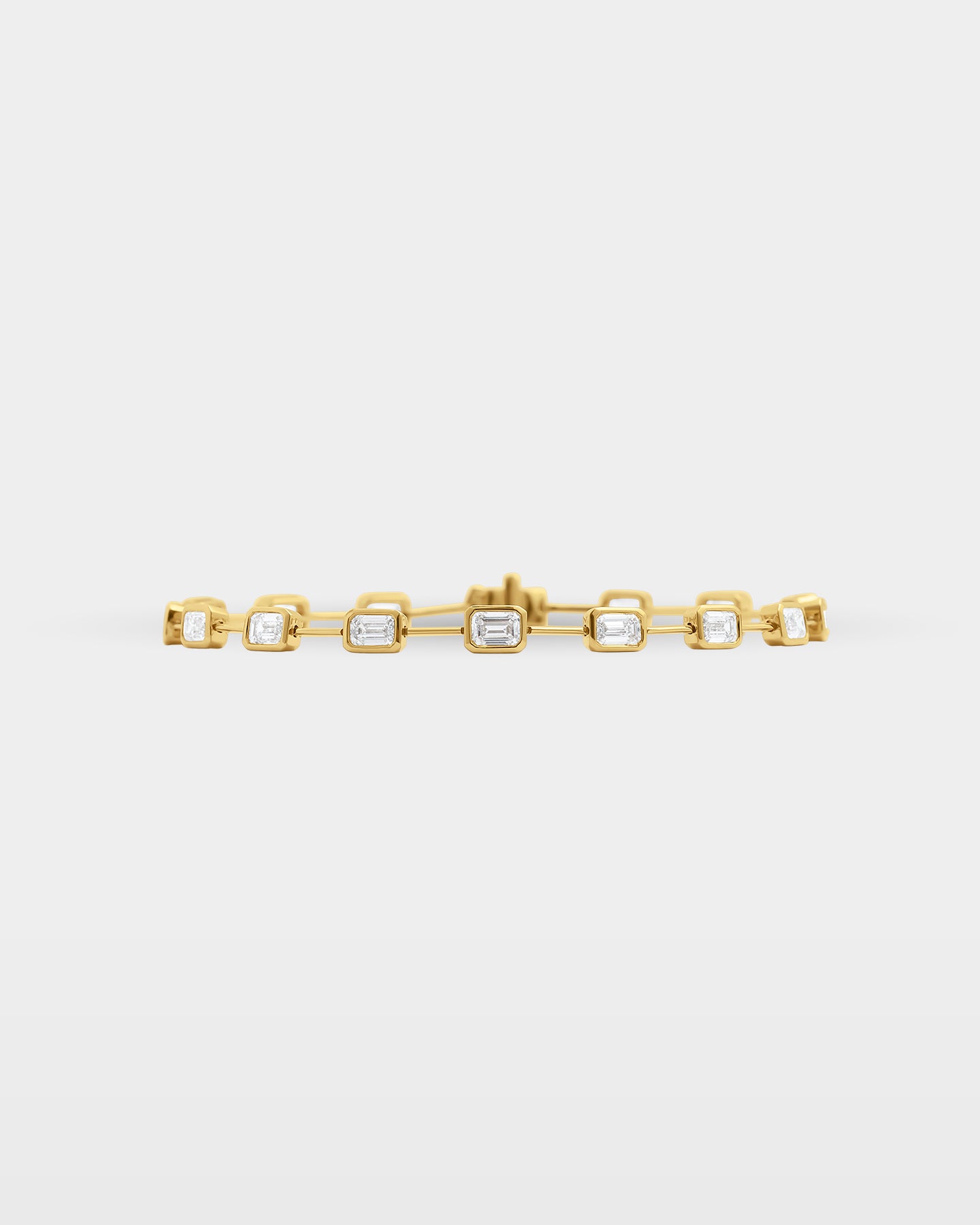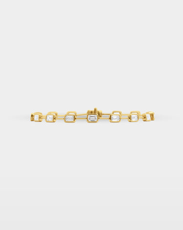 Each diamond is bezel-set in rich yellow gold, giving the bracelet a clean rhythm. It layers naturally with hoop earrings, small gold chains, or a tennis necklace when you want a coordinated look. This 18k yellow gold diamond bracelet works for everything from office days to late-night plans.