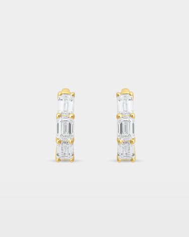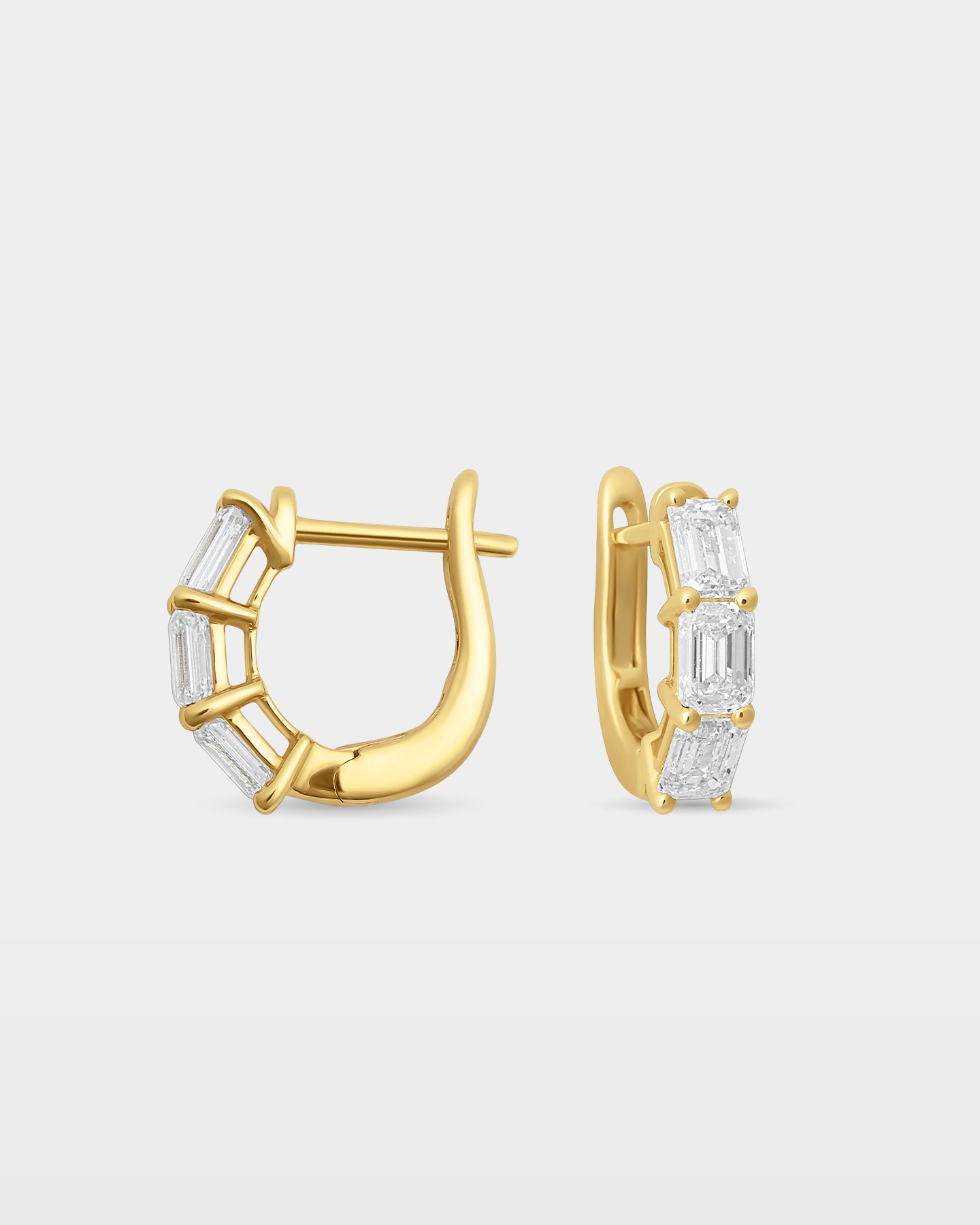 With three emerald cut diamonds set in warm yellow gold, these huggies bring a subtle but confident shine. They’re the perfect upgrade for anyone who likes sleek pieces that slide effortlessly into their everyday rotation. Create a layered ear stack with cartilage earrings, cuffs, or your favorite diamond studs so the whole look feels more intentional.