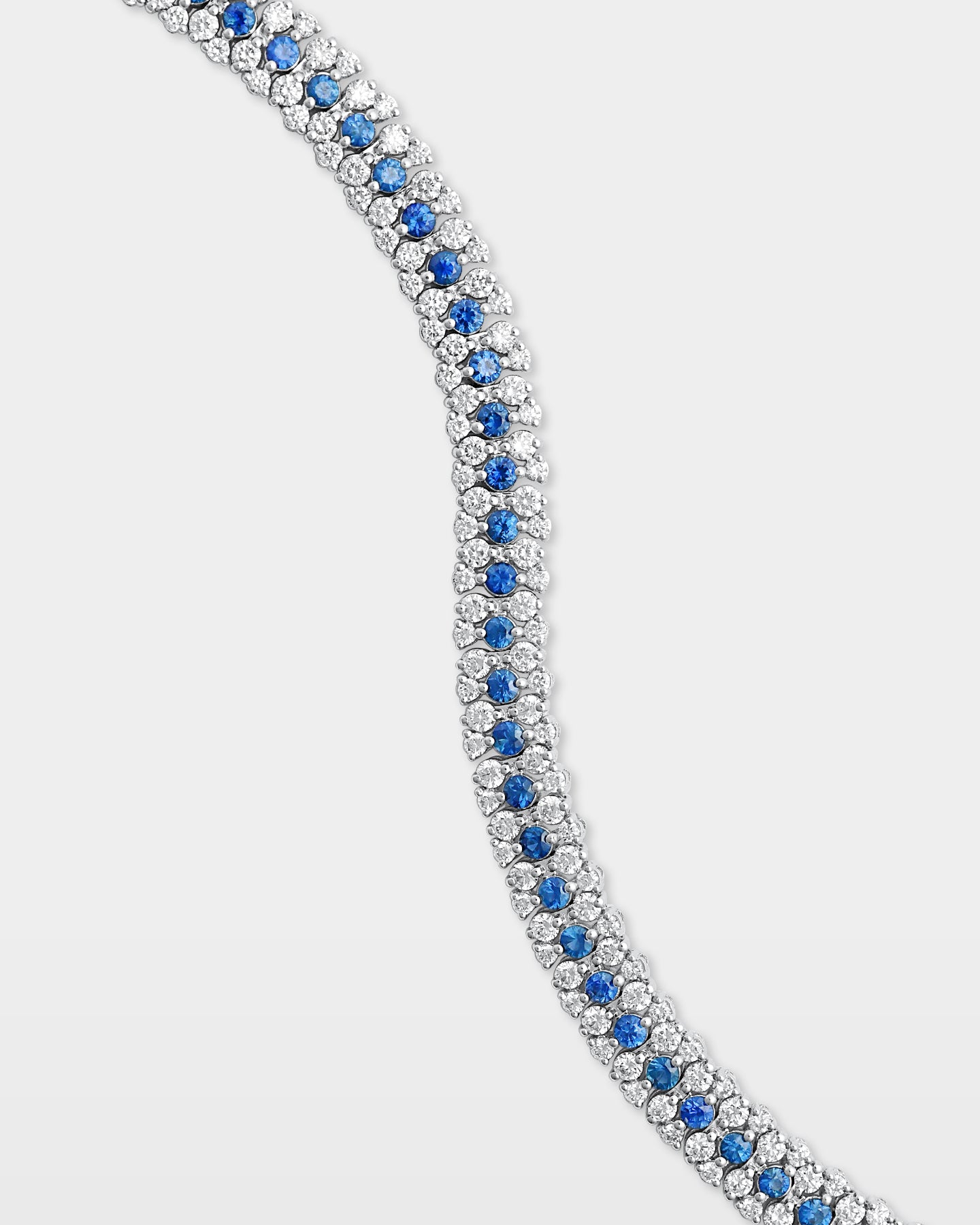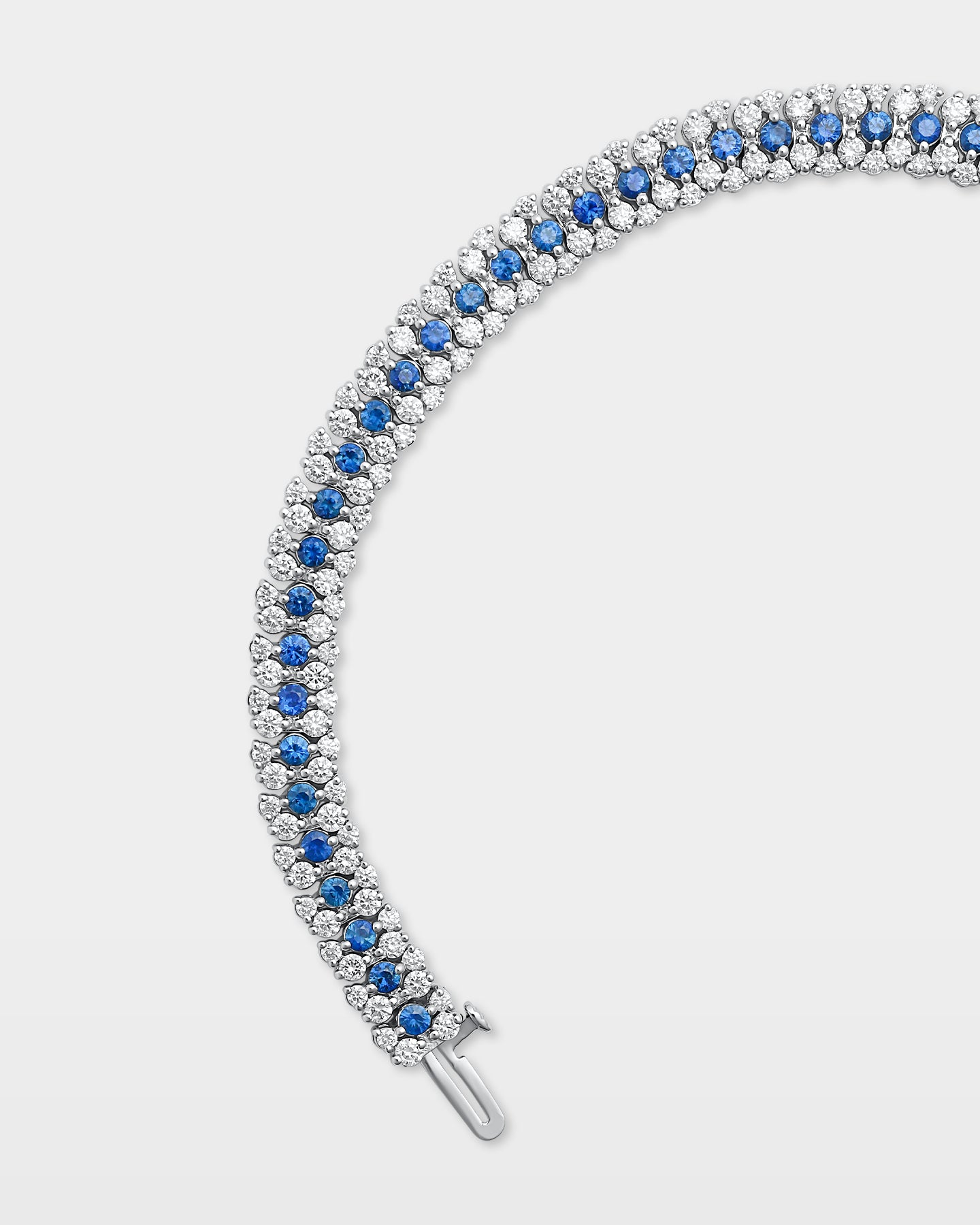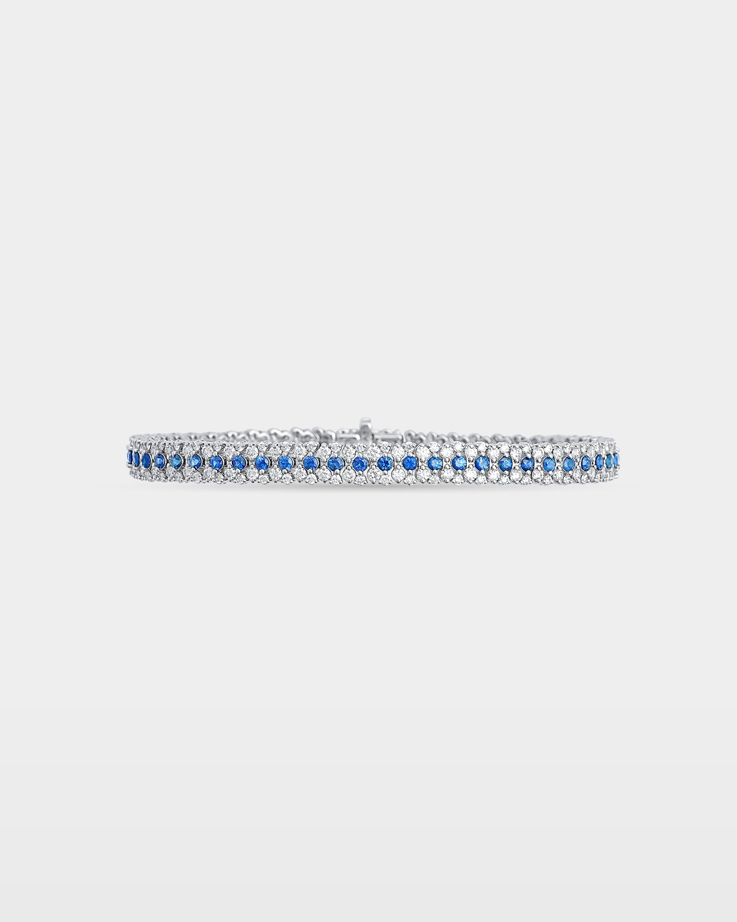 Blue sapphires run down the center of this three-row bracelet, edged on both sides with round diamonds. It works easily with gemstone necklaces or simple drop earrings when you want a coordinated look. Whether you are out celebrating or just grabbing a coffee, this diamond bracelet adds a quick upgrade to your wrist.