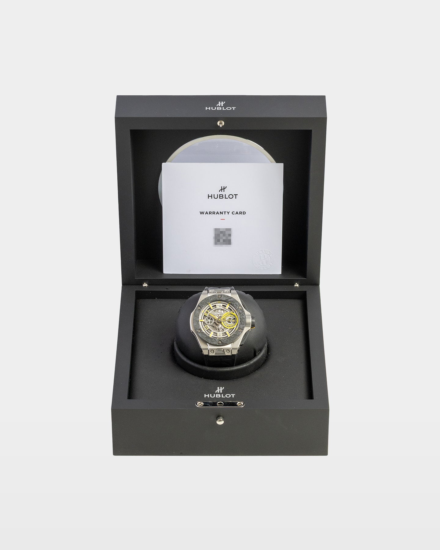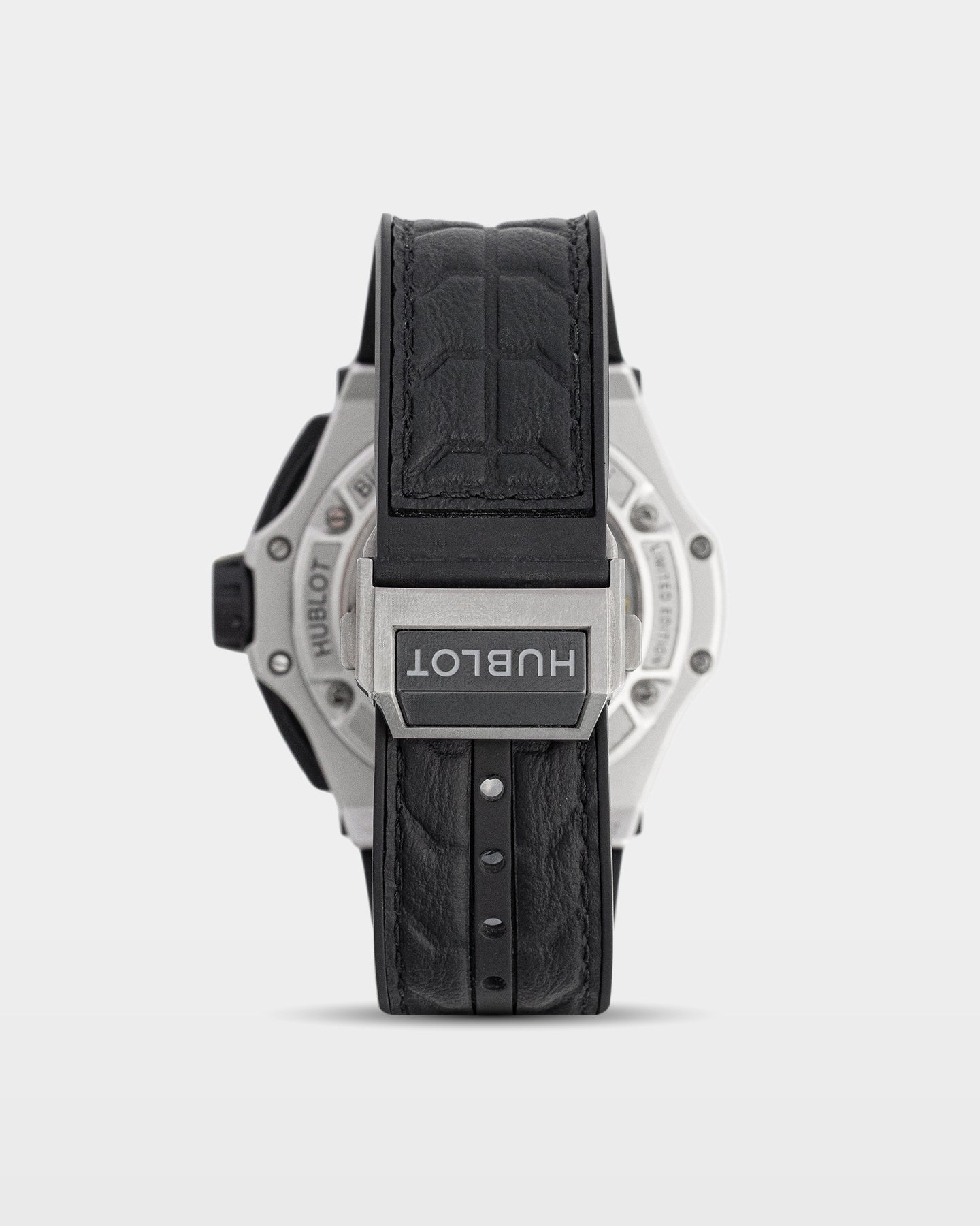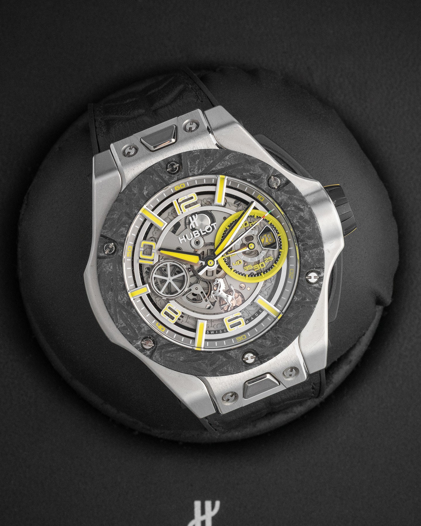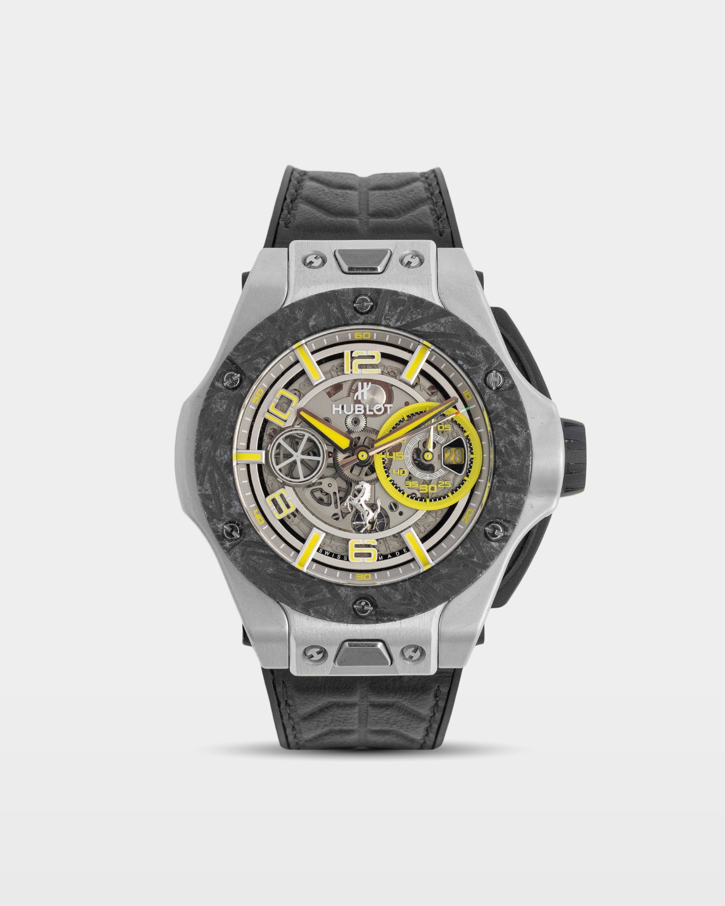 Ferrari and Hublot team up in the Big Bang Scuderia Ferrari 90th Anniversary 565.CN.1771, a platinum-cased sport watch limited to only 90 pieces. The 45mm build houses the HUB1241 UNICO automatic chronograph movement, boasting 72 hours of power reserve. The openworked dial reveals the mechanics, accented with Ferrari details like the prancing horse emblem and a yellow date display. A black rubber strap adds comfort while keeping the racing-inspired aesthetic intact.