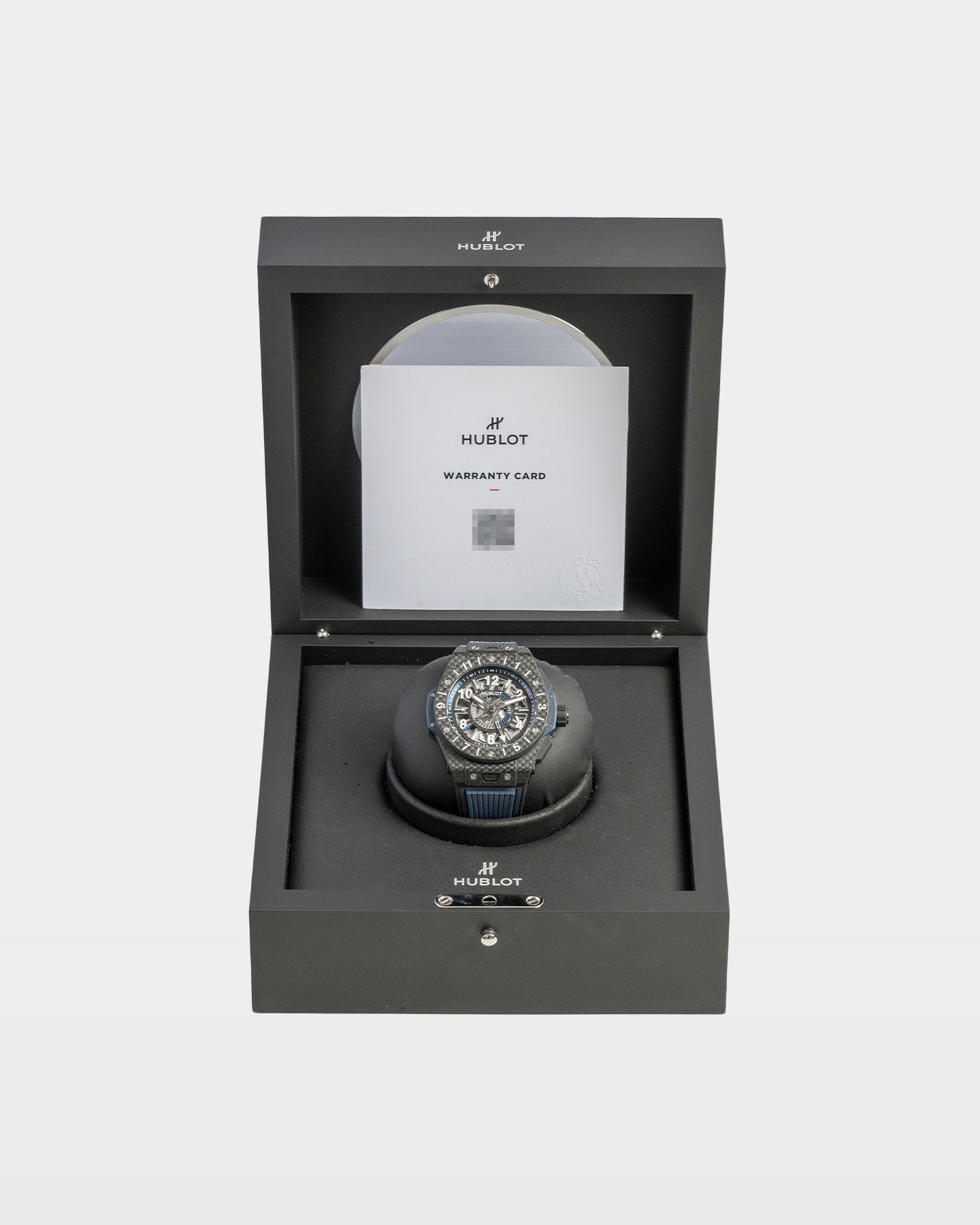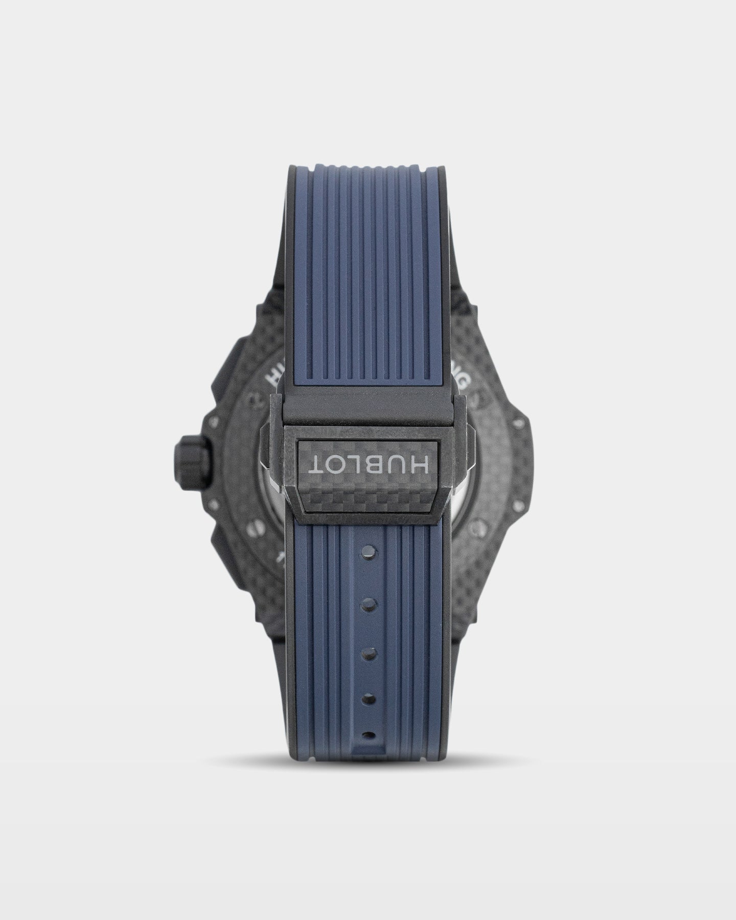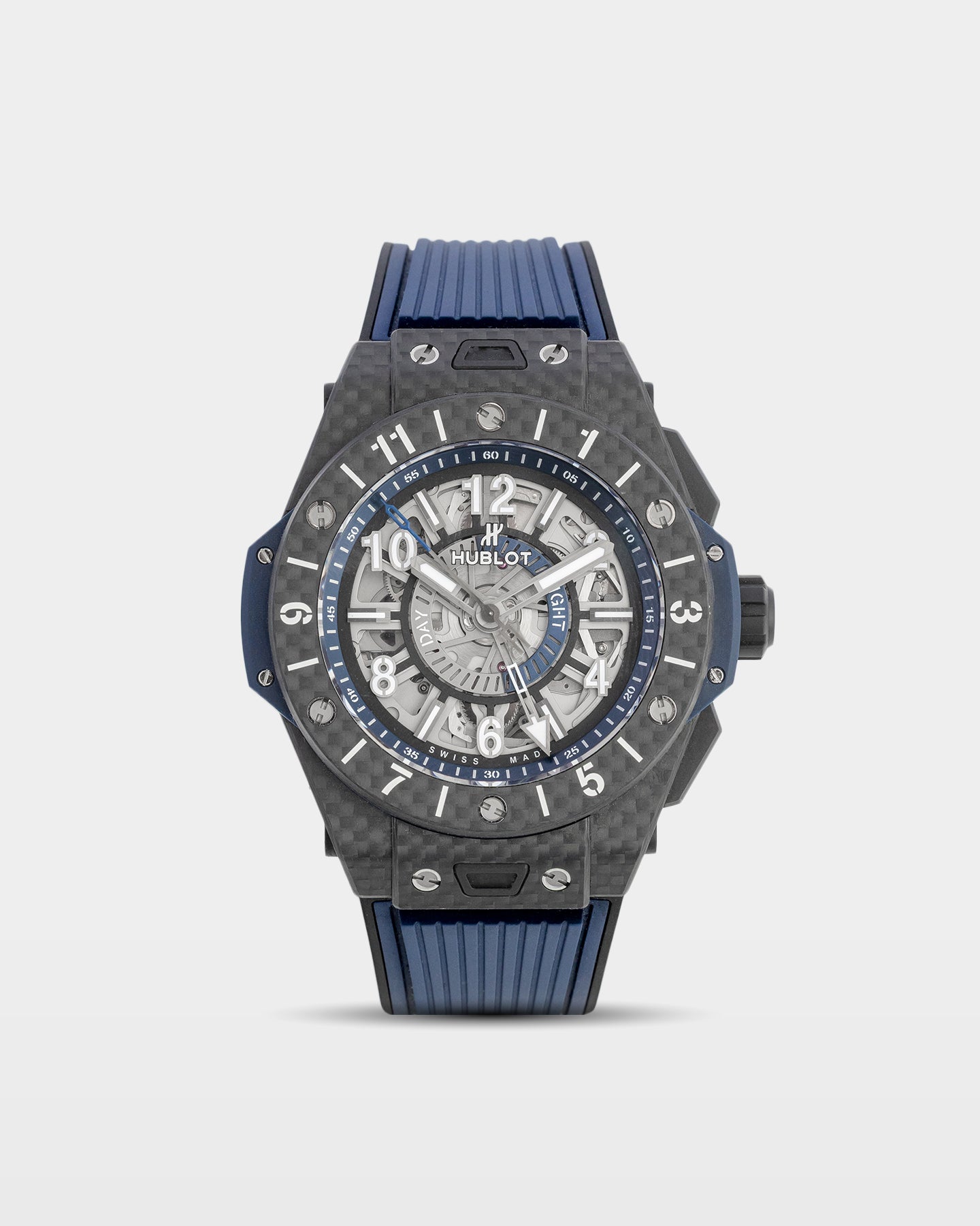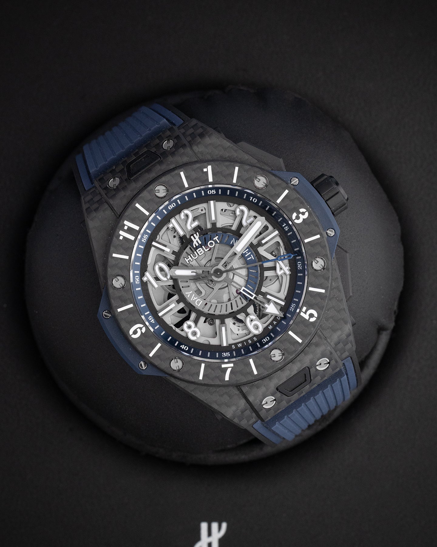 This Big Bang Unico GMT 471.QL.7127.RX is what happens when modern sport watch engineering meets Hublot flair. The 45mm carbon case and bezel keep things strong yet light, while the openworked dial gives you a full view of the UNICO HUB1251 movement inside. A dual time zone display with day and night indicator makes it a reliable travel partner, backed by a 72-hour power reserve. Finished with a black and blue structured rubber strap, it’s unapologetically functional but far from ordinary.