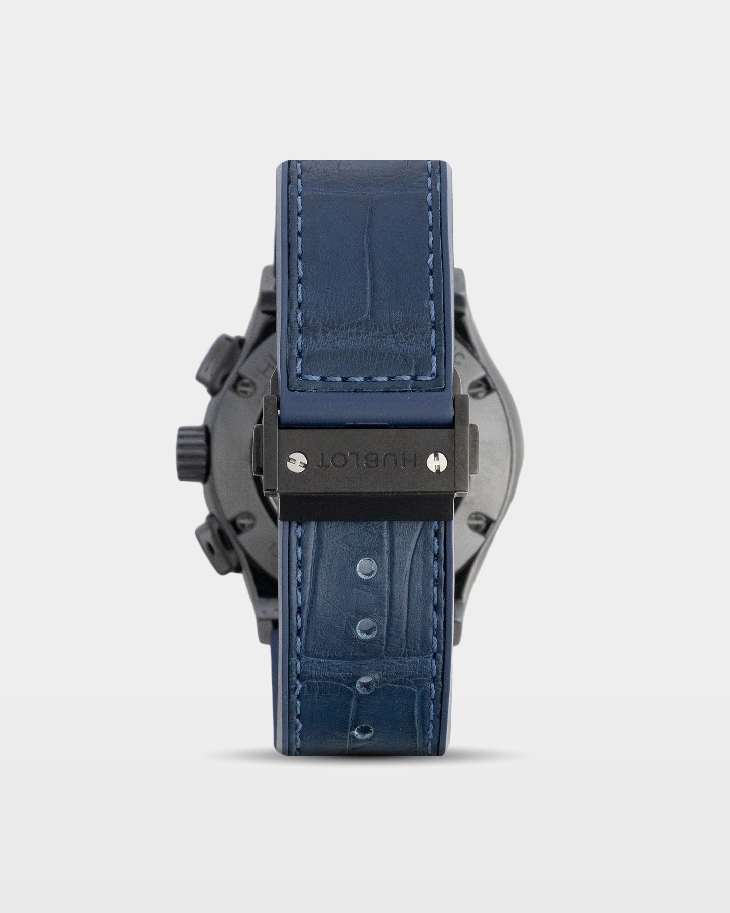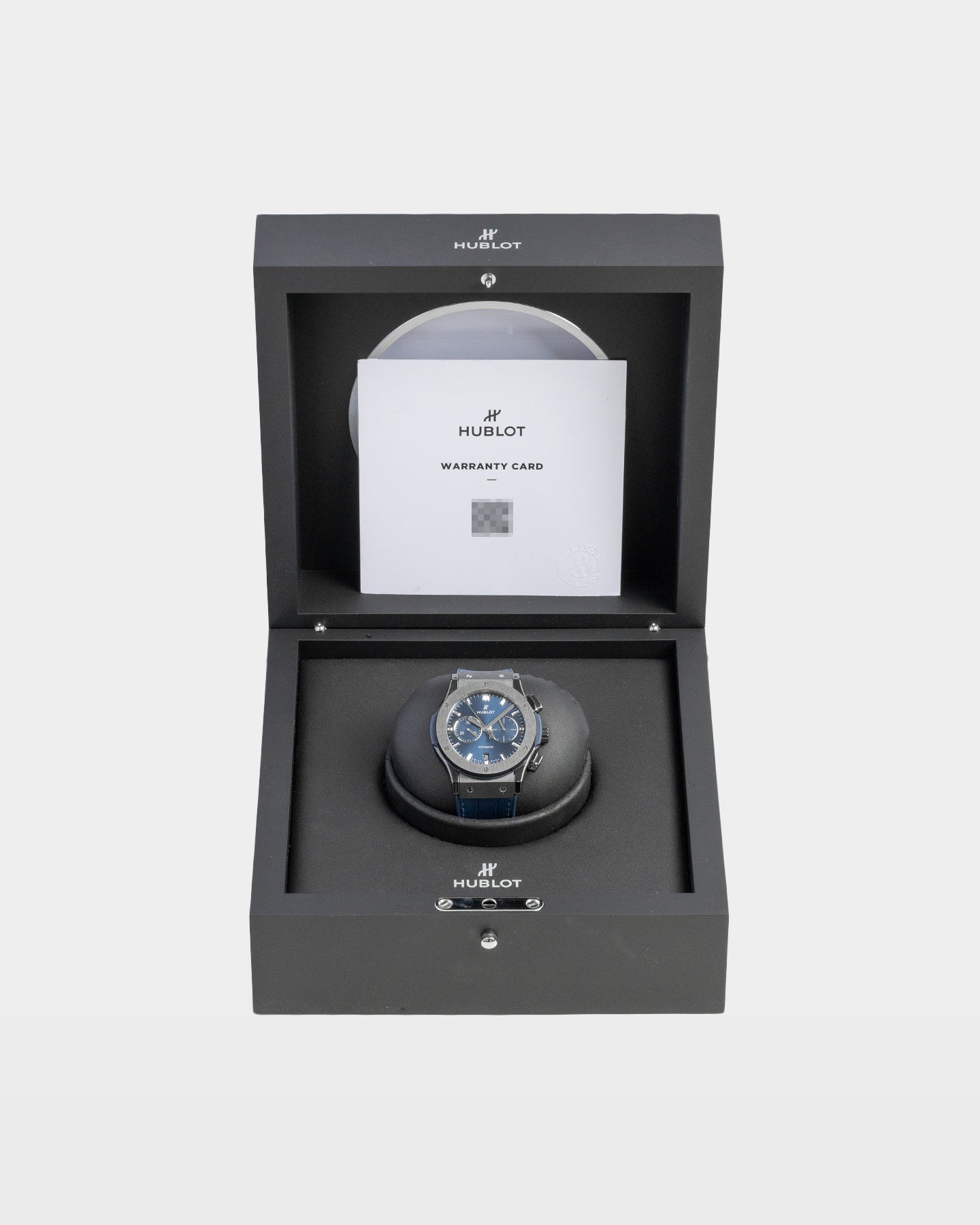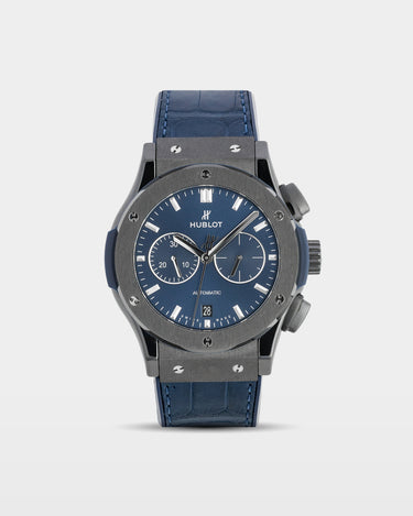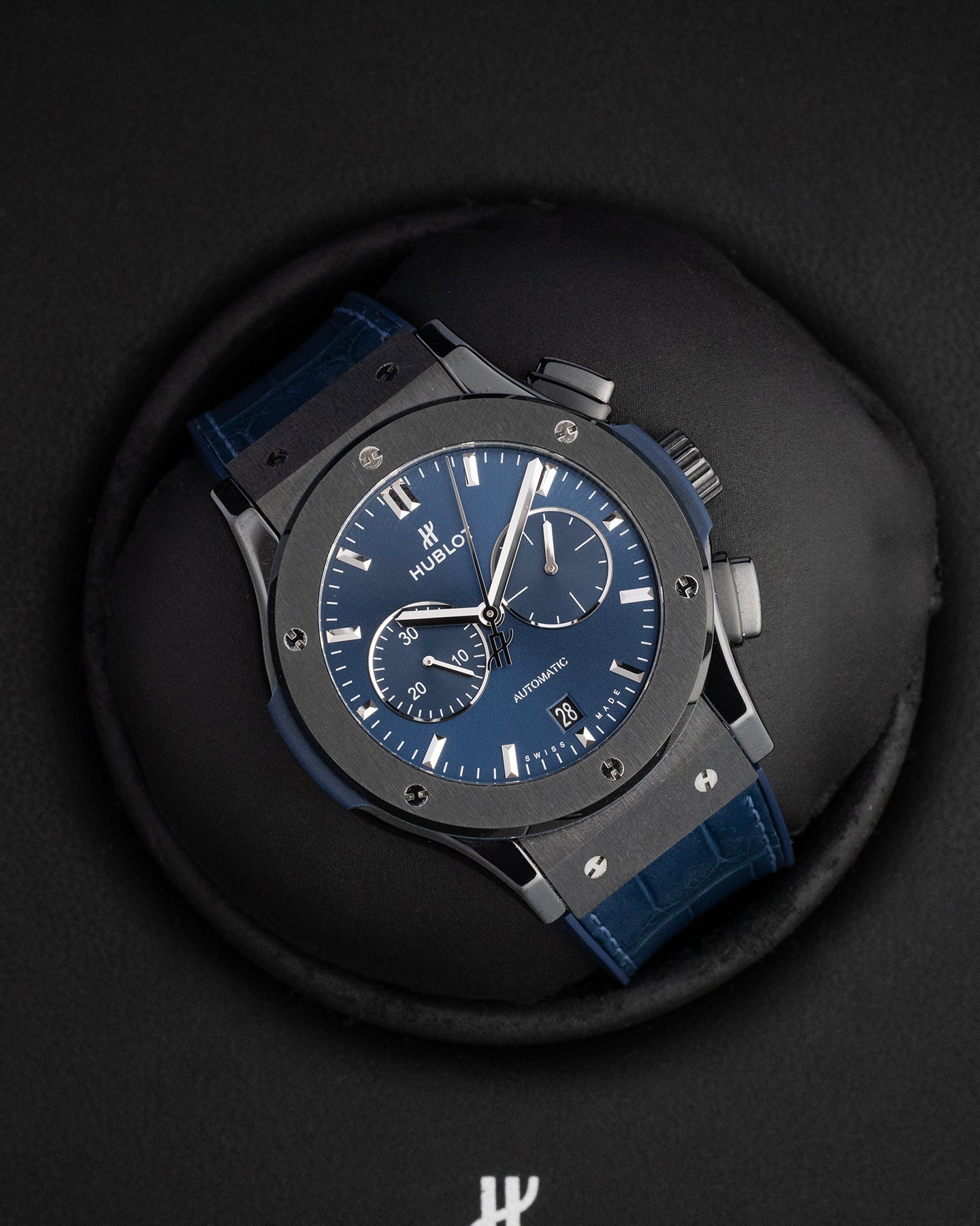 The Hublot Classic Fusion Chronograph 521.CM.7170.RX strikes a balance between sleek design and sport watch practicality. Its 45mm black ceramic case gives it a modern, lightweight feel, while the blue sunray dial adds depth and elegance. Two chronograph registers and a discreet date keep the dial functional without being cluttered. Inside, the HUB1143 automatic movement offers a solid 42-hour reserve. A blue leather strap with rubber backing makes it comfortable and stylish enough for everyday wear.