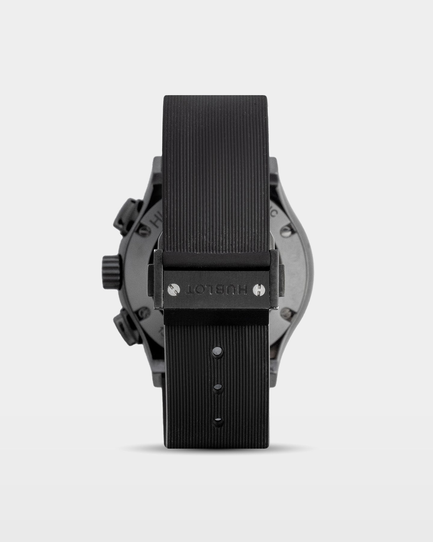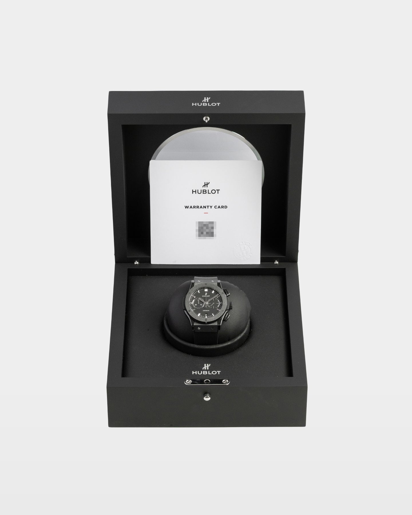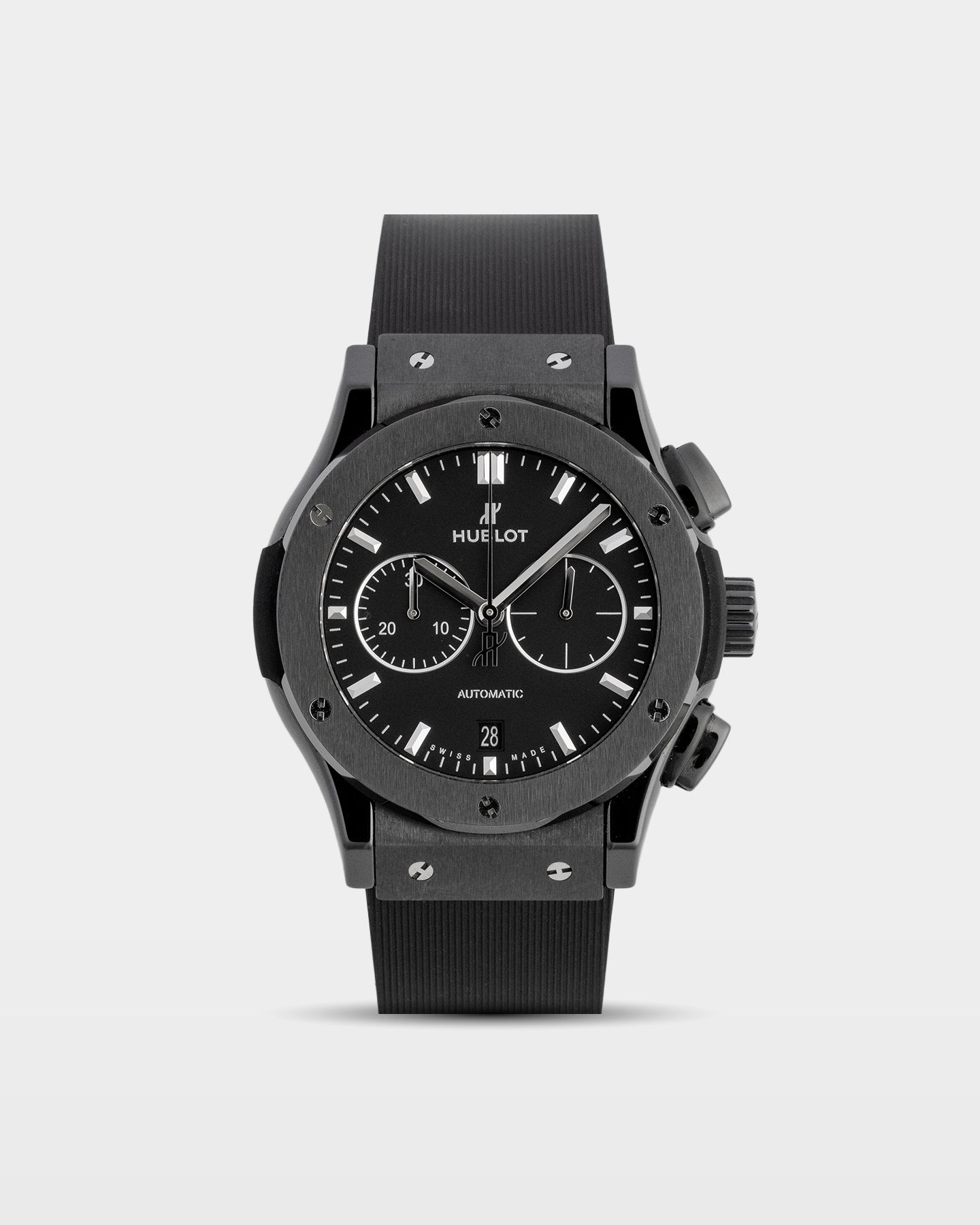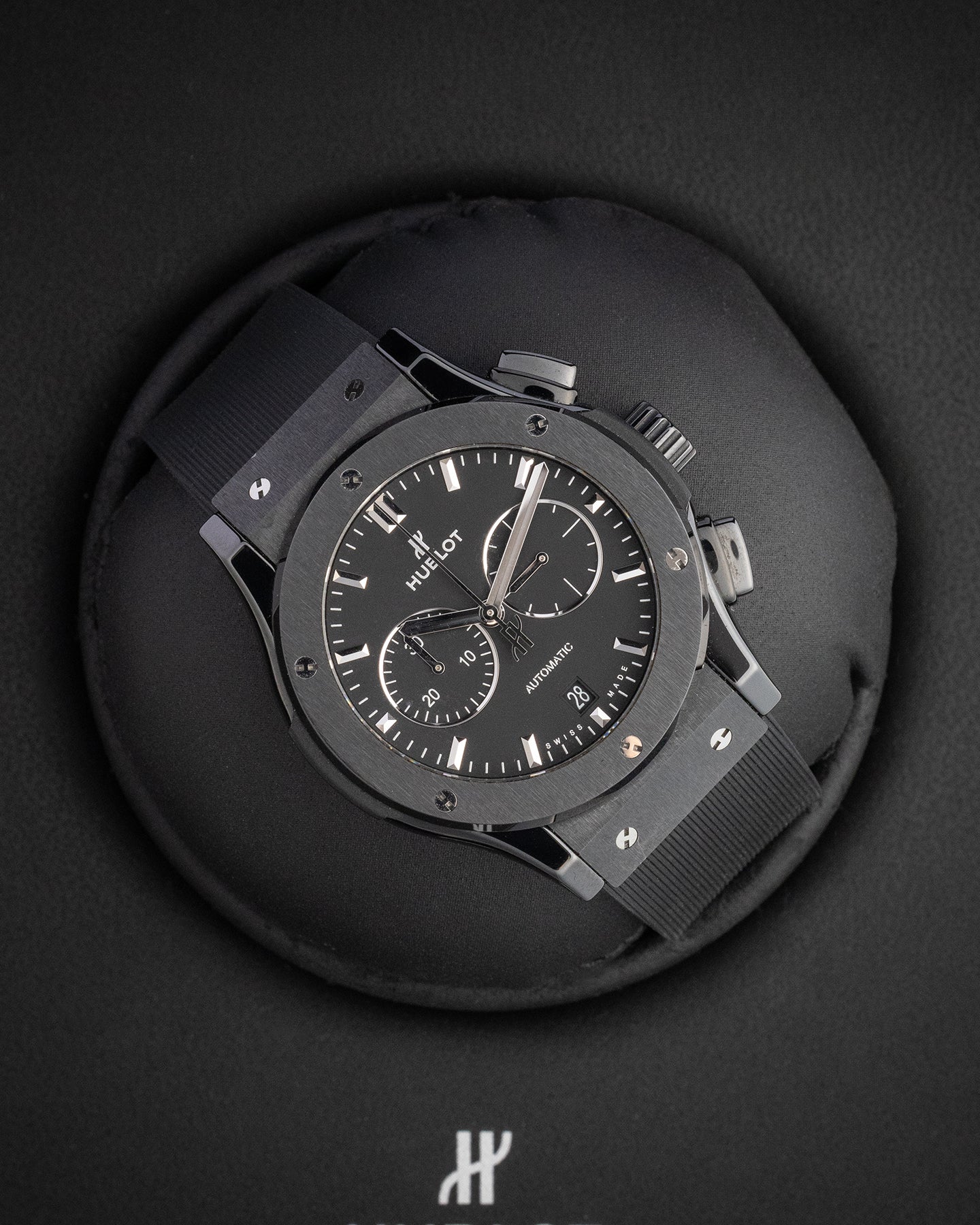 The Hublot Classic Fusion Chronograph 541.CM.171.RX takes the sleek lines of the Fusion family and gives them a sport watch edge. Its 45mm black ceramic case and matching bezel with six titanium screws keep the look modern and understated. The matte black dial is clean, with applied markers and two chronograph subdials. Inside, the self-winding HUB1153 caliber provides around 42 hours of power reserve. Finished on a black rubber strap, this piece feels durable, lightweight, and versatile enough for daily wear.