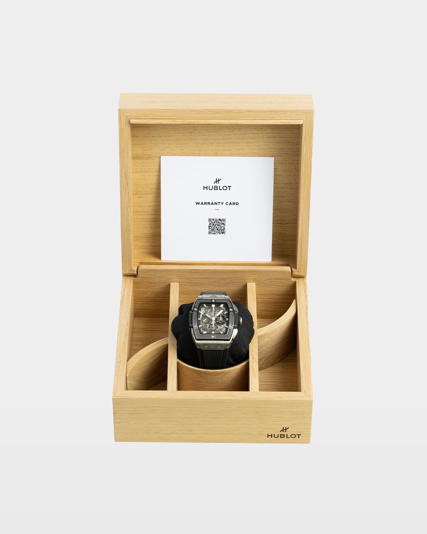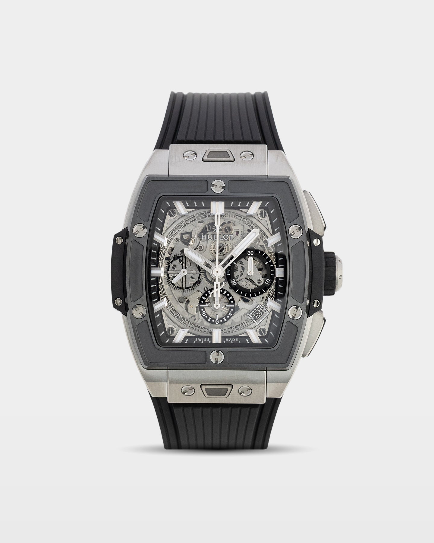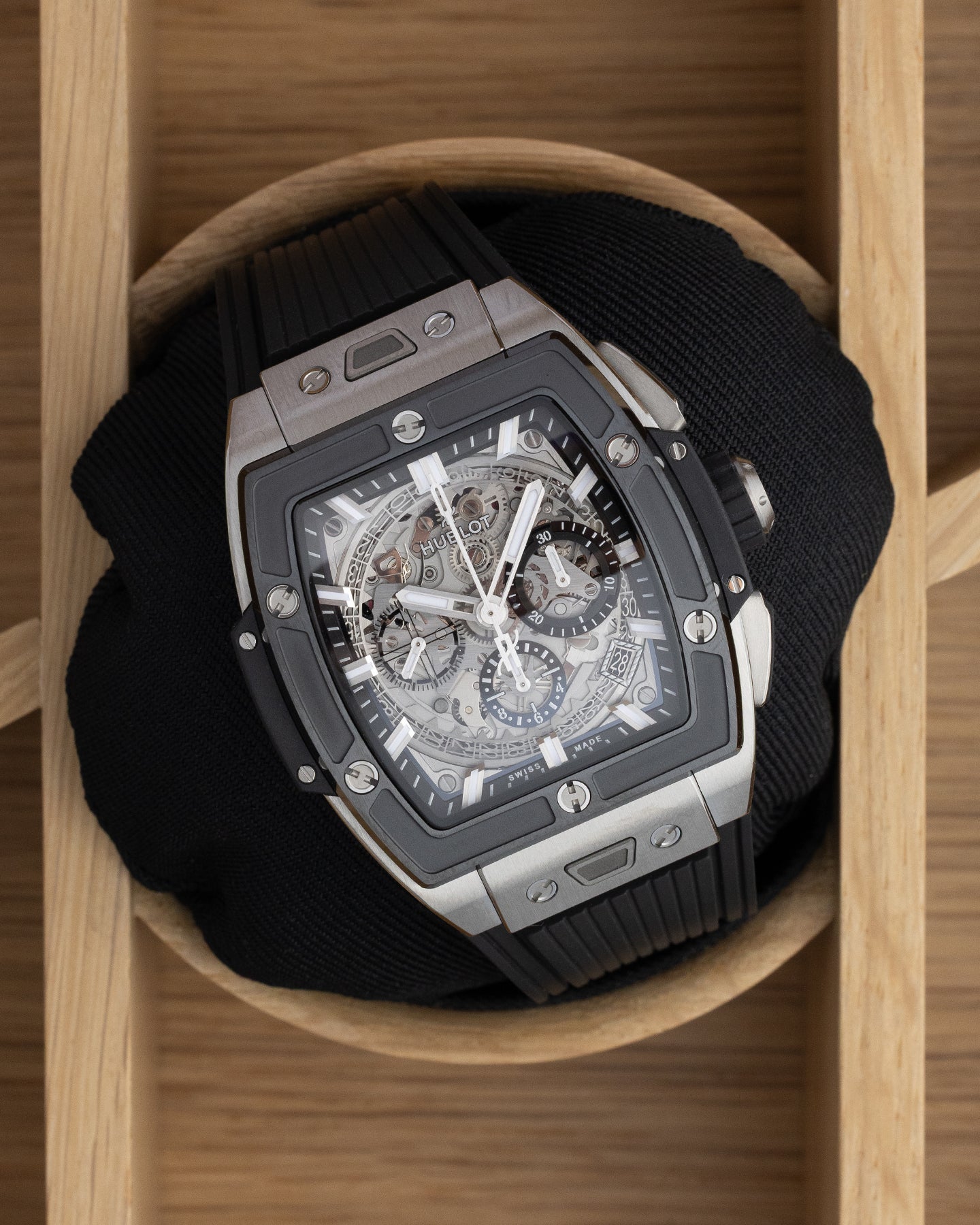 The Spirit of Big Bang 642.NM.0170.RX brings Hublot’s signature style into a compact, sport watch format. The titanium tonneau case measures 42mm and is paired with a ceramic bezel that’s built to handle wear. Its skeleton sapphire dial reveals the HUB4700 inside, a chronograph caliber with 50 hours of power and a slick industrial finish. Paired with a black rubber strap, this watch is equal parts comfort and presence.
