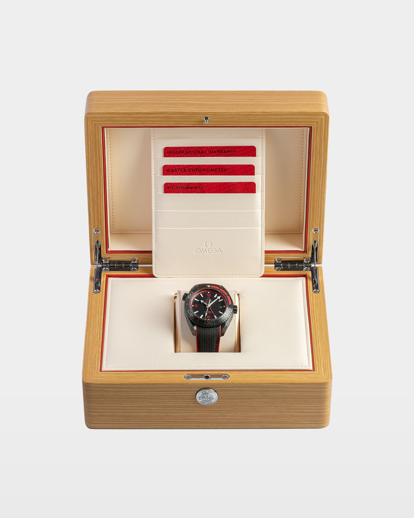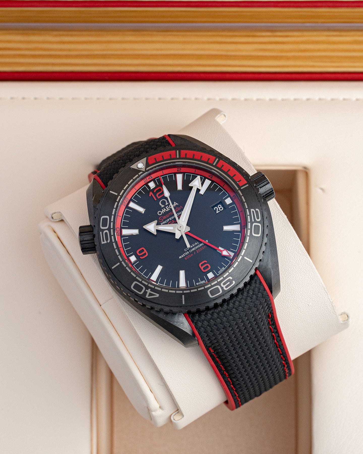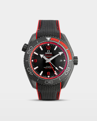 The Seamaster Planet Ocean “Deep Black” isn’t your average sport watch. At 45.5mm, its full ceramic case feels modern and almost overbuilt in the best way. The matte black finish gets a jolt of red—from the bezel’s first 15 minutes to the GMT ring and Arabic numerals—that quietly nods to how red light disappears underwater. Inside, the Master Chronometer Calibre 8906 keeps two time zones running with ease. It’s bold, technical, and an Omega watch you'll always reach for.