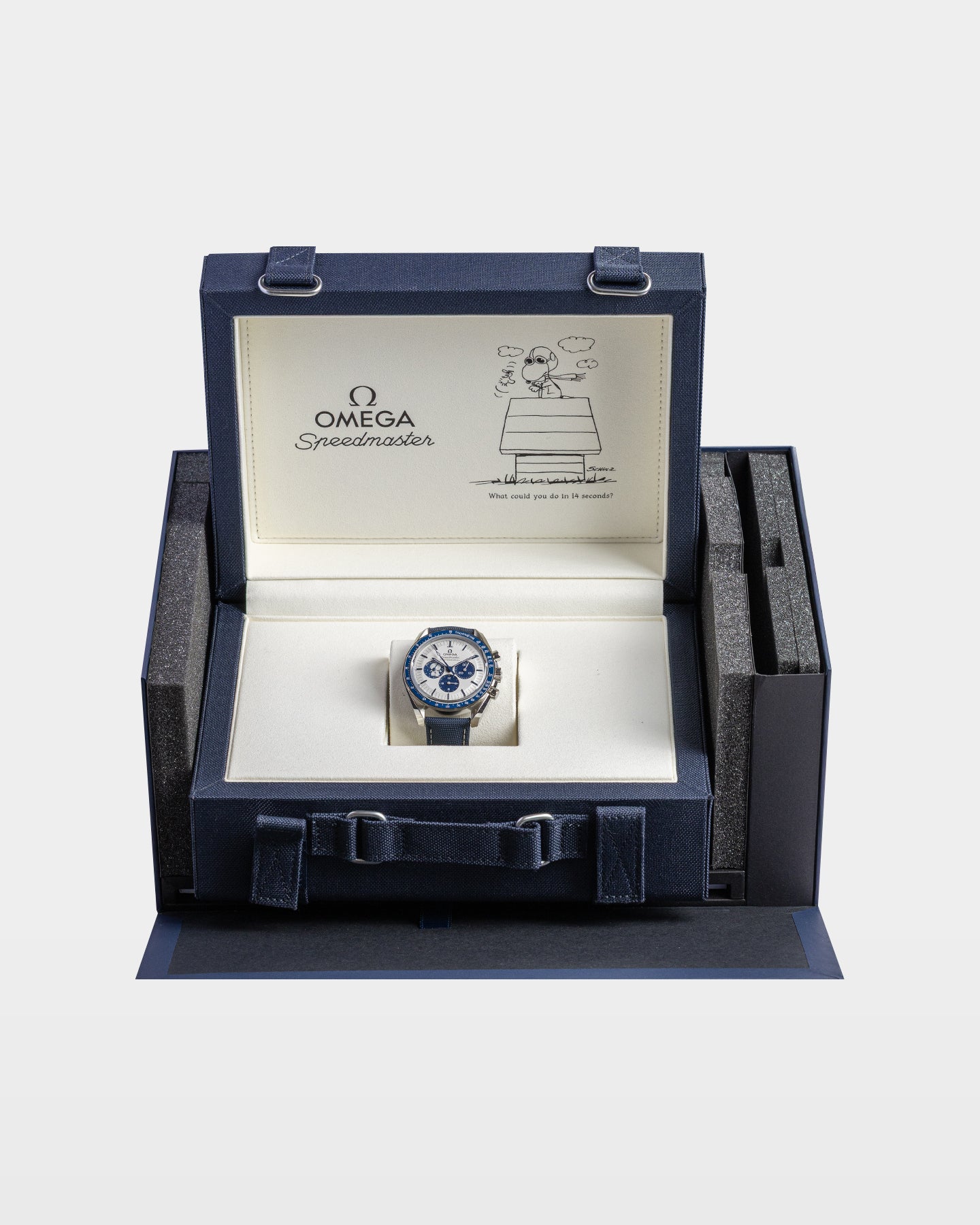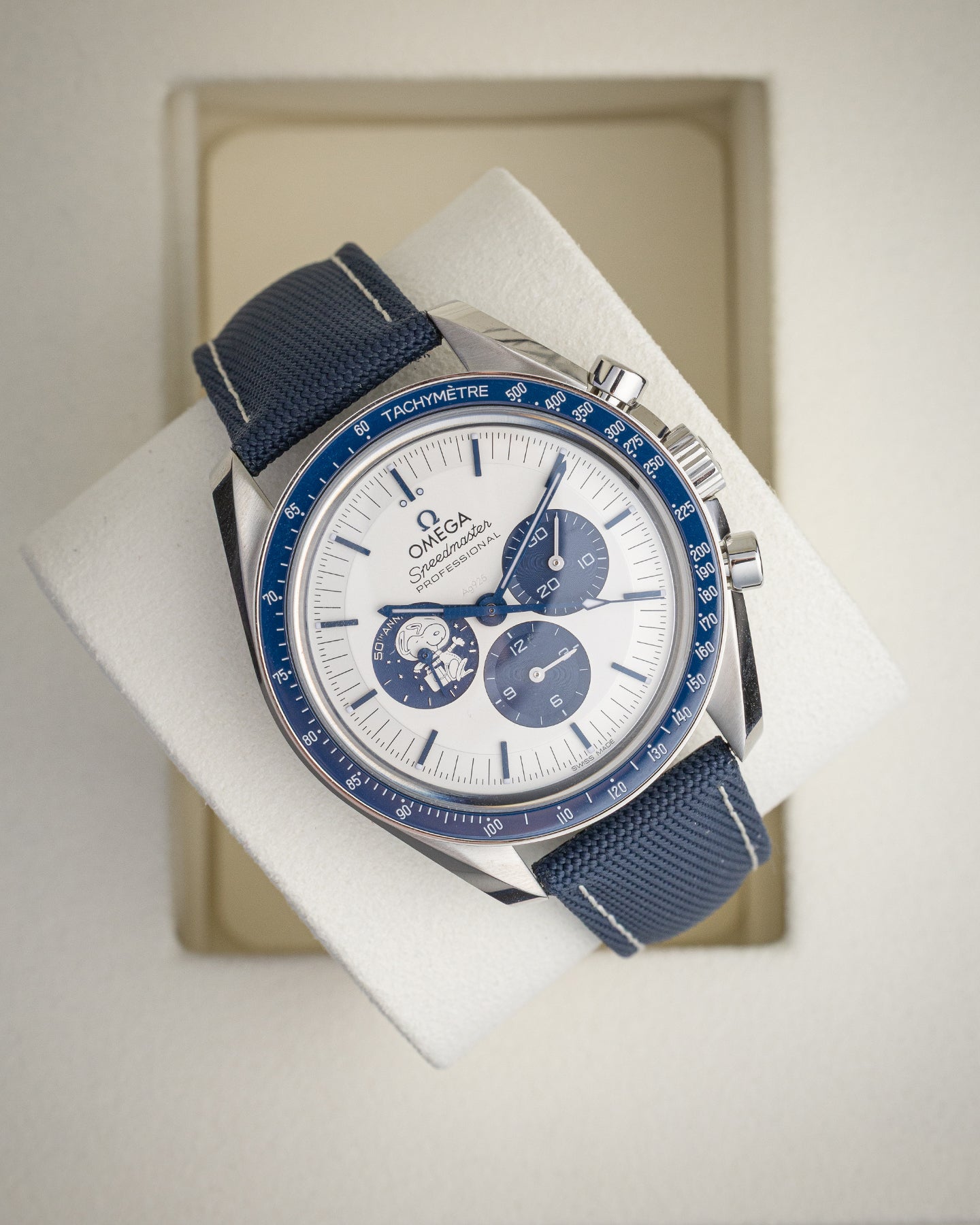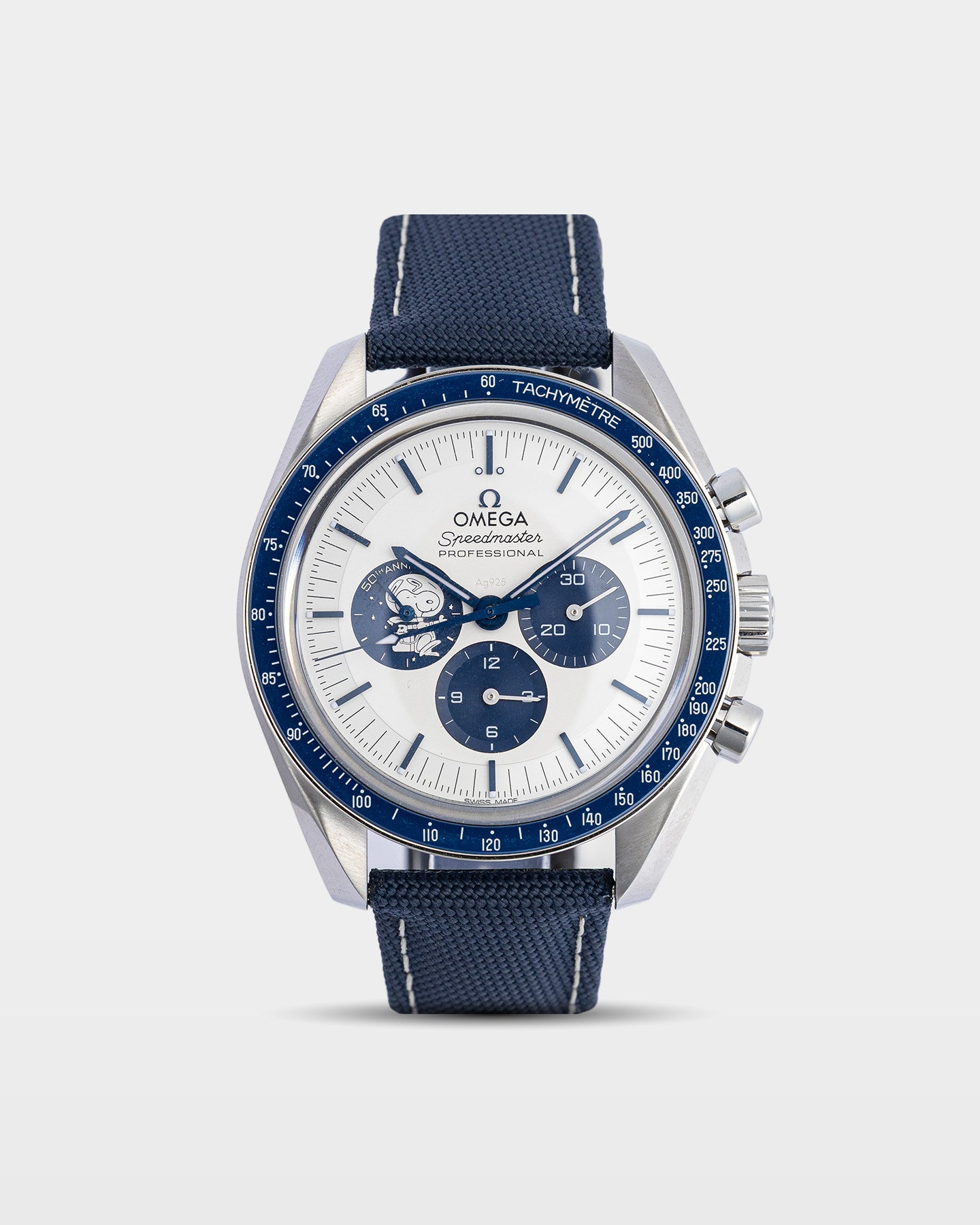 The Speedmaster Silver Snoopy is a watch that tells a story at every glance. Its 42 mm stainless steel case frames a silver dial with crisp blue hands and a Snoopy medallion at 9 o’clock. Flip it over and the sapphire caseback reveals a miniature Earth and Snoopy in a Command and Service Module. The Apollo 13 trajectory embossed on the blue nylon strap completes the playful nod to history. Powered by the Co-Axial Master Chronometer 3861, this is an Omega watch with personality.