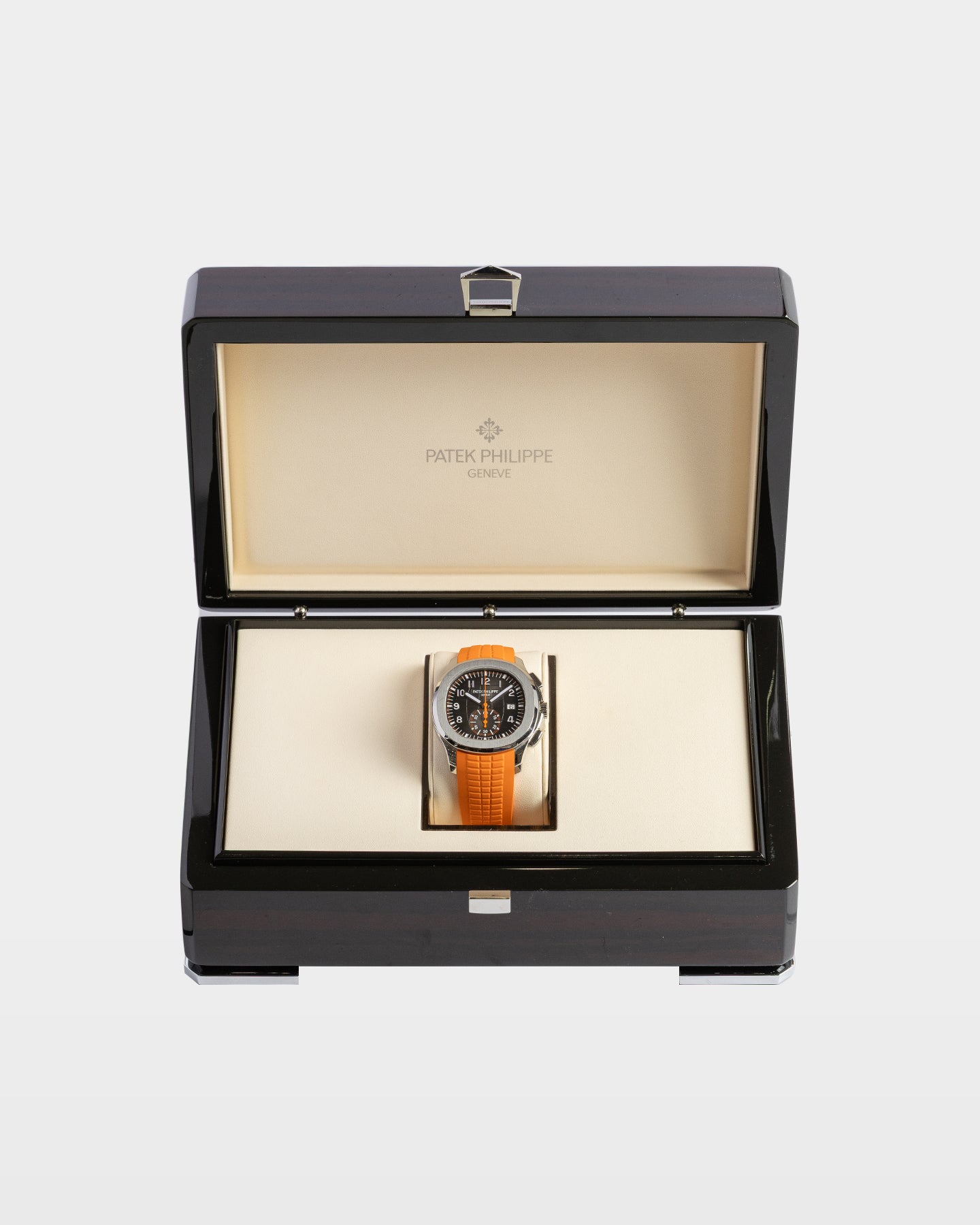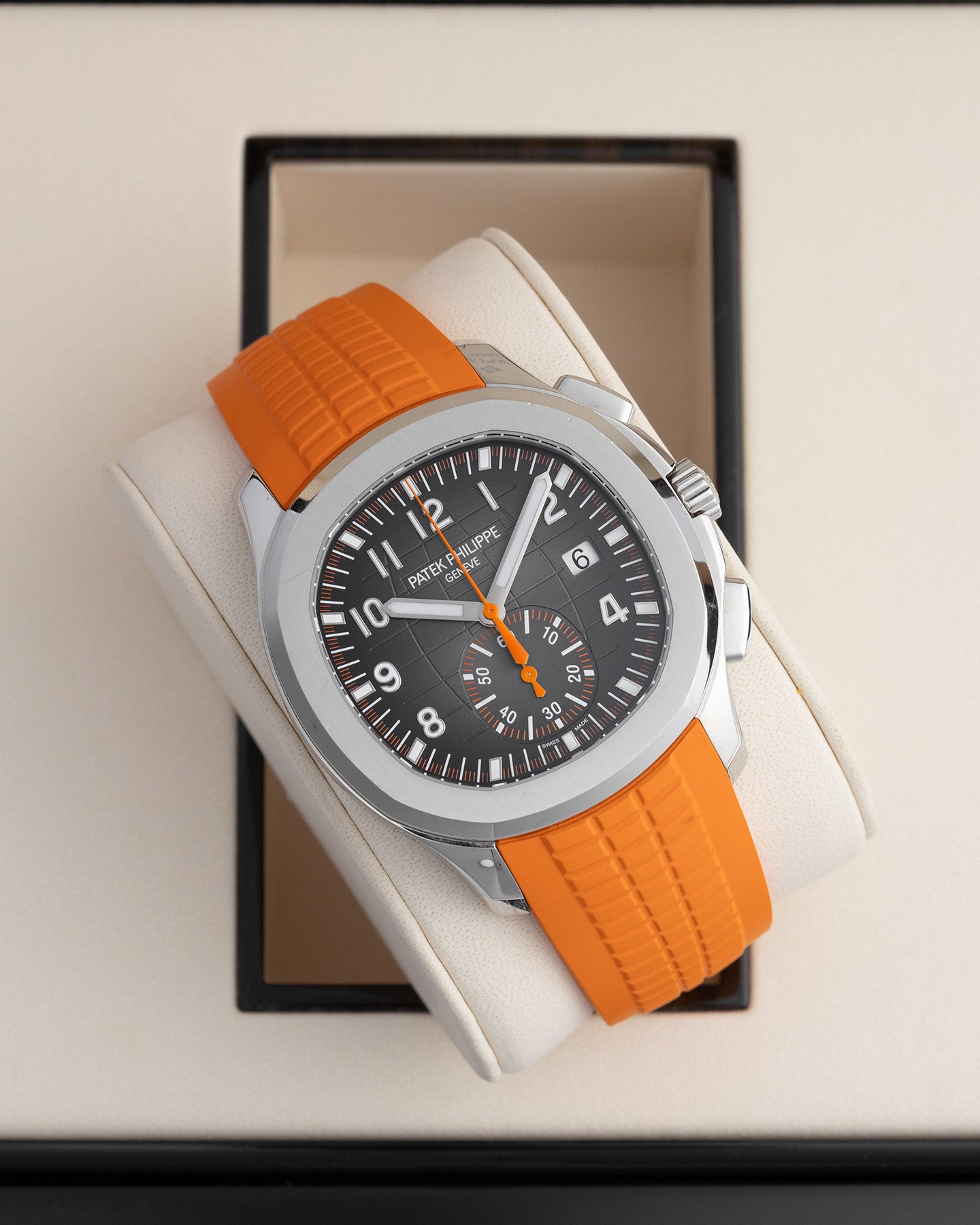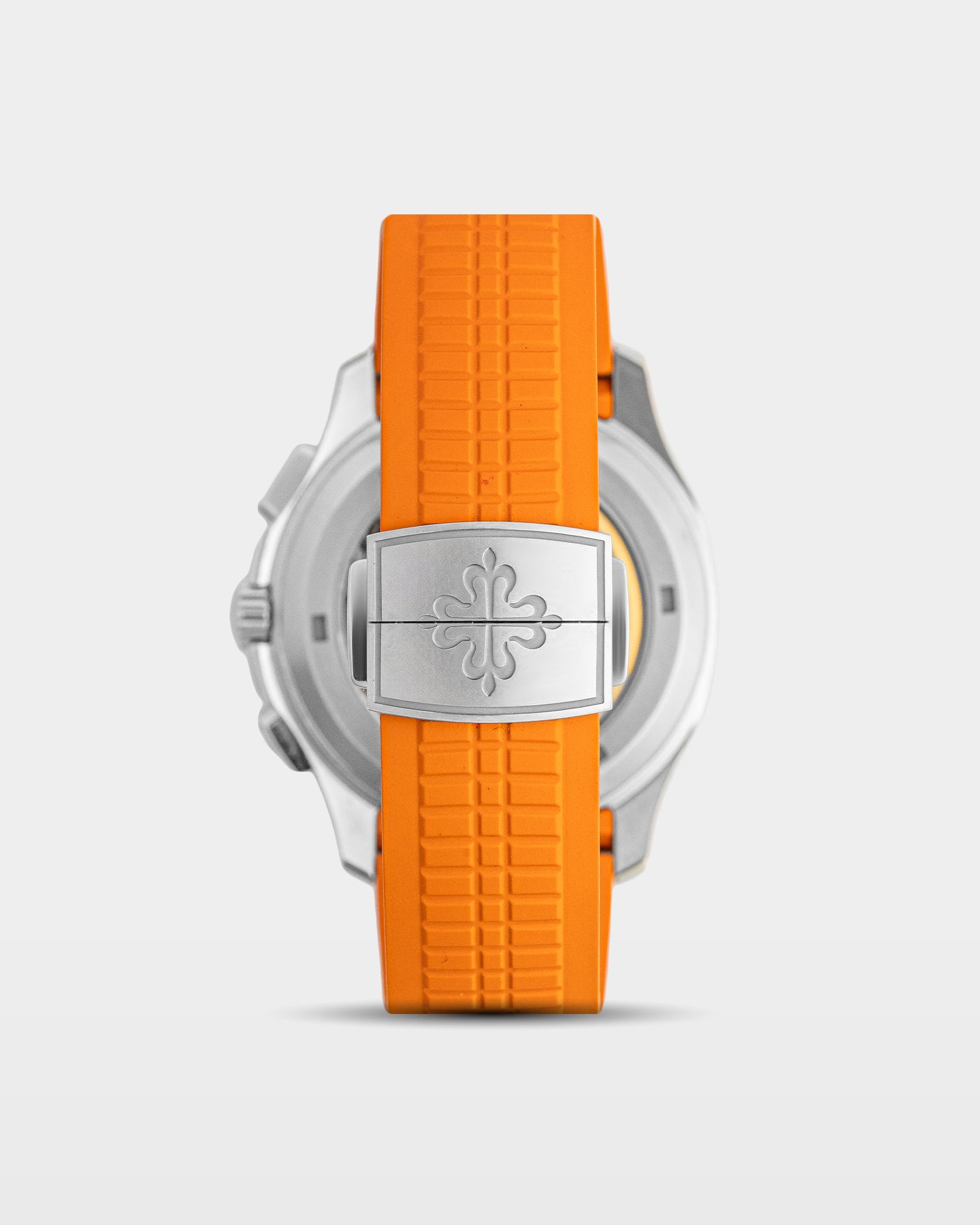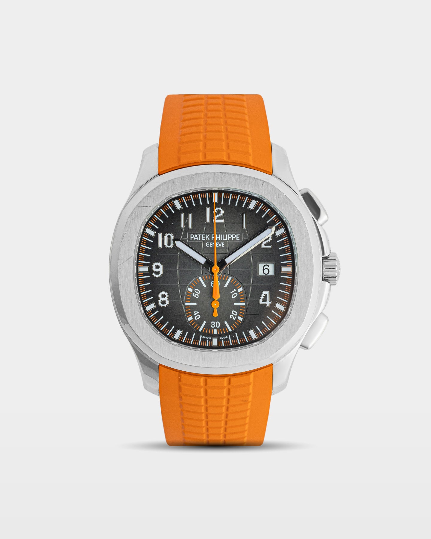 The Aquanaut 5968A is a Patek Philippe watch built for those who like bold but understated style. Its 42mm steel case and octagonal bezel frame a grey embossed dial punctuated by orange chronograph hands and a 60-minute counter at 6 o’clock. The Caliber CH 28-520 C flyback chronograph powers the watch with 55 hours of reserve and is displayed through a sapphire case back. Fitted to a vibrant orange “Tropical” rubber strap, this watch mixes technical sophistication with a playful, modern aesthetic.