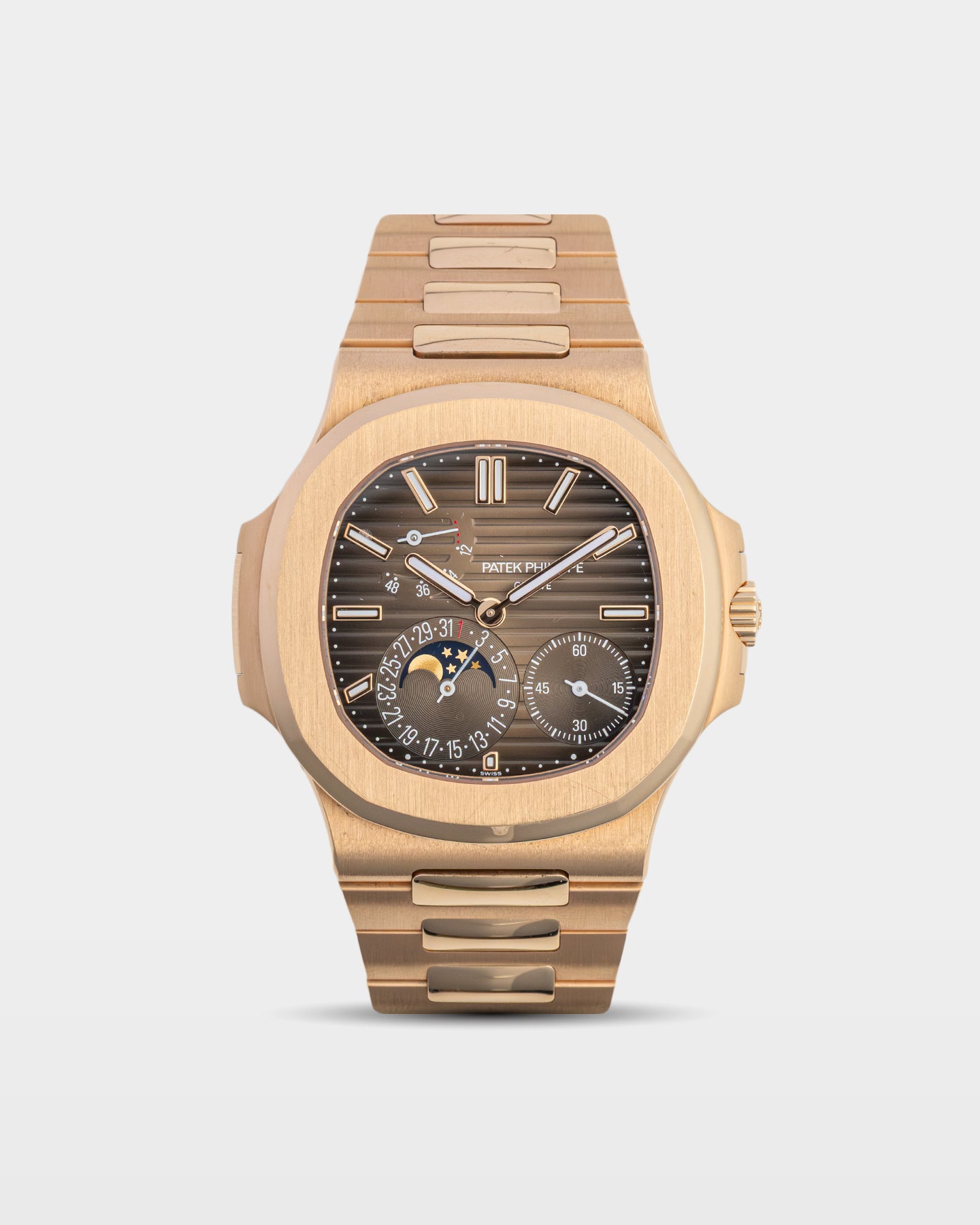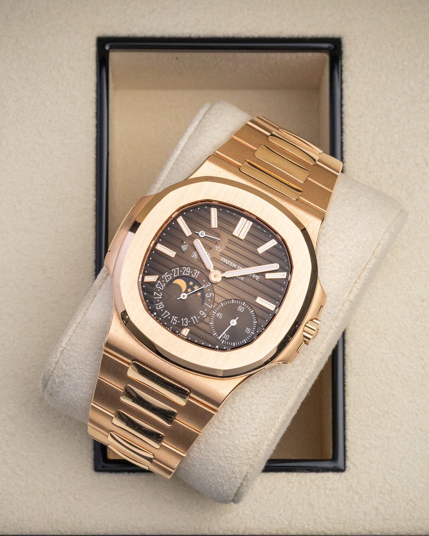 Few pieces strike the balance of casual sportiness and refined luxury like the Nautilus 5712/1R-001. Rendered in rose gold, the 40.5mm case houses a rich brown gradient dial with Patek’s signature embossed horizontal pattern. The asymmetrical layout highlights complications like a moon phase, analog date, and power reserve. Beneath the surface ticks is the slim Caliber 240 PS IRM C LU, complete with micro-rotor architecture. This is a Patek Philippe watch that doubles as a dress watch with daily-wear appeal.