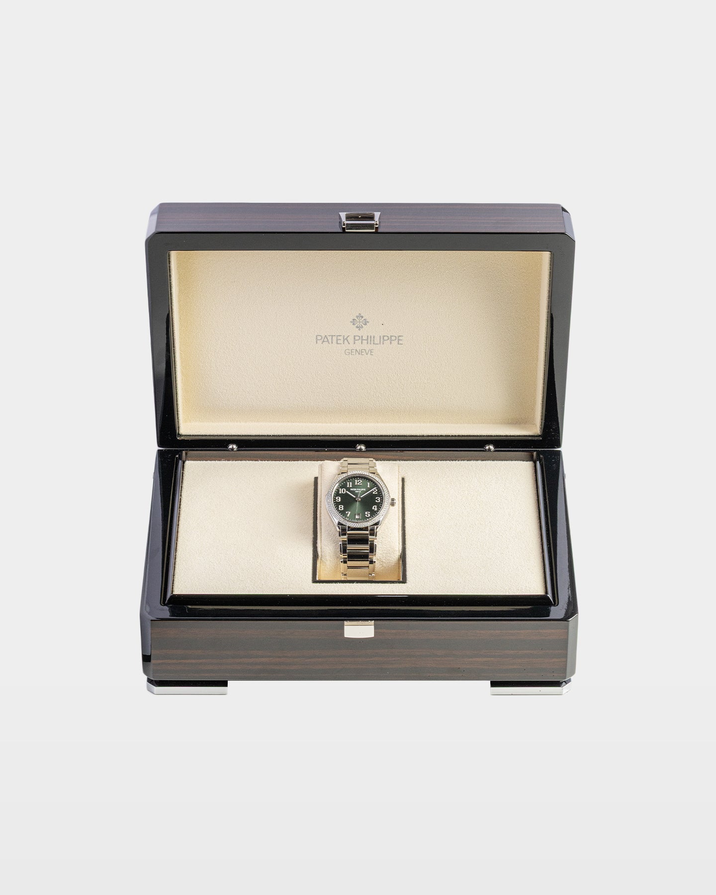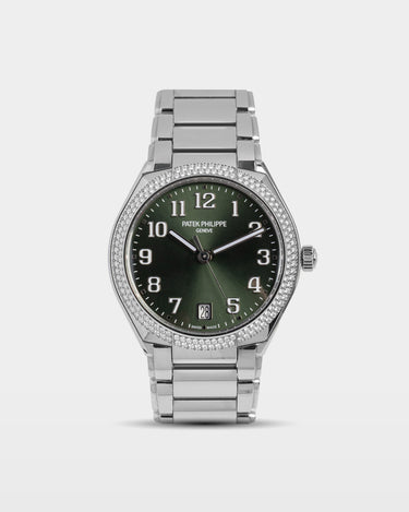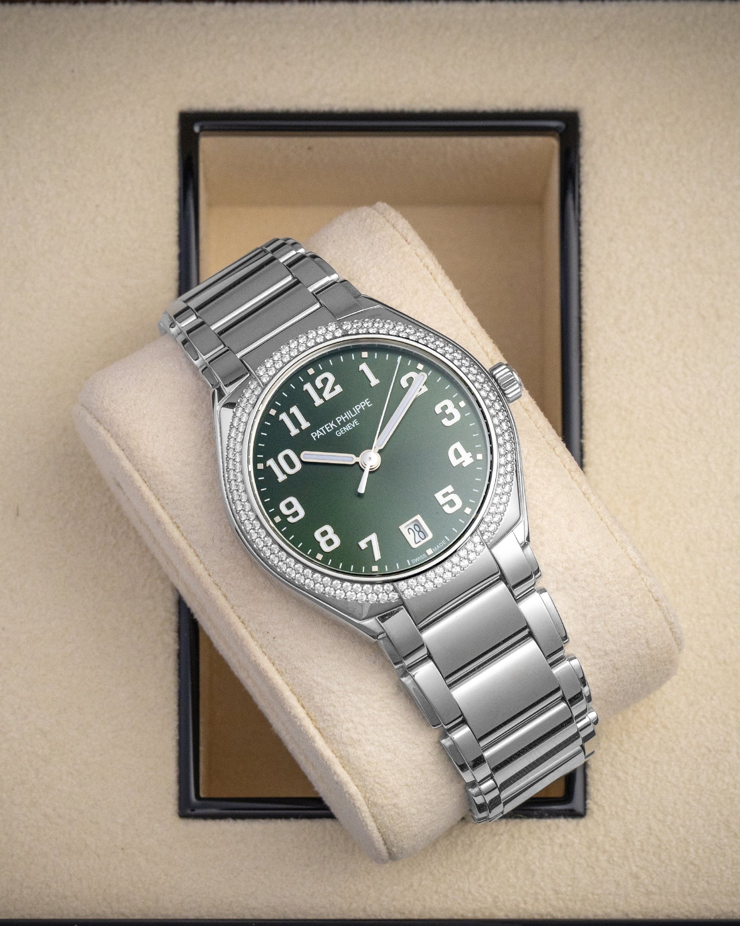 The Twenty-4 Self Winding 7300/1200A 011 brings everyday luxury into focus. A 36 mm steel case meets a double row diamond bezel with 160 stones for just enough sparkle. The sunburst olive dial glows with white gold numerals, luminous baton hands, and a crisp date at three. Inside sits the automatic 26 330 S C with stop seconds and smooth winding, good for about forty five hours. A Patek Philippe watch for real life, not only red carpets.
