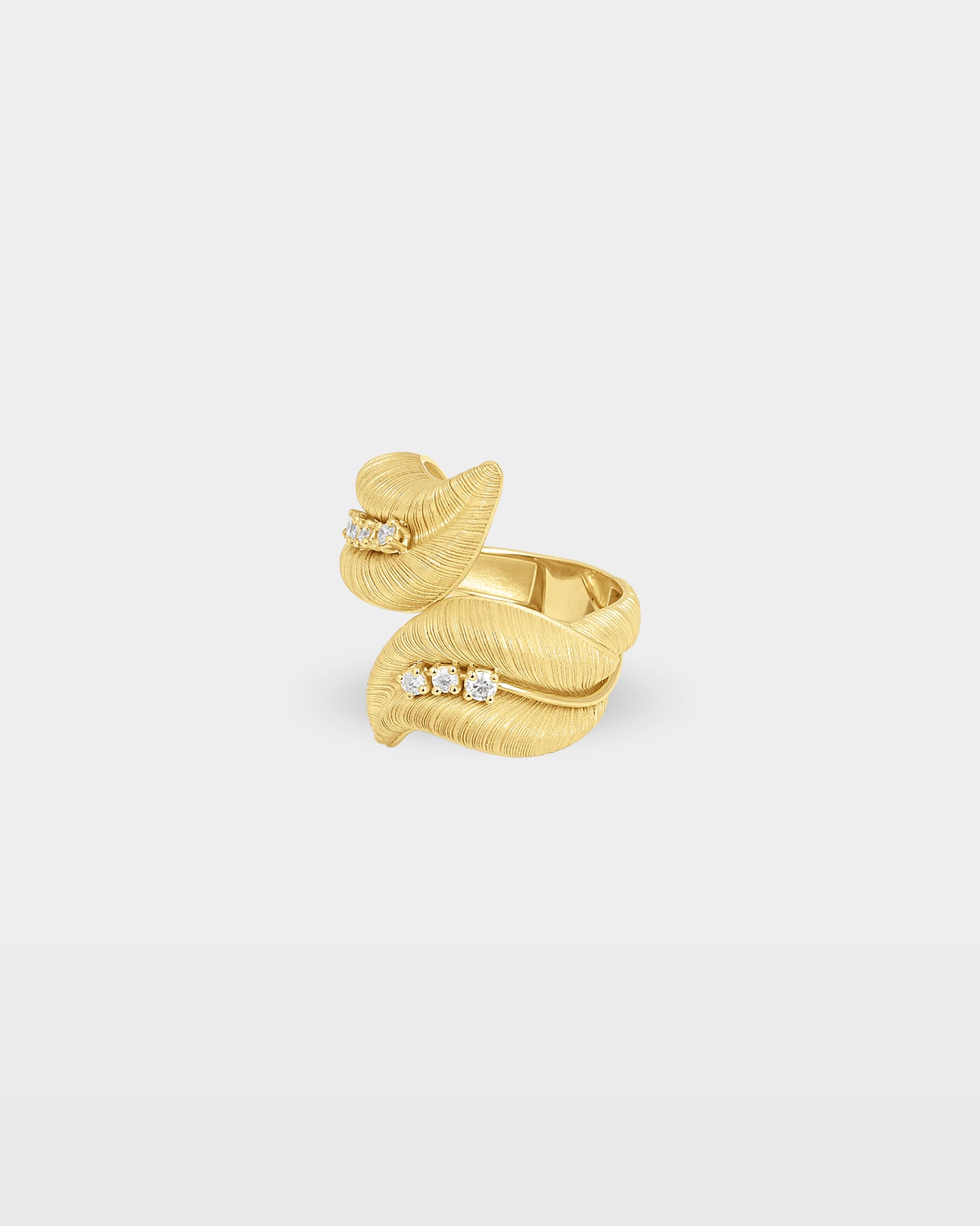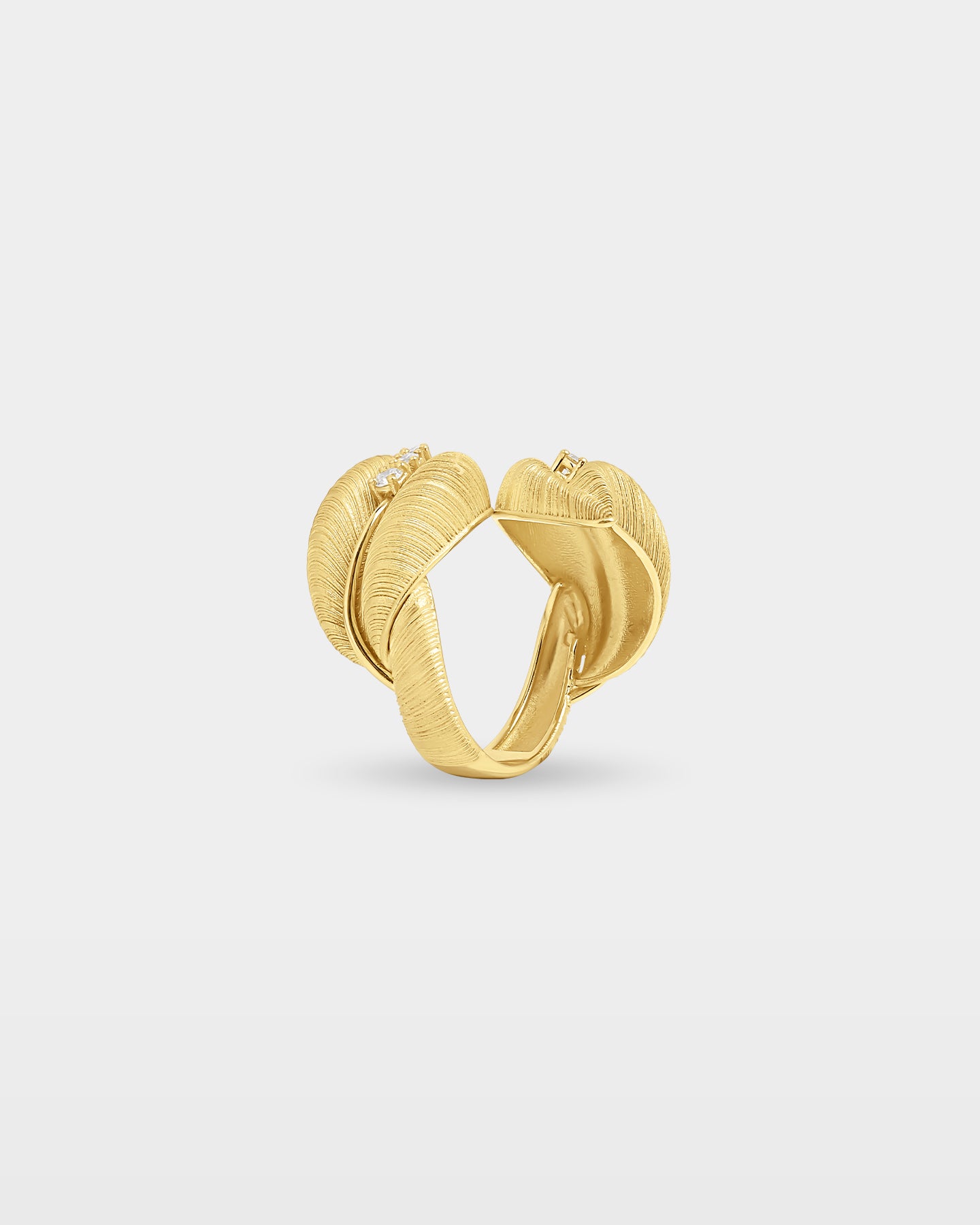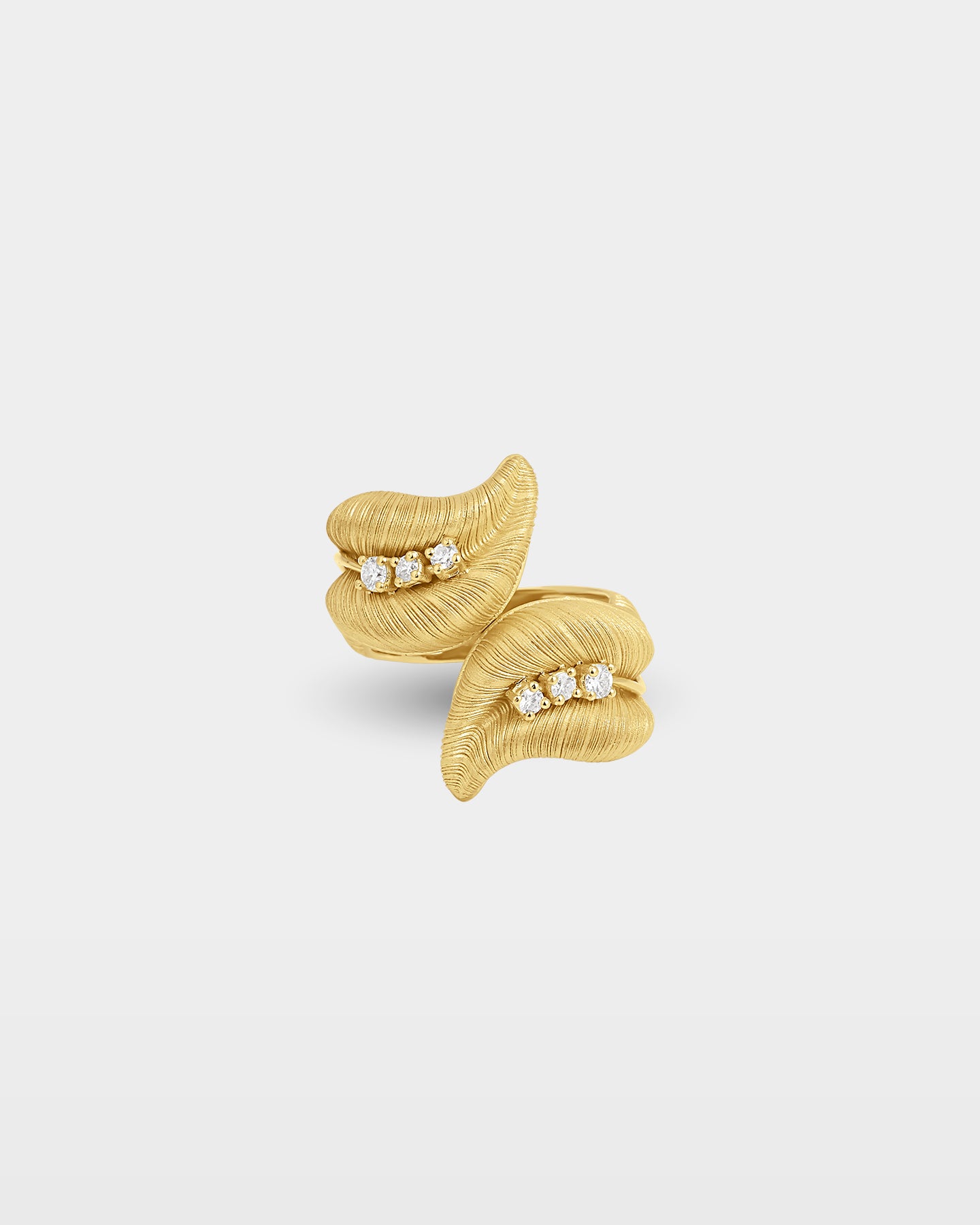 This 18k yellow gold ring leans into sculptural gold with its wraparound leaf design and soft texture. The three-diamond accents add just enough shine to pair well with slim bangles, chain bracelets, or a simple pendant necklace. Wear it solo for a more artistic moment or stack it alongside other gold pieces for a layered look.