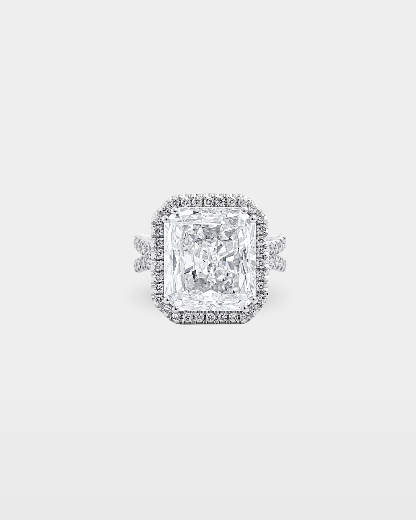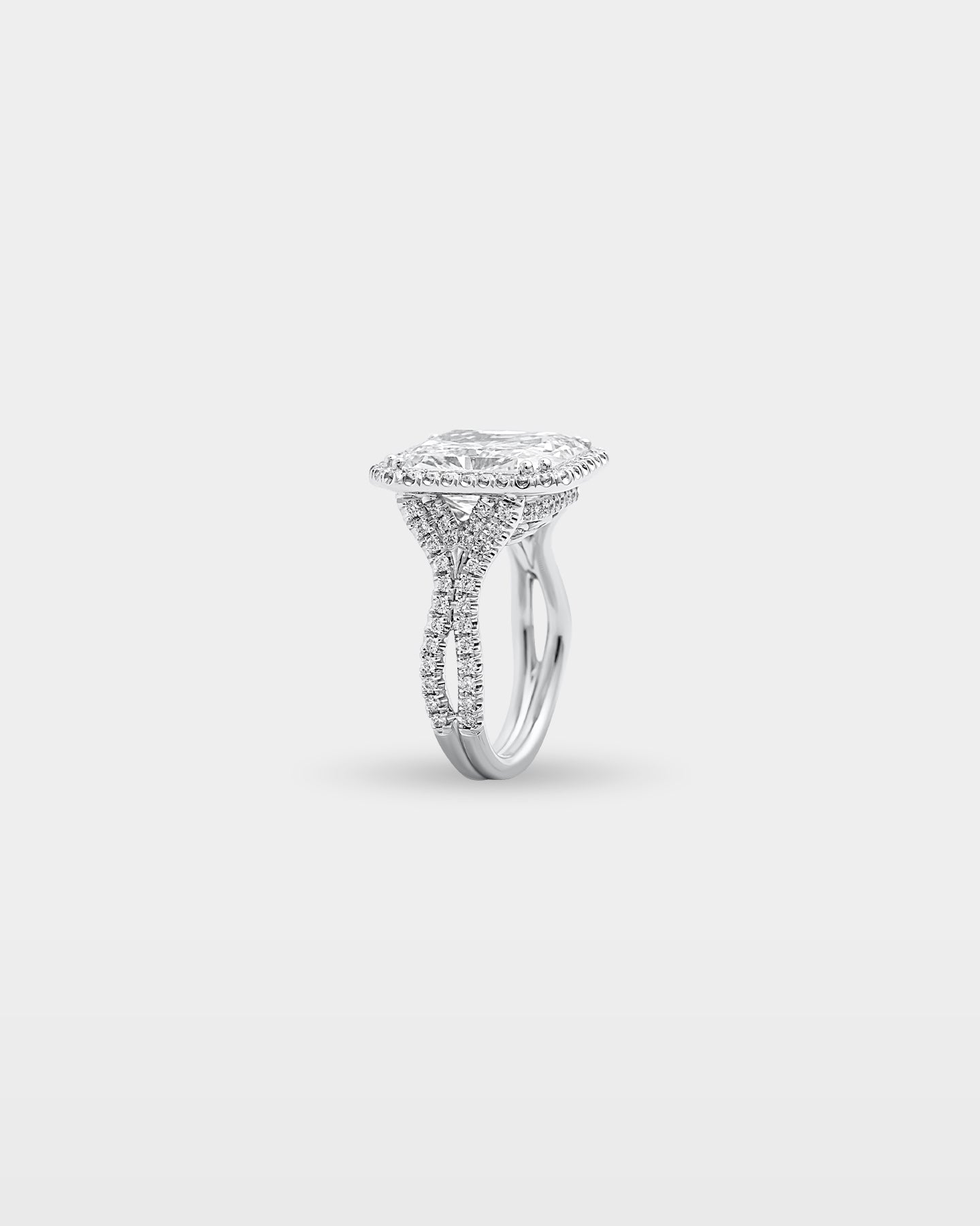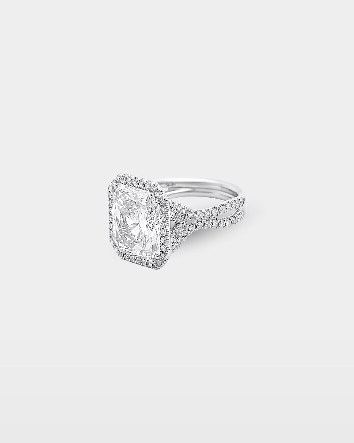 The bold geometry of a radiant-cut diamond meets the fluid sparkle of a split shank diamond band in this platinum design. The halo adds dimension, making it ideal for stacking alongside diamond jewelry and classic metals. A platinum ring that moves seamlessly from business settings to dinner plans.