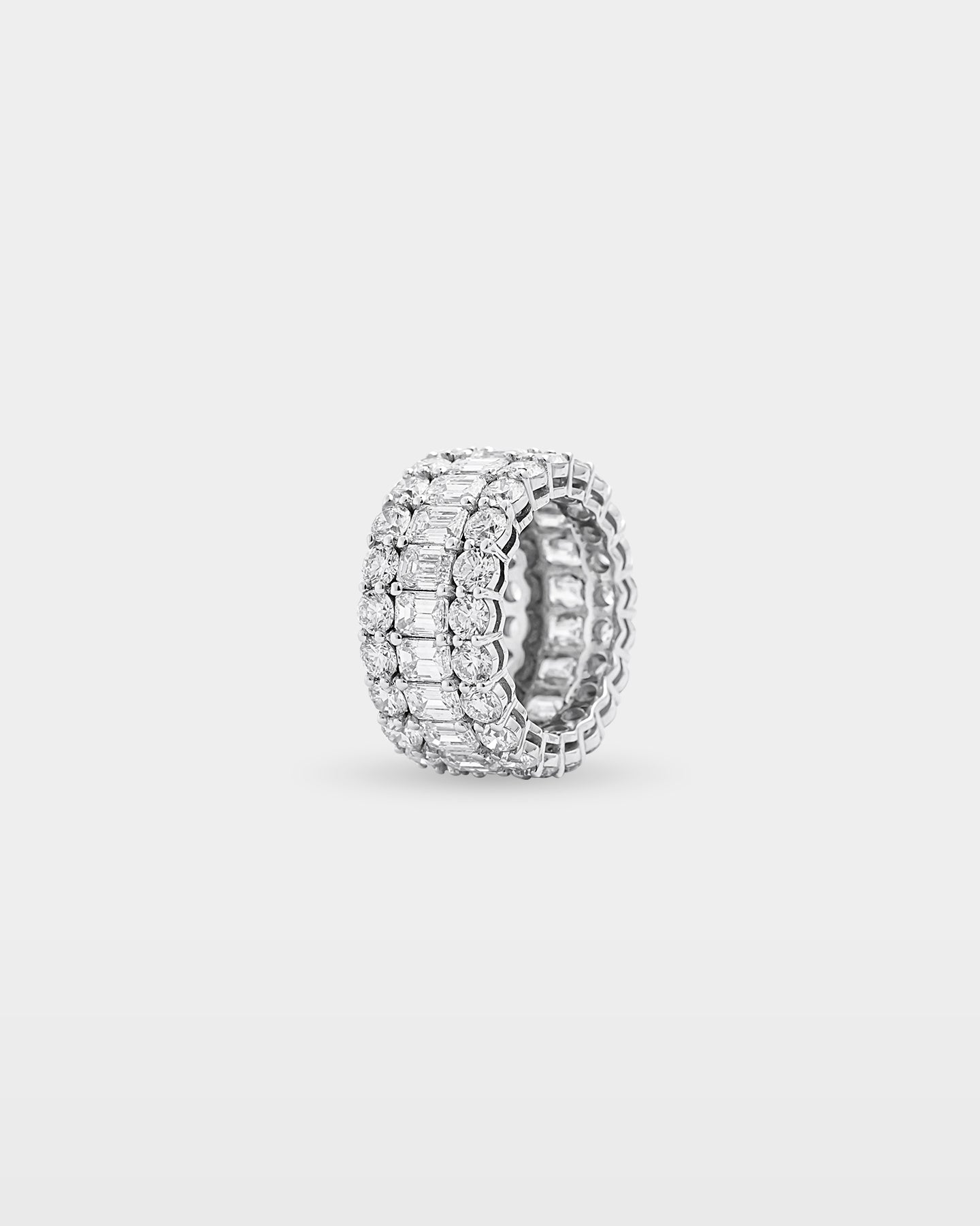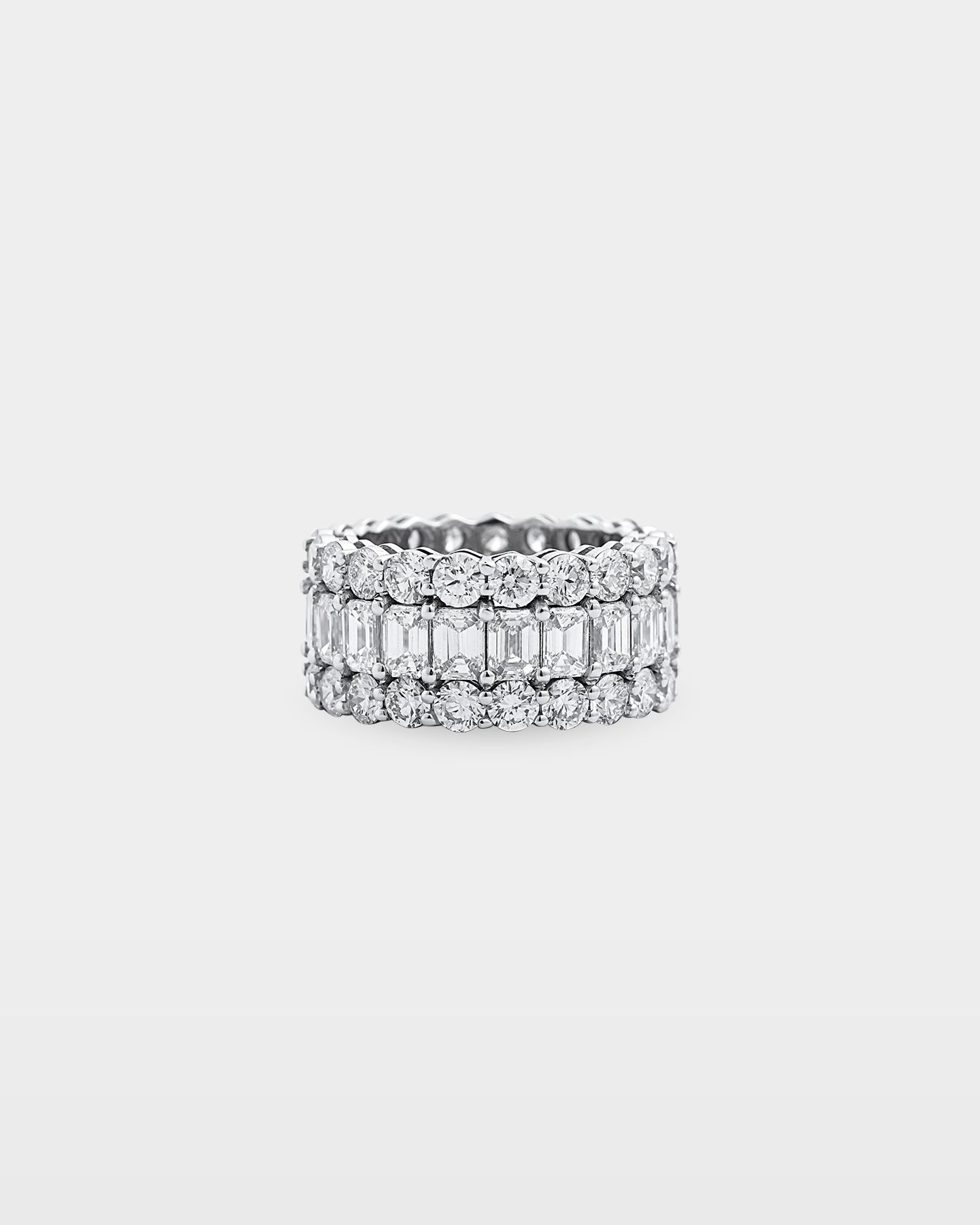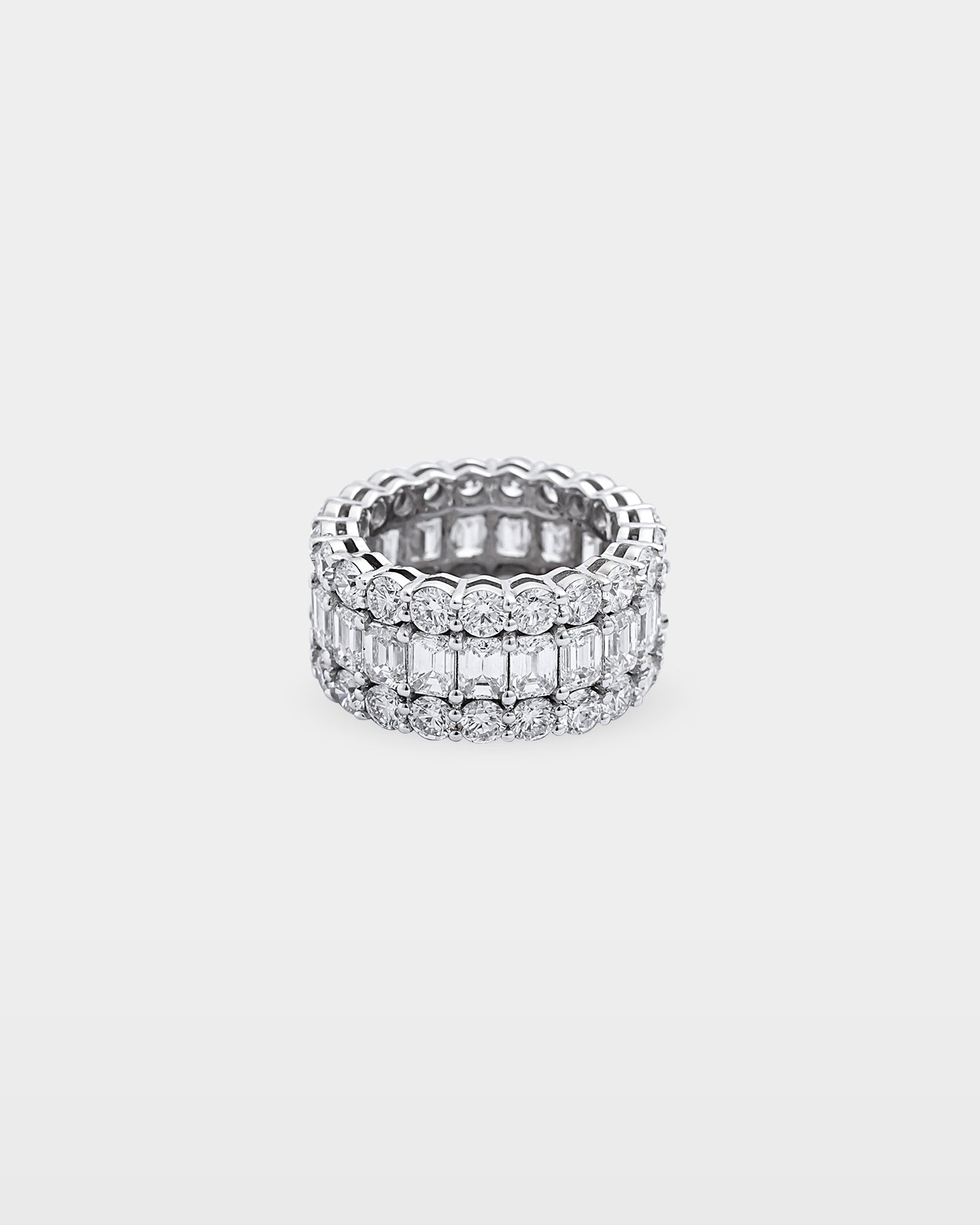 Crafted in 18k white gold, this triple-row diamond band is a statement of pure confidence. Mixed diamond shapes bring texture and balance. Style this diamond ring with a beaded bracelet stack or diamond hoops for a refined yet powerful finish.