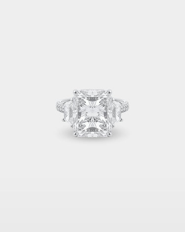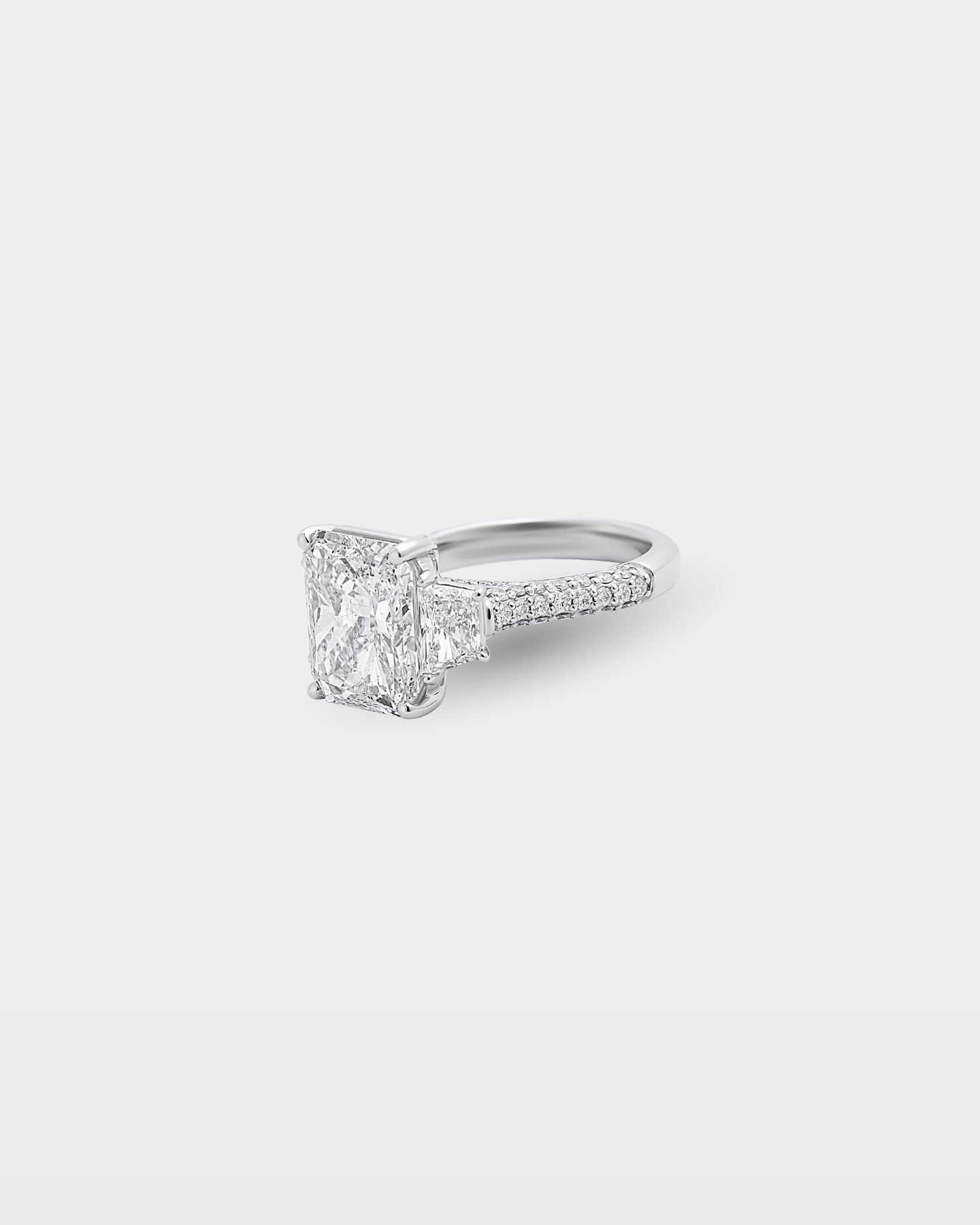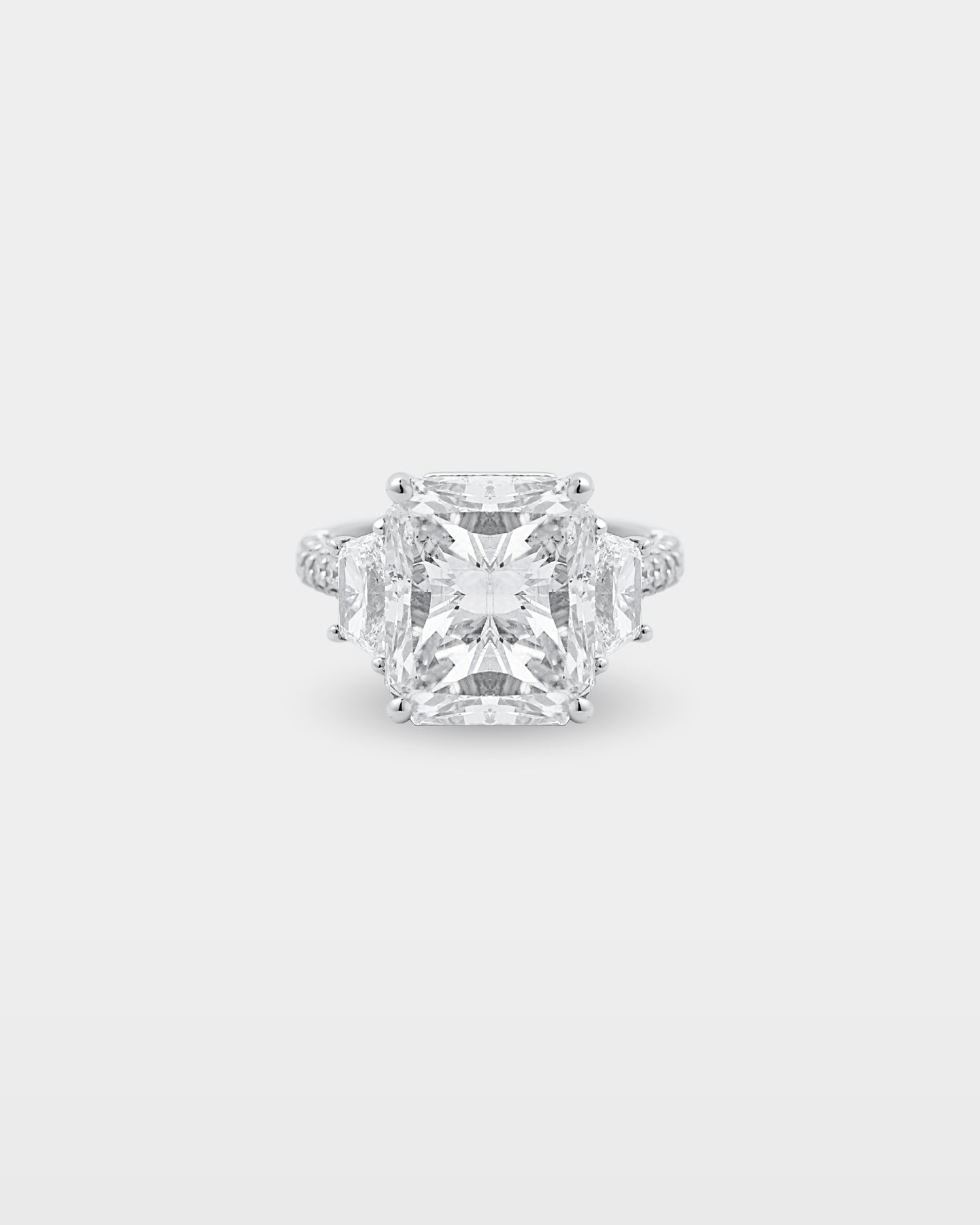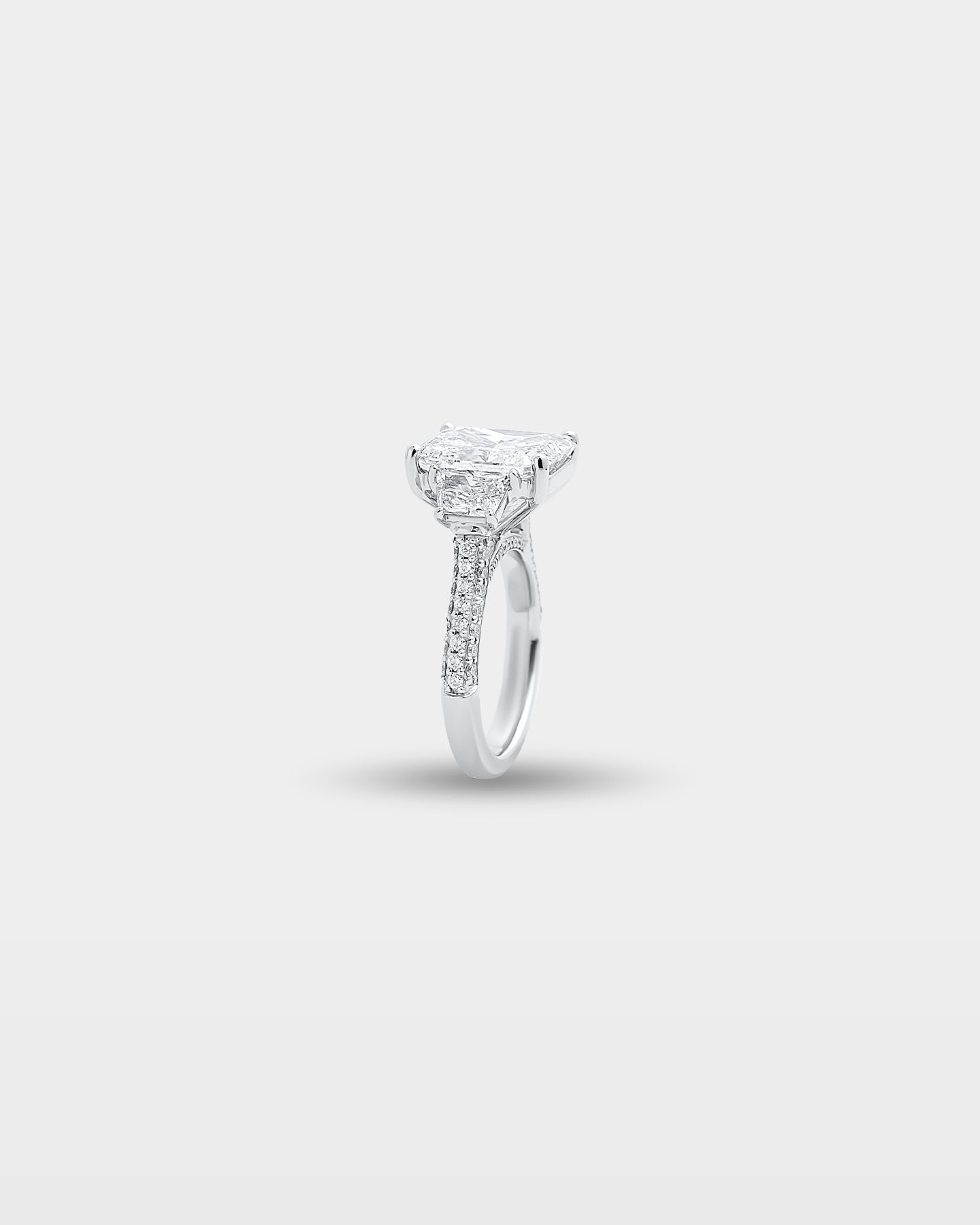 A mixed-cut trio of diamonds sits perfectly across a platinum band lined with delicate accent stones. The clean geometry and refined proportions make it ideal for pairing with gold chains, diamond studs, or huggie hoops. Designed for those who favor understated luxury with lasting impact.