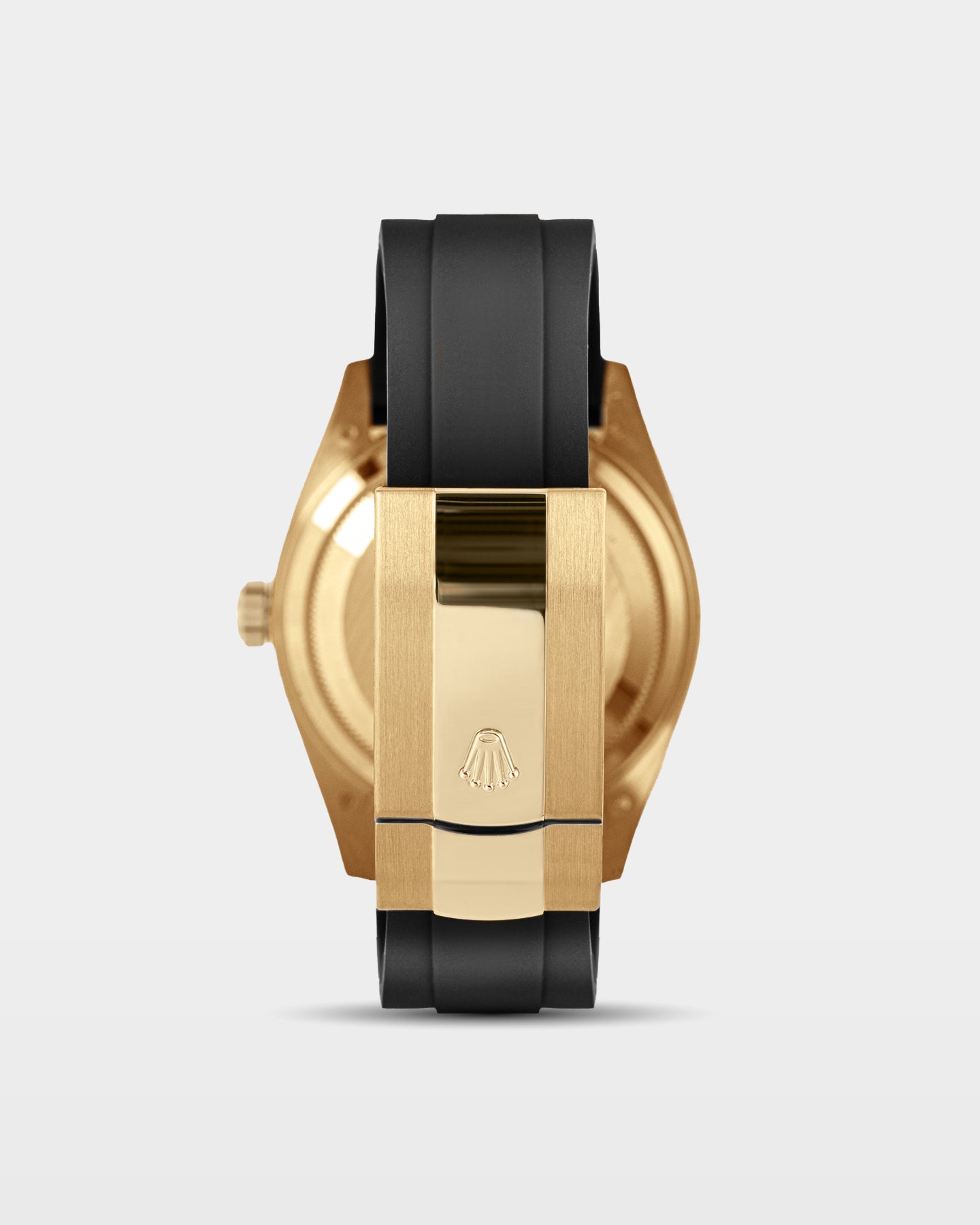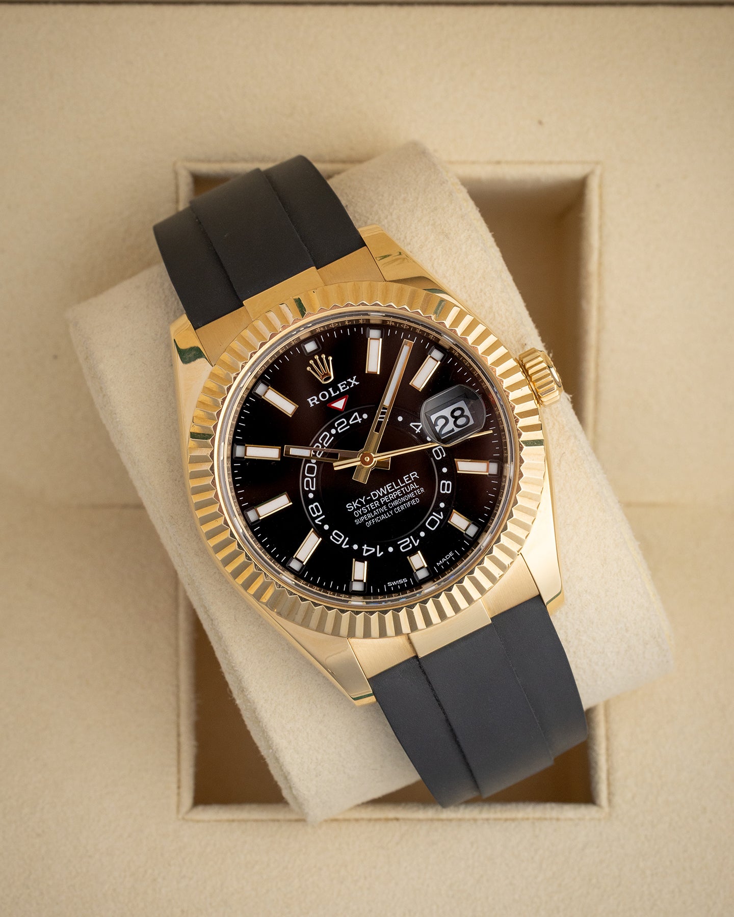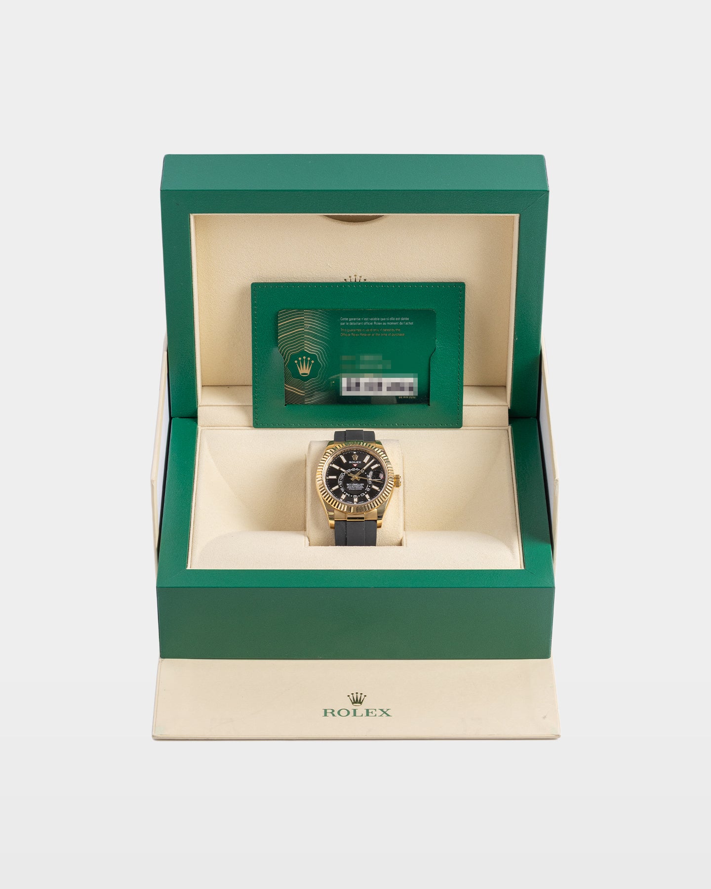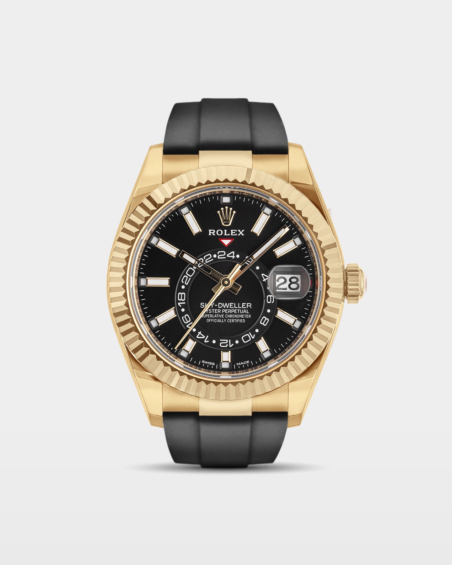 The Sky-Dweller 326238 proves that technical sophistication can look relaxed. Its 42mm case in solid yellow gold feels bold and the fluted bezel doubles as the control ring for the dual-time and annual calendar setup. The black dial offers crisp contrast and luminous legibility. Inside, the Caliber 9001 handles everything with Rolex’s usual precision. Finished on a black Oysterflex bracelet, this Rolex watch is equal parts traveler’s companion and statement piece.
