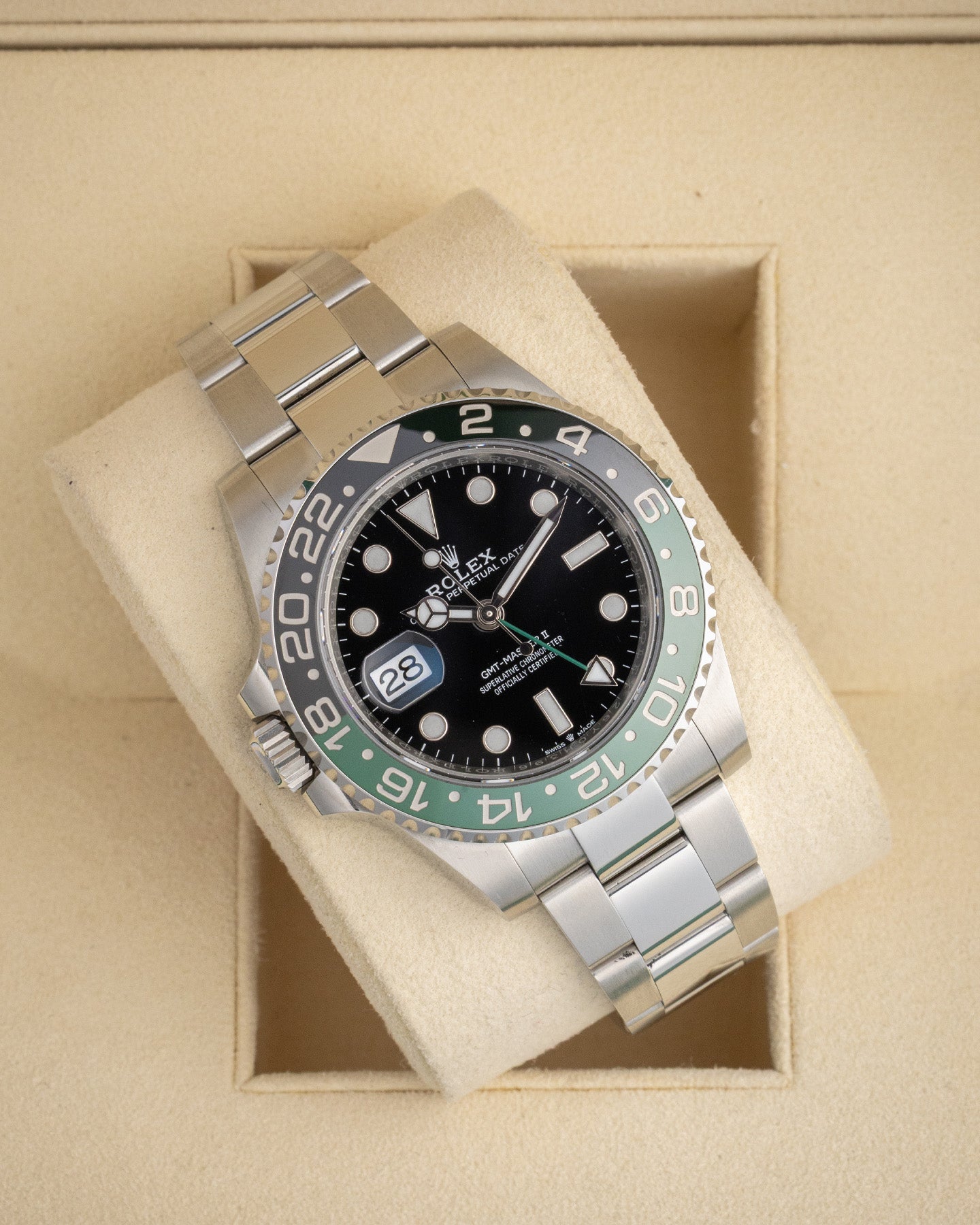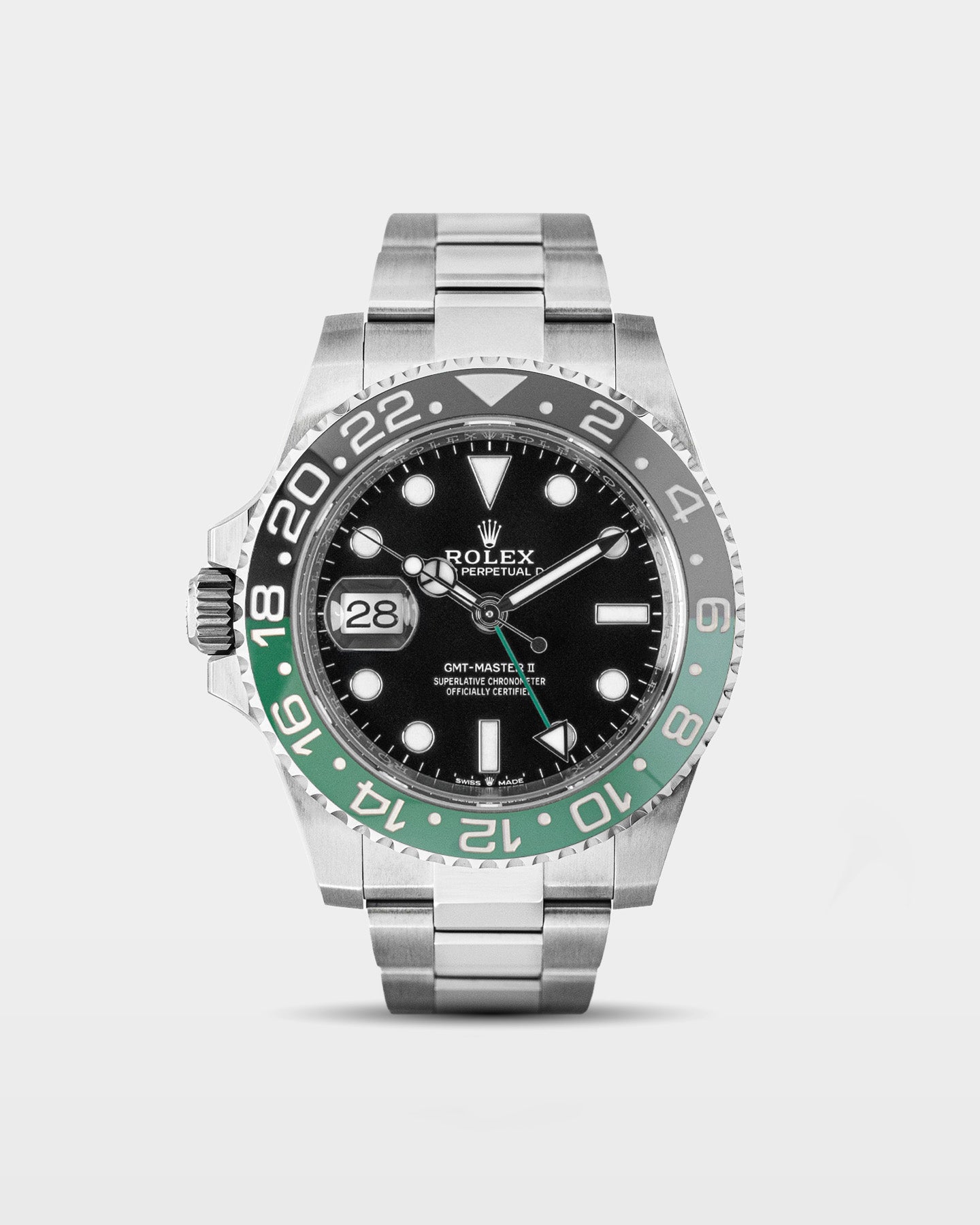 The GMT-Master II 126720VTNR takes one of the brand’s most recognizable designs and flips it. The crown and date window sit on the left side, giving this 40mm steel watch a subtle twist without losing its familiar balance. The green-and-black ceramic bezel, giving it the "Sprite" nickname, is paired with a green GMT hand, keeping things playful but refined. Inside, the Caliber 3285 offers 70 hours of precision power. A Rolex watch that adds just enough edge while staying true to its roots.