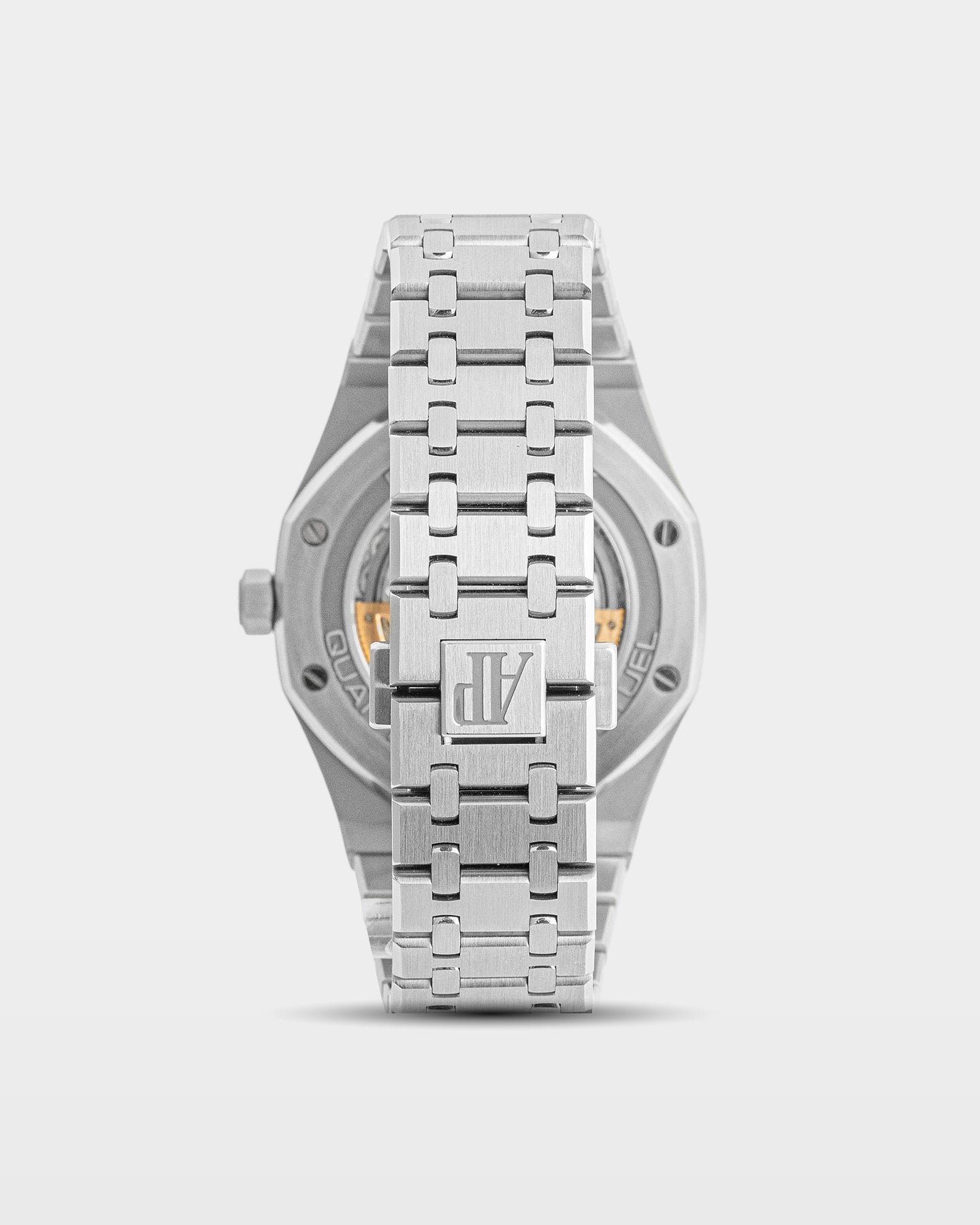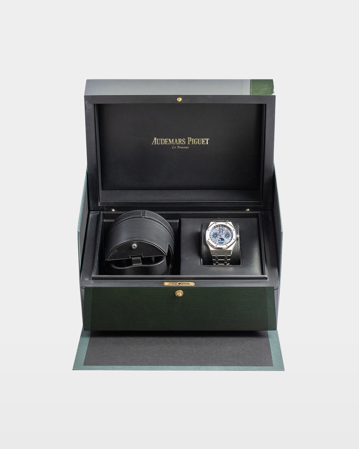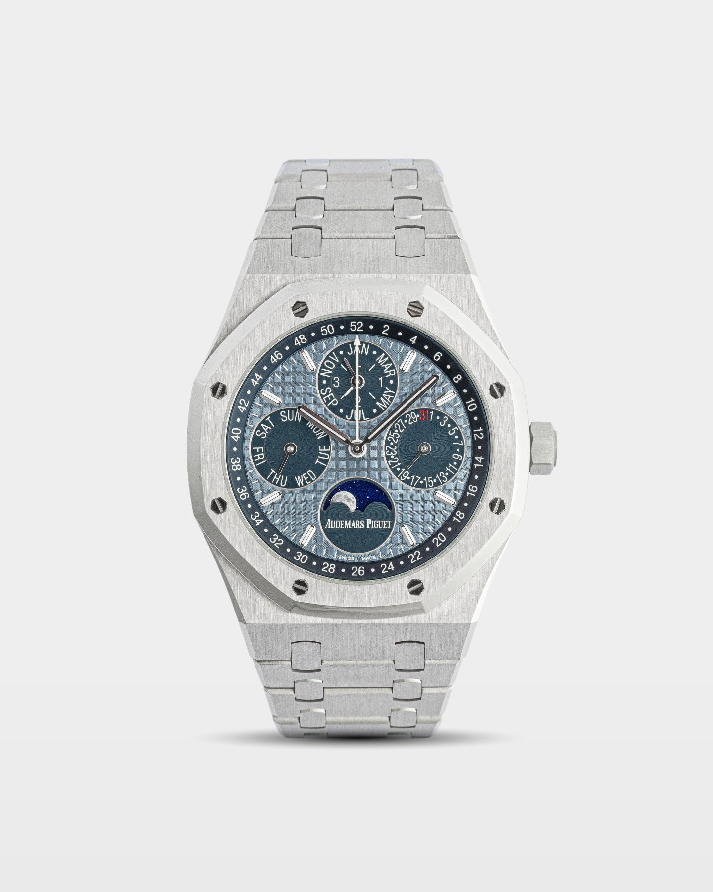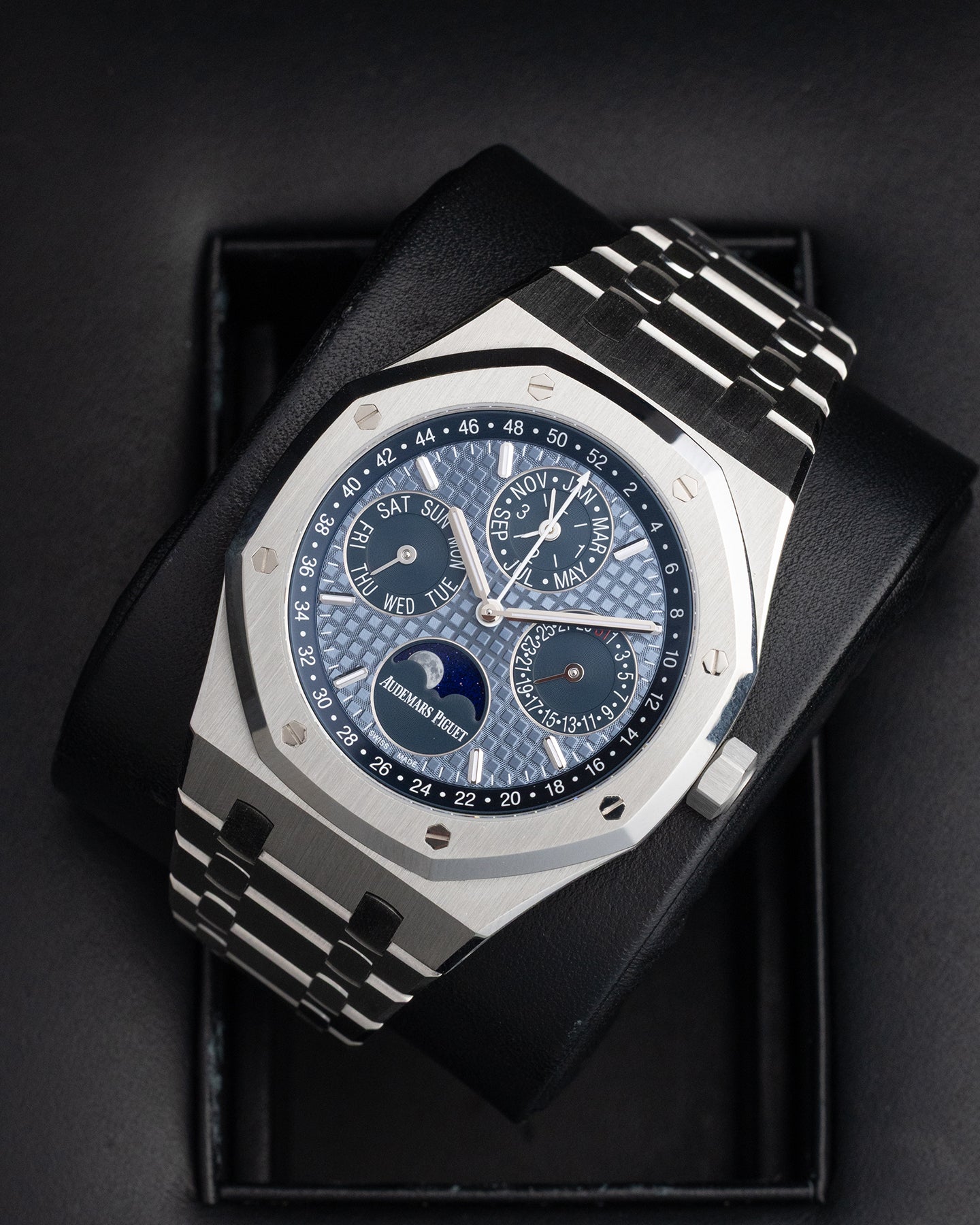 The Royal Oak Perpetual Calendar 26574ST is where high complications meet iconic sport watch design. Housed in a 41mm steel case with an instantly recognizable octagonal bezel, it features a stunning blue “Grande Tapisserie” dial with white gold hour markers and lumed Royal Oak hands. Inside, the self-winding Calibre 5134 powers an impressive perpetual calendar showing day, date, month, leap year, moon phase, and week of the year—all wrapped up in an integrated steel bracelet. This Audemars Piguet watch blends technical mastery with everyday sport watch versatility.