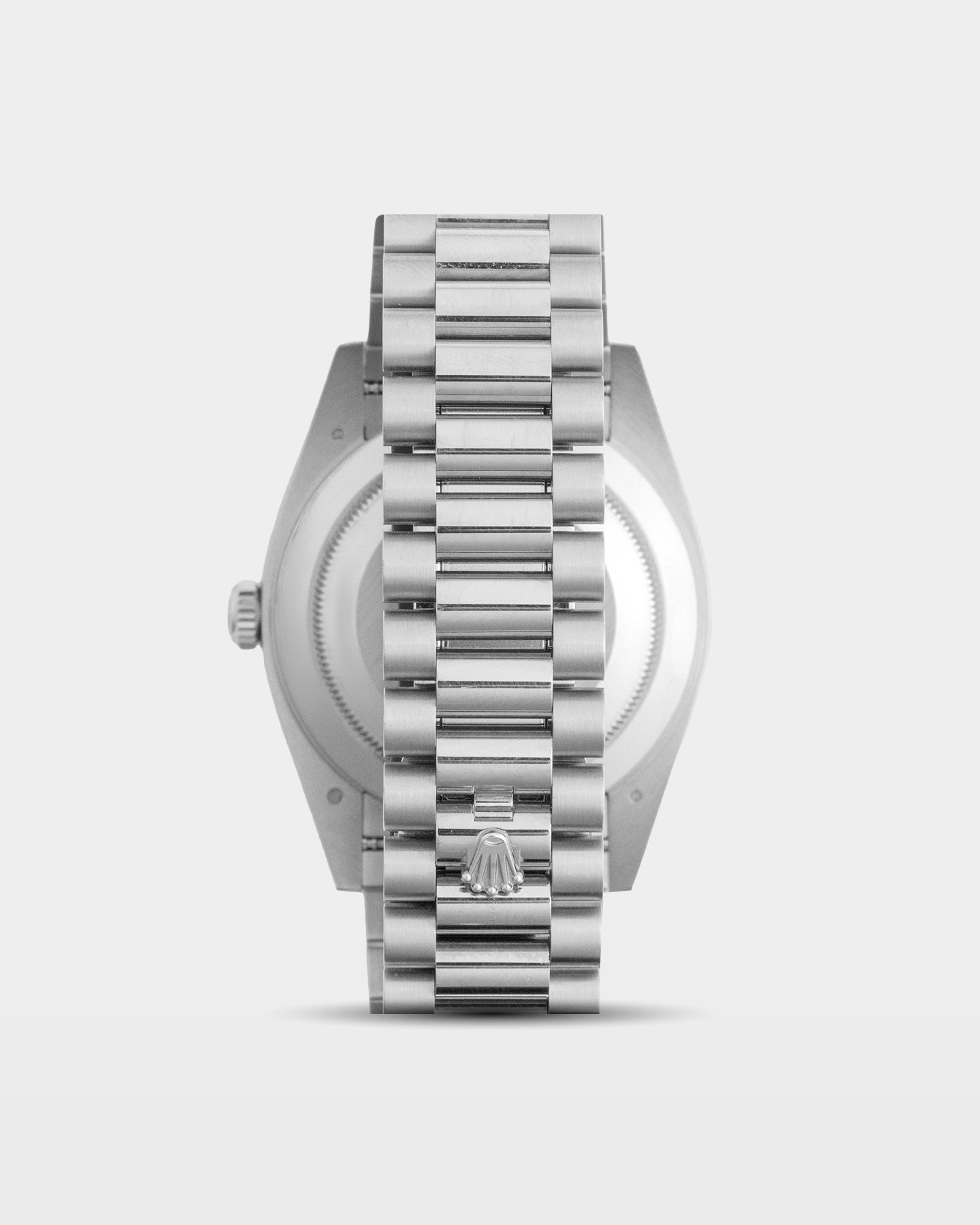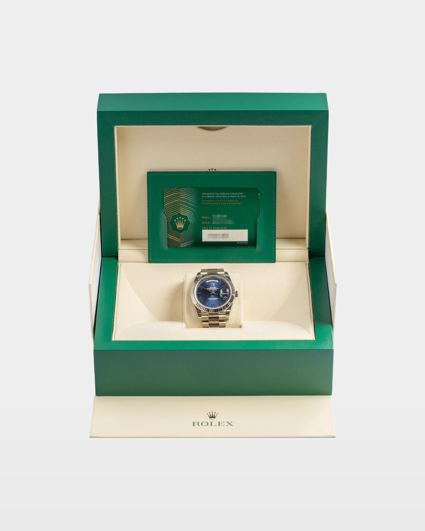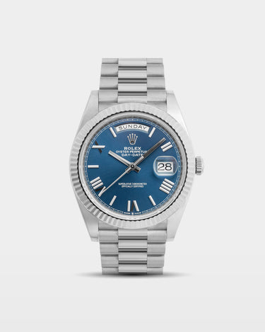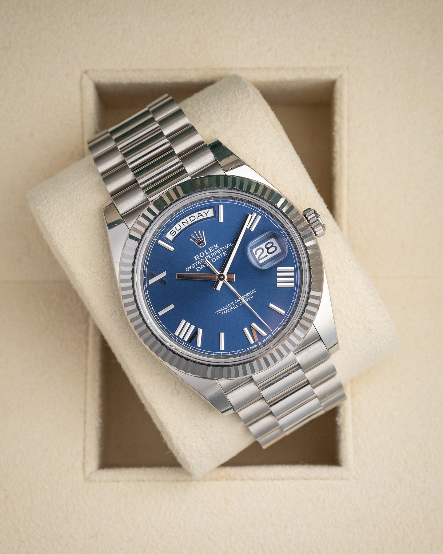 The Day-Date 228239 is what happens when Rolex builds a dress watch with presence. It’s 40mm of solid white gold, capped with a fluted bezel that catches just enough light. The sunray blue dial gets Roman numerals and the signature double aperture for day and date. Inside is the Rolex calibre 3255, a modern automatic movement with power for up to 70 hours. Paired with the classic President bracelet, this is a Rolex watch feels at home in just about any room.