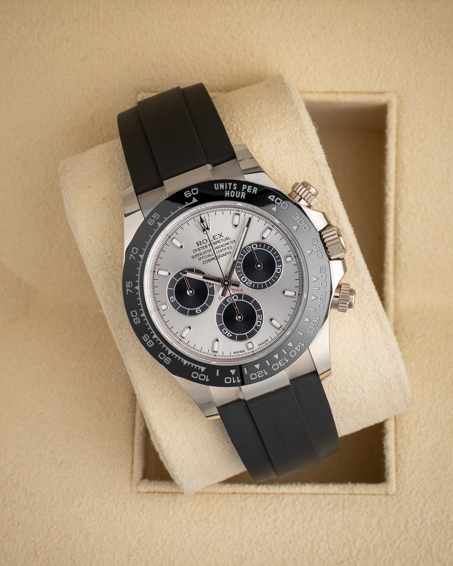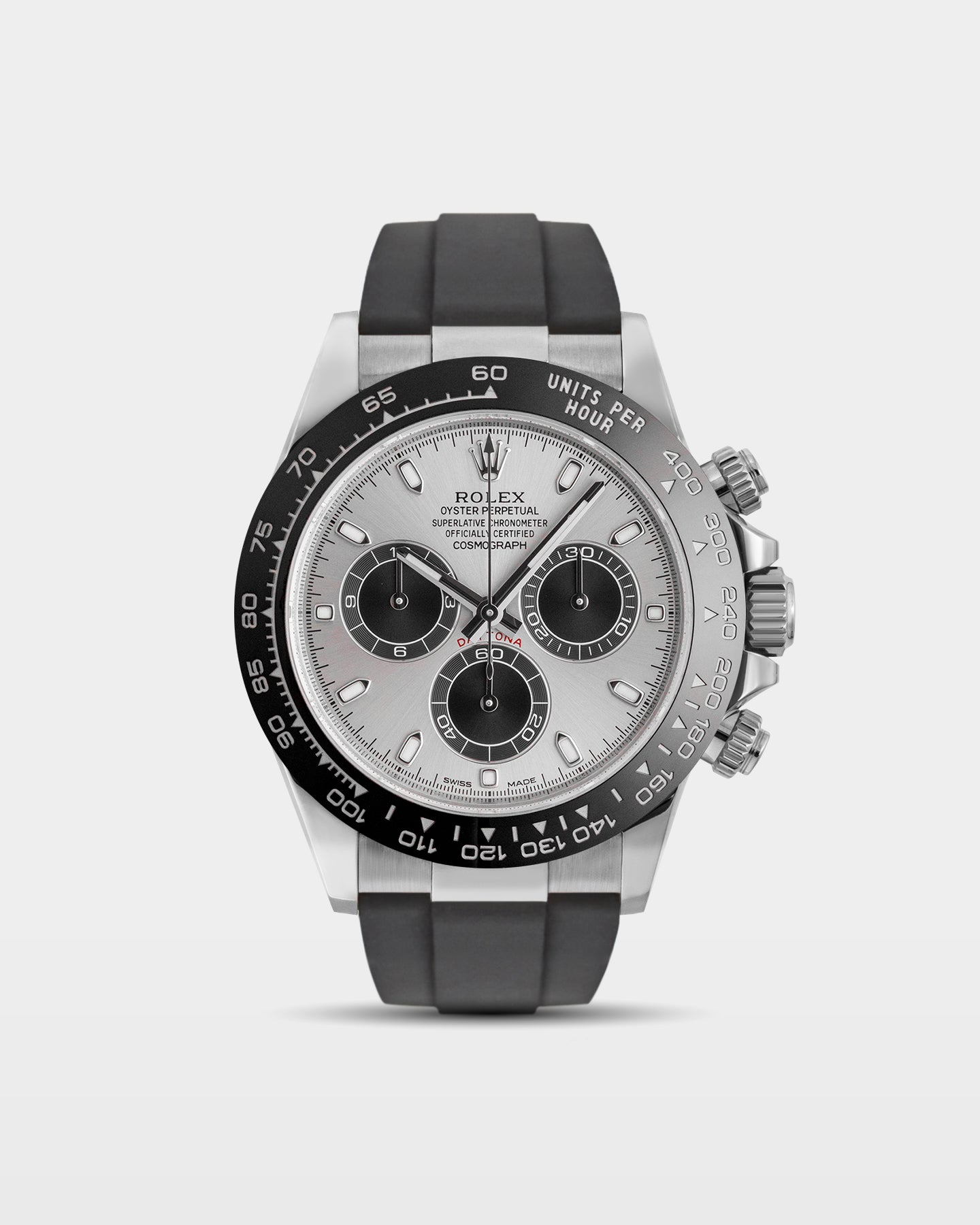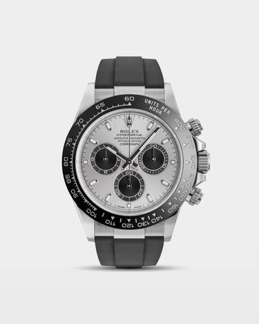 The 40mm Rolex Daytona 116519LN skips the steel and goes straight to white gold, but keeps things grounded with a black Oysterflex strap and ceramic bezel. The light grey dial, often called the "Ghost", plays perfectly against the black subdials and tachymeter scale. Inside is the caliber 4130, known for its reliability, precision and 72-hour power reserve. For a sport watch that quietly flexes serious credentials, this is one of the more interesting Daytona models in the lineup.