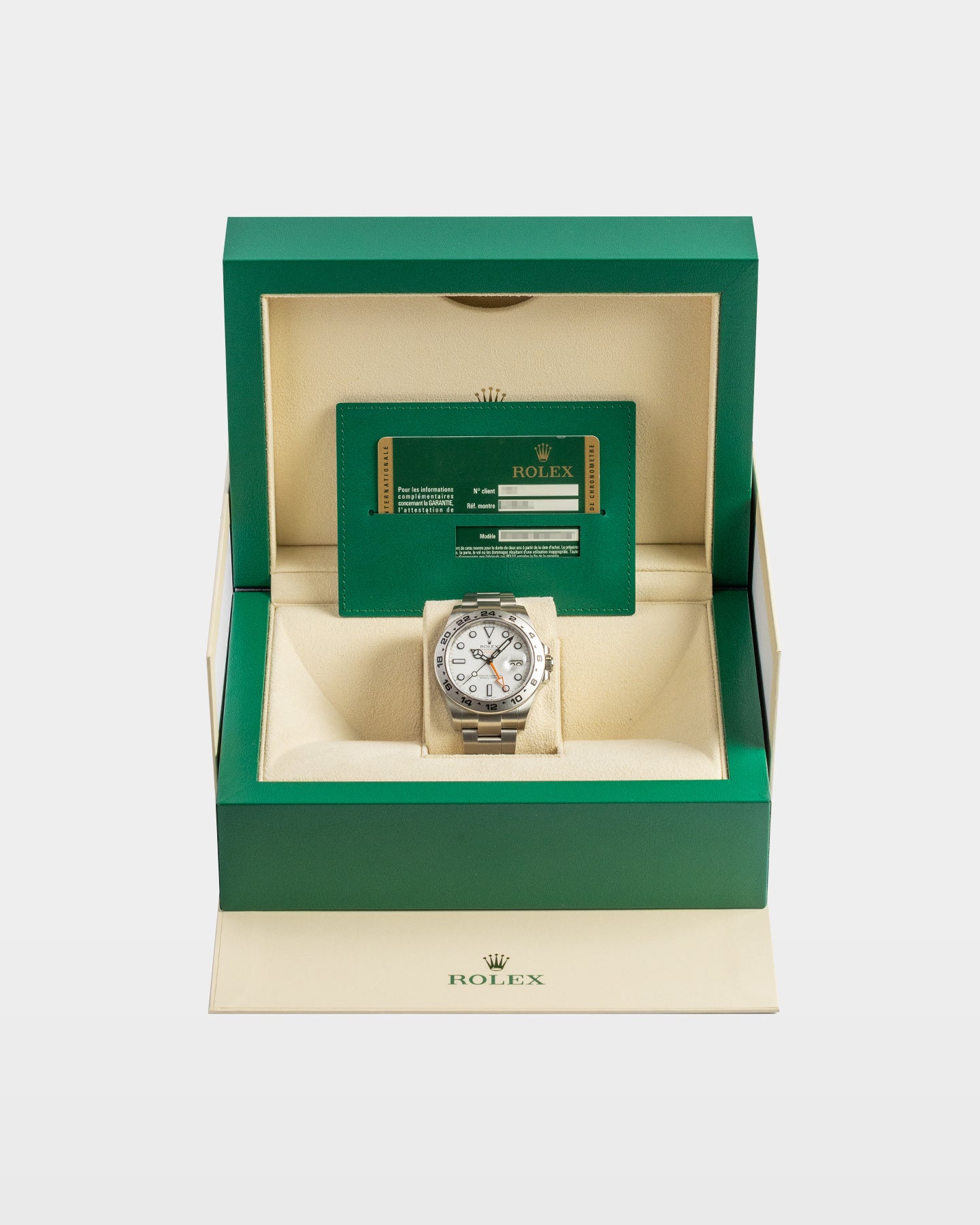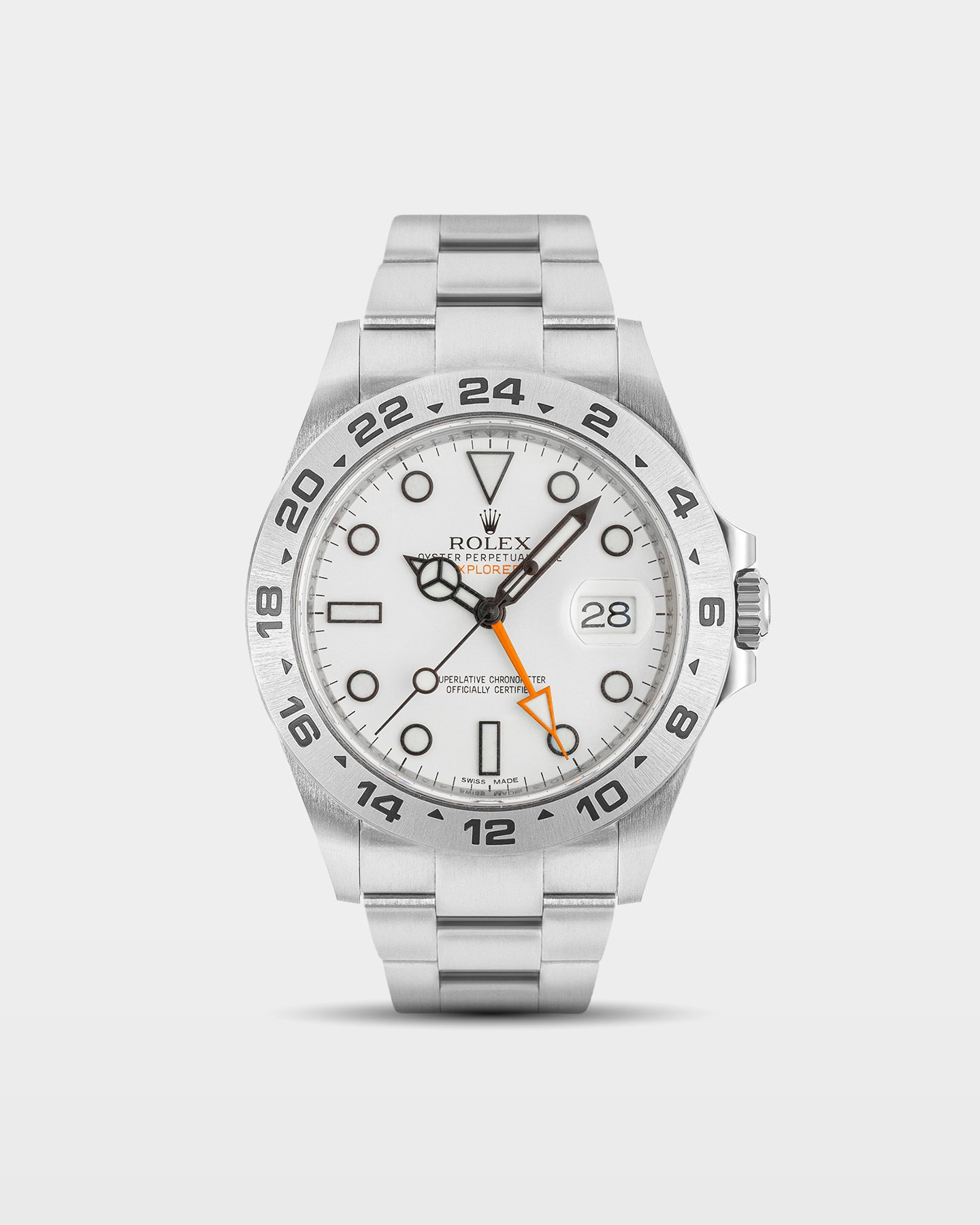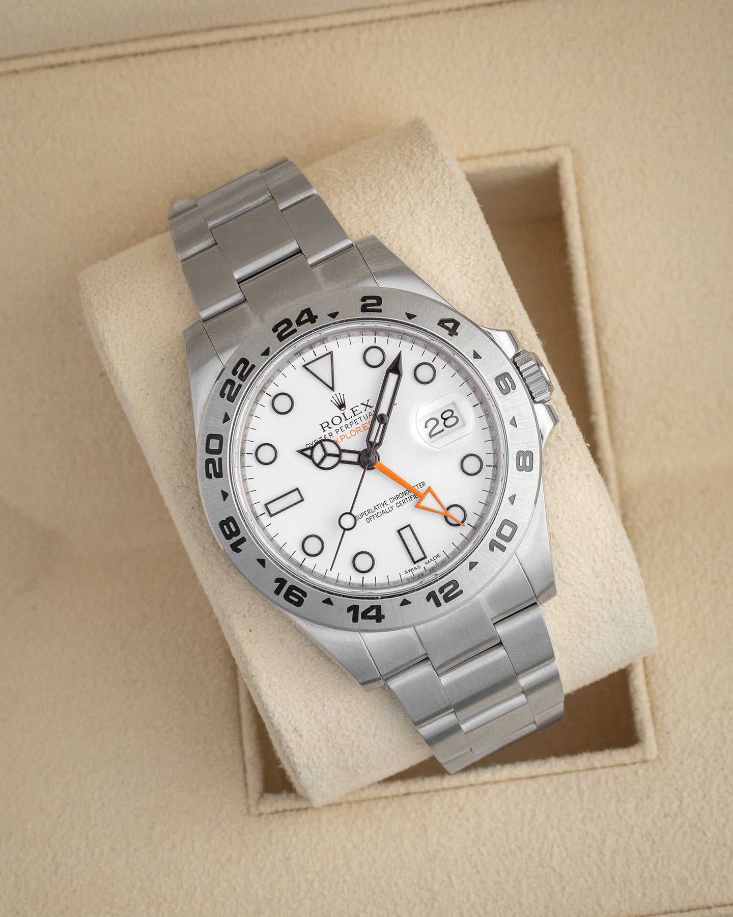 There’s something timeless about the Rolex Explorer II 216570, especially in this Polar dial variant. The crisp white face pops against the 42mm steel case and bracelet and the oversized orange GMT hand adds just enough character. Inside, the 3187 movement handles dual time zone tracking with ease. Designed for explorers and adventurers, this Rolex watch has become a modern tool watch classic, worn far beyond the cave or ice cap.