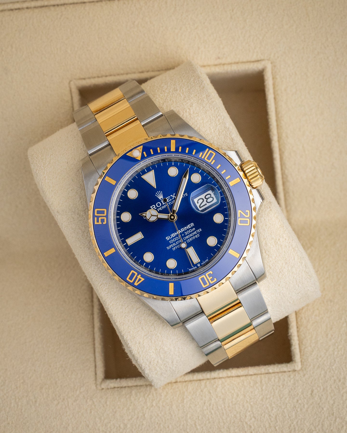 The Rolex Submariner Date 126613LB, often called the “Bluesy,” merges iconic Submariner design with precious metal accents. Featuring a 41mm Oystersteel and yellow gold case, a sunray-finish blue dial and a blue ceramic bezel, it is one of the most distinctive Rolex watches in current production. The 3235 movement delivers 70 hours of power reserve and COSC-certified performance. A sport watch built for underwater exploration but equally suited to formal wear.