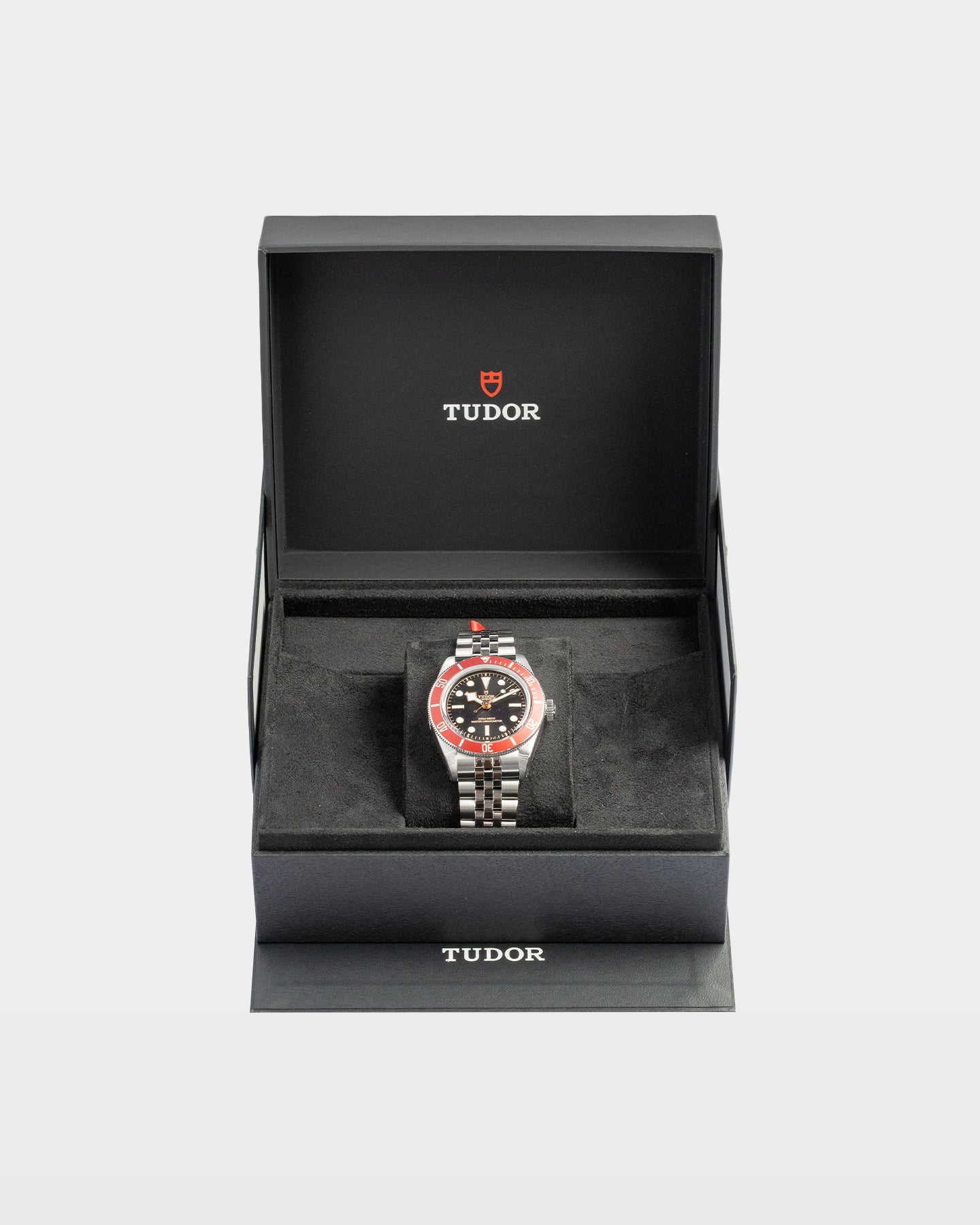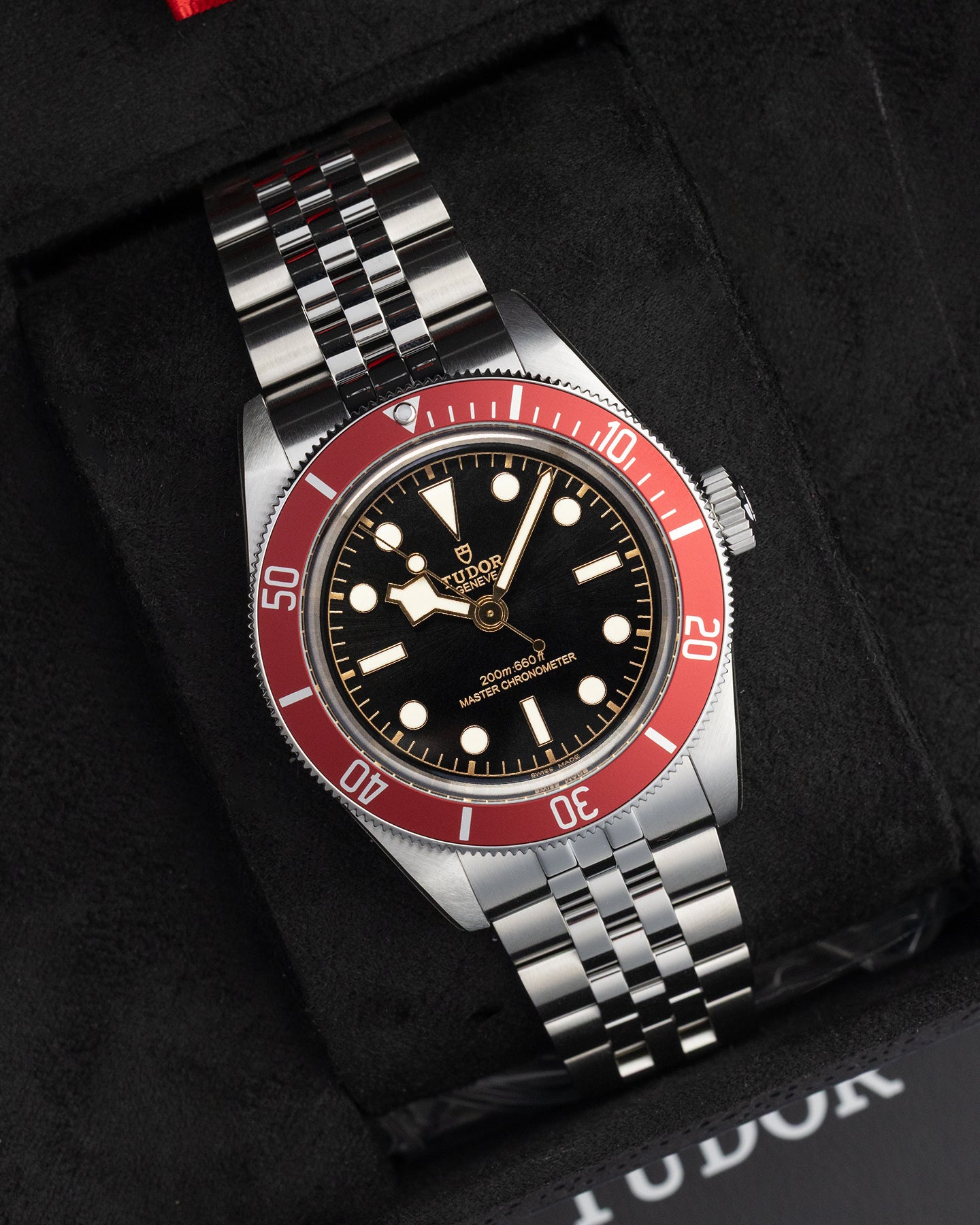 With the Black Bay 41 M7941A1, Tudor leans into utility without sacrificing style. The black dial is simple but elevated, framed by a burgundy aluminum bezel that gives just the right amount of character. Luminous gold-toned hands and markers keep things clear in low light. At 41mm, the case feels purpose-built, and the MT5602-U movement inside delivers up to a 70-hour reserve. This Tudor watch is proof that everyday tools can still have a little soul.