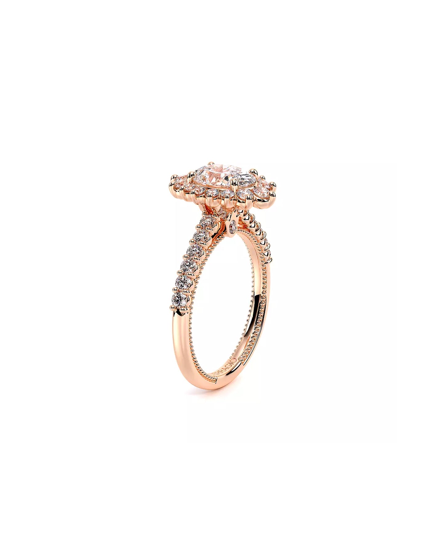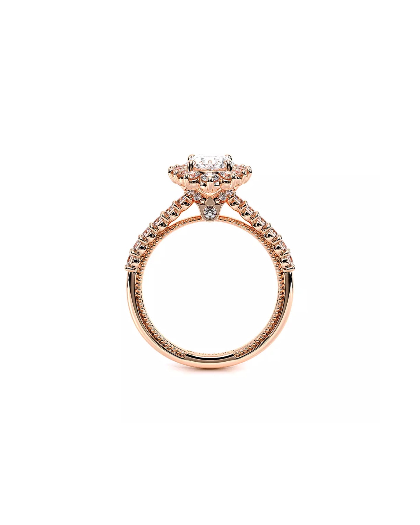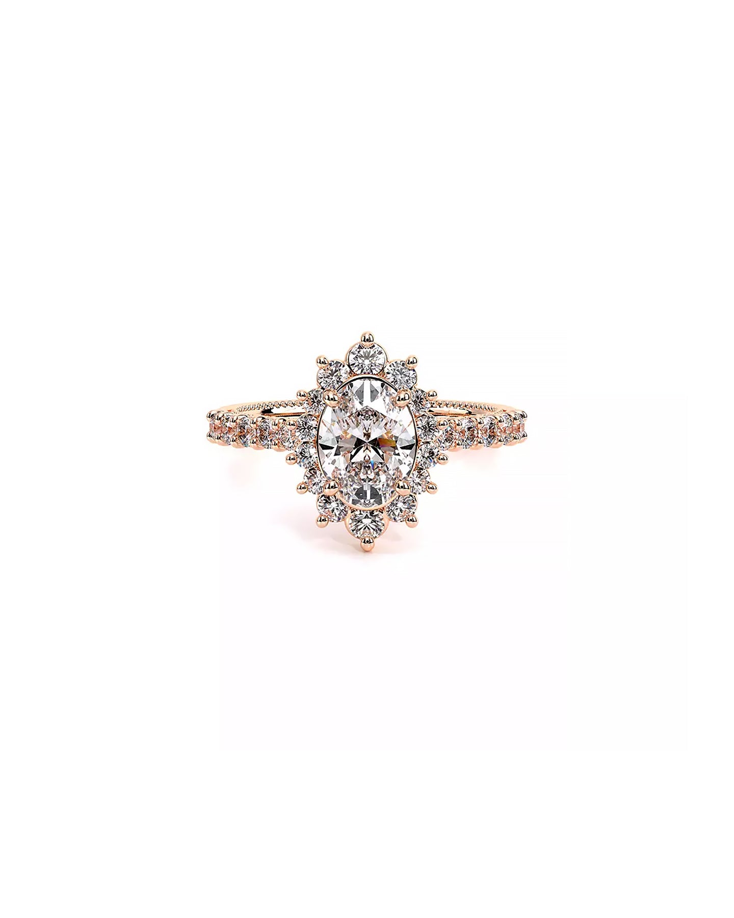 Renaissance-986OV engagement ring features Verragio' s handcrafted Crown halo. Meticulous prong-set round brilliant-cut diamonds sit atop a straight band refined by Verragio' s timeless signature crest and milgrain.